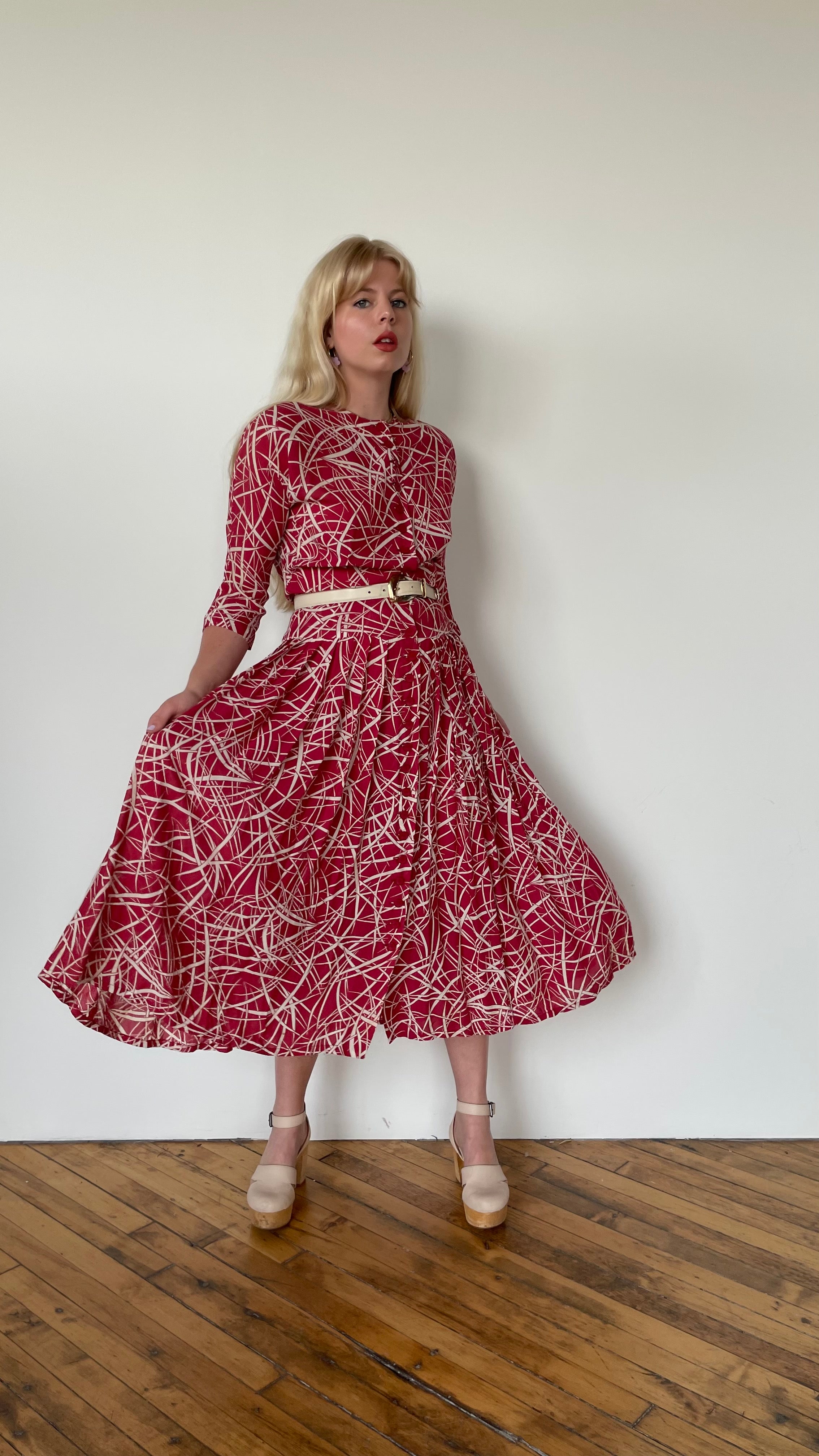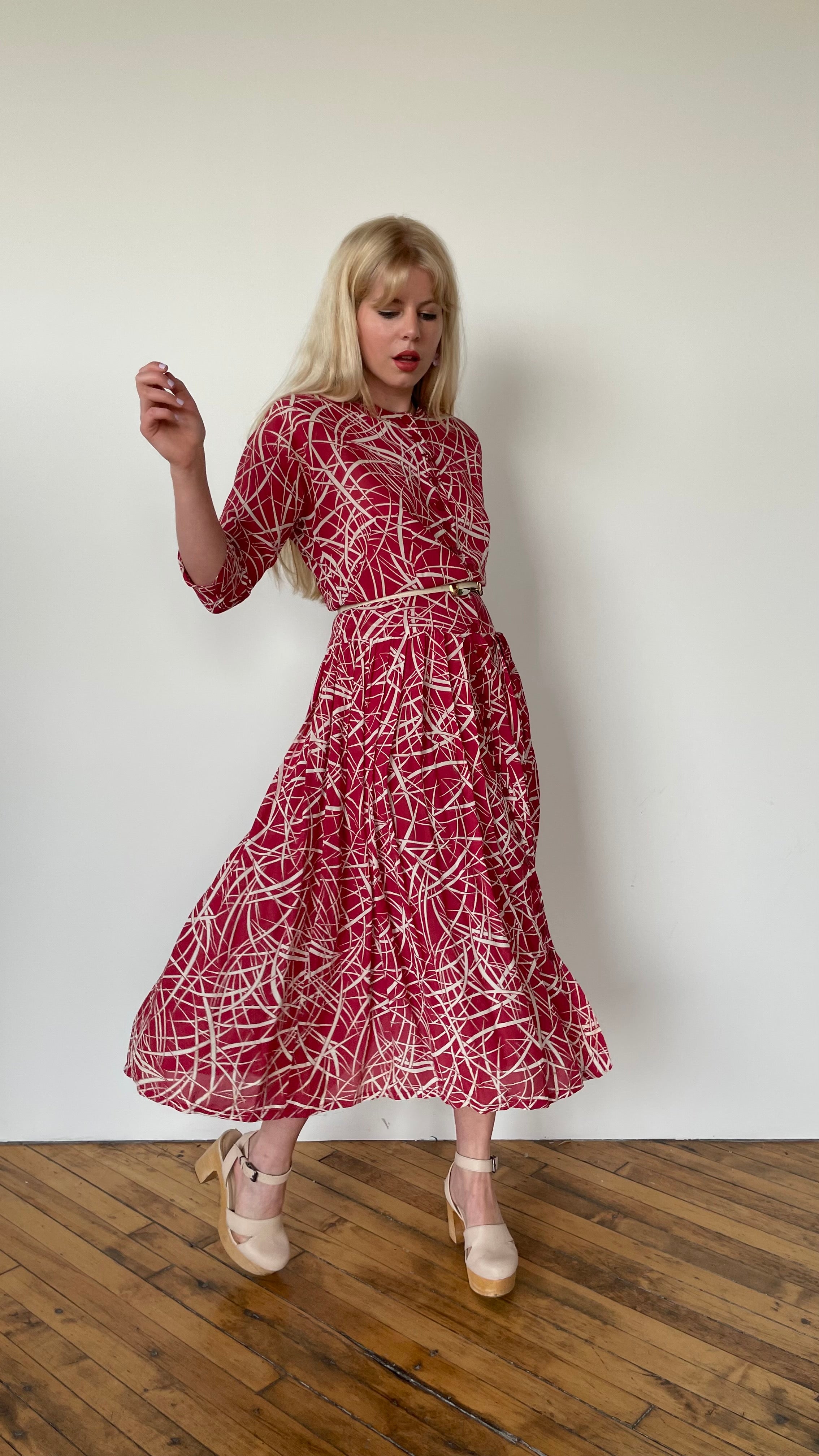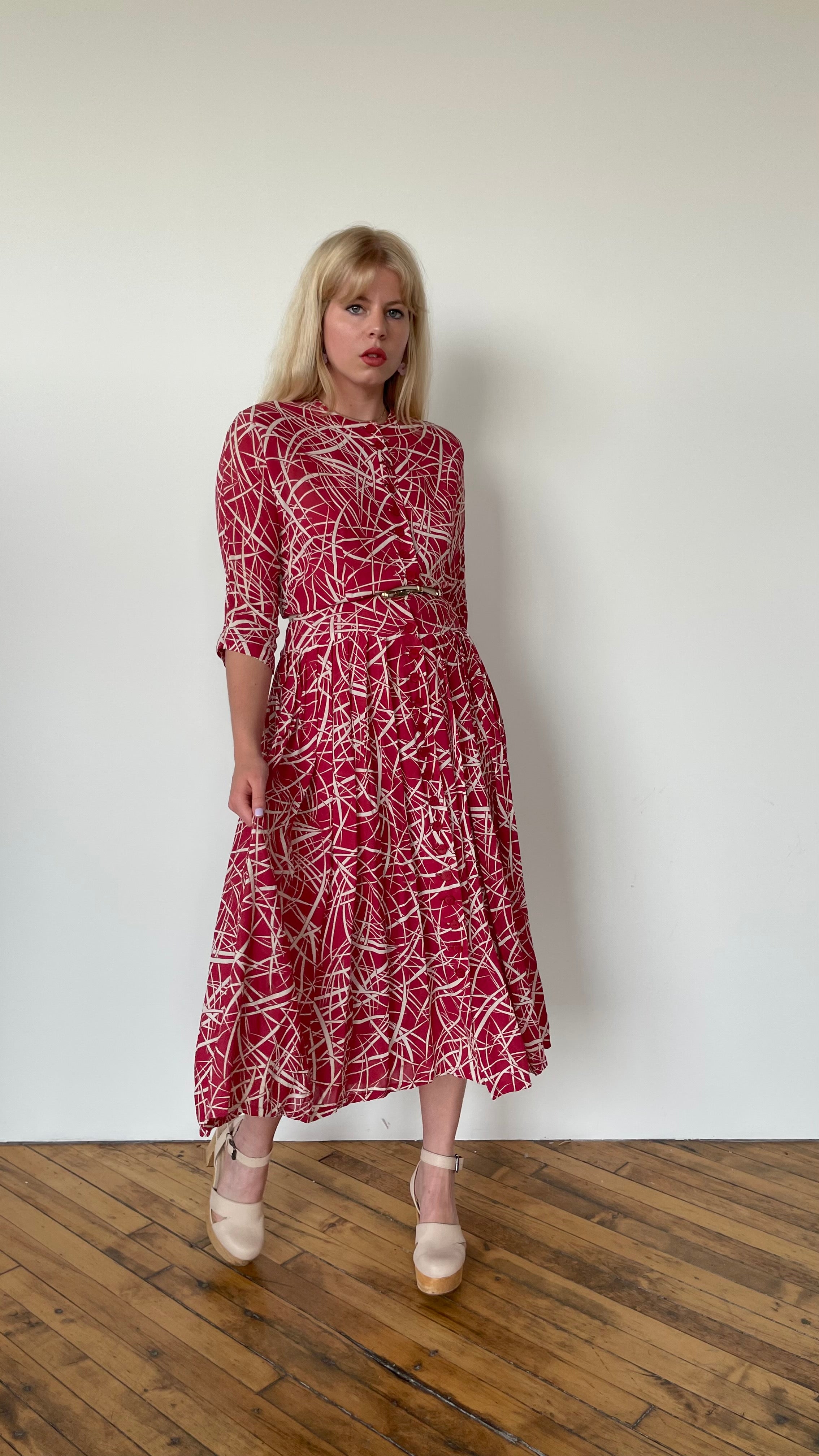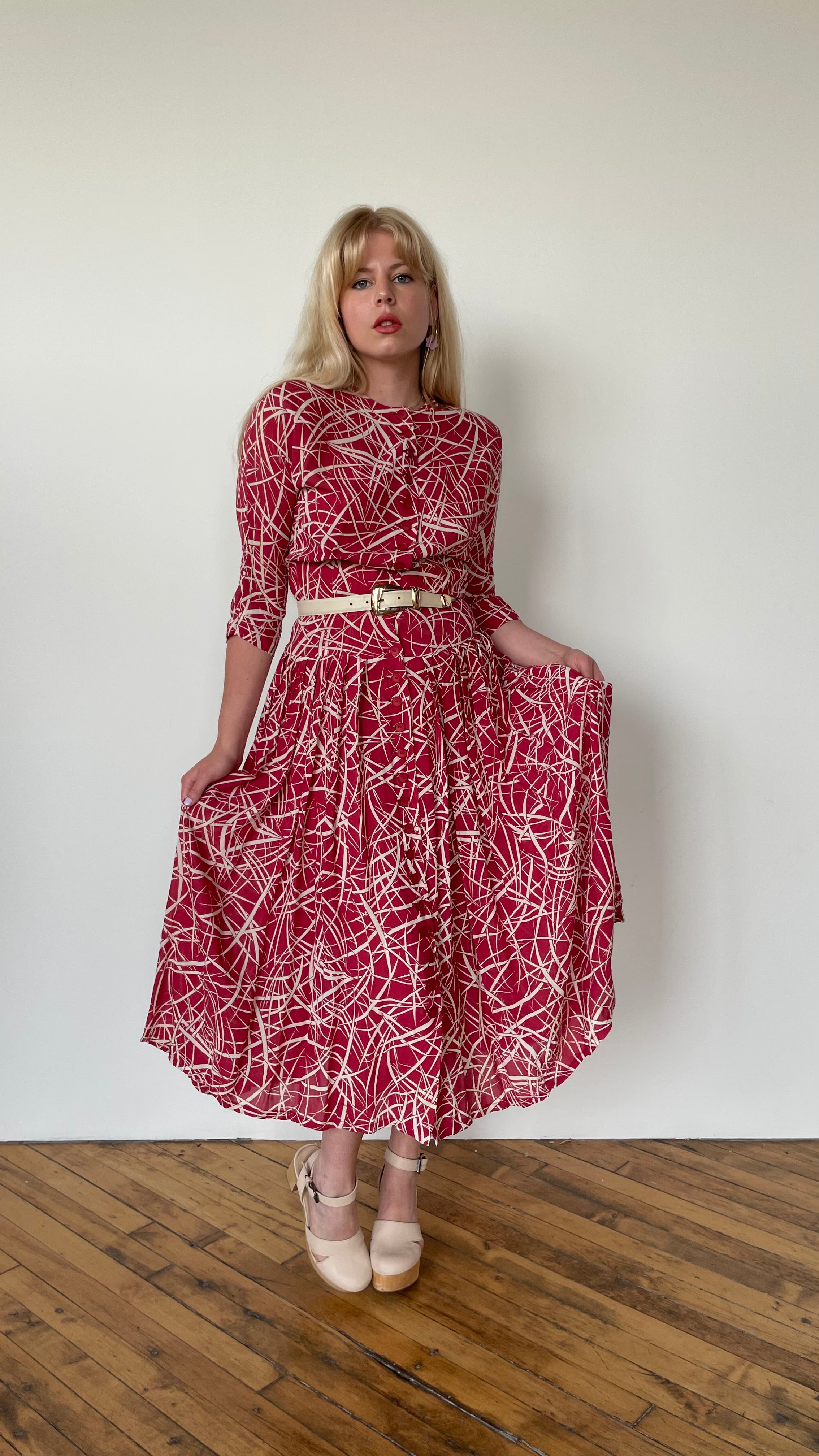 Beautiful semi sheer hazy red with off-white organic overlapping line pattern. Buttons all the way up the front. Slight drop waist silhouette with skirt perfect for twirling. Small shoulder pads. (Belt not included)