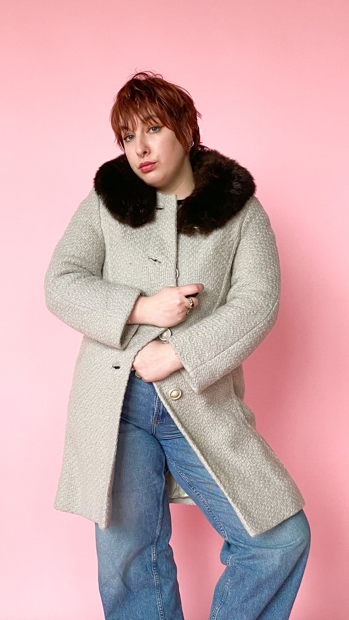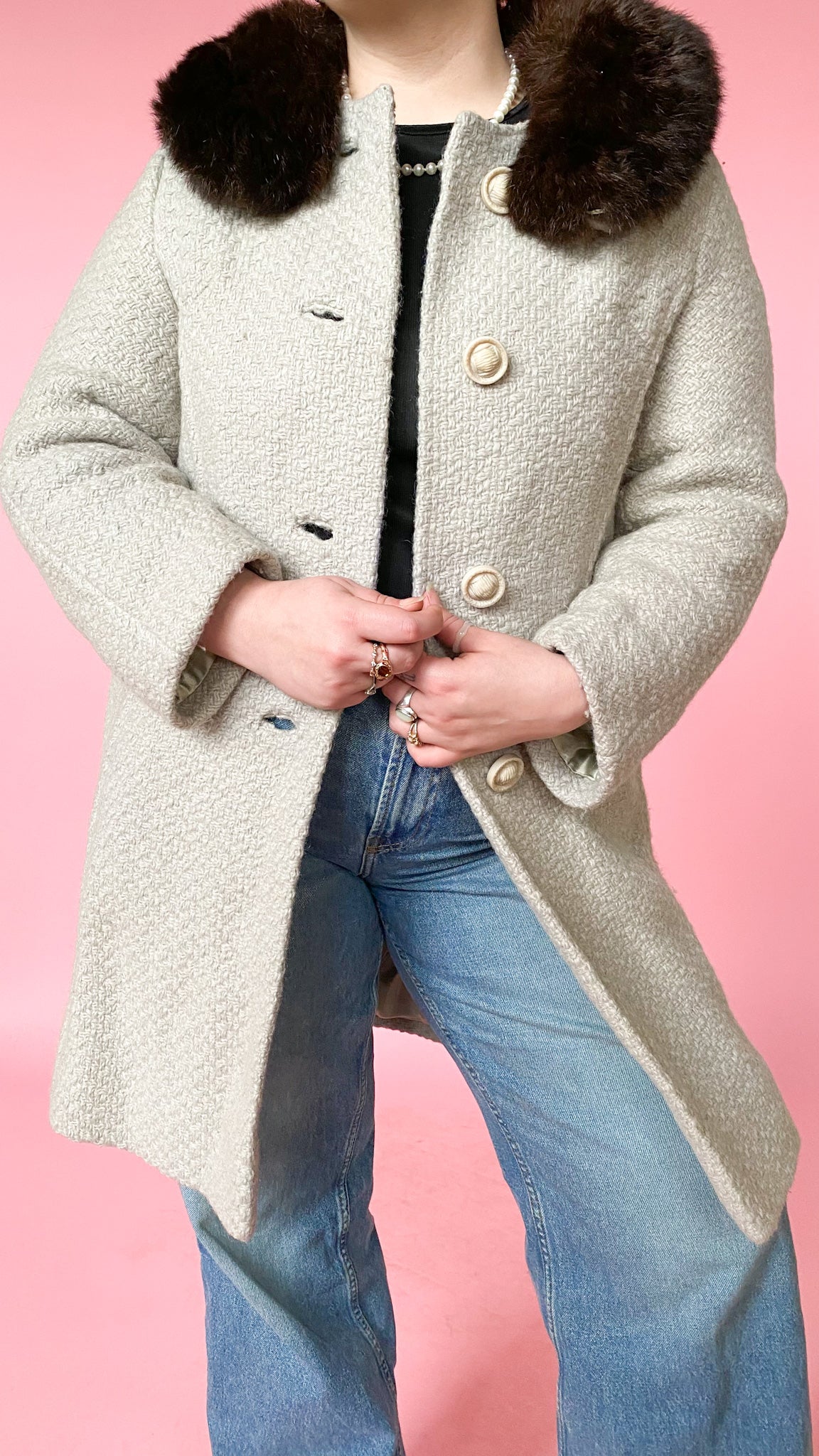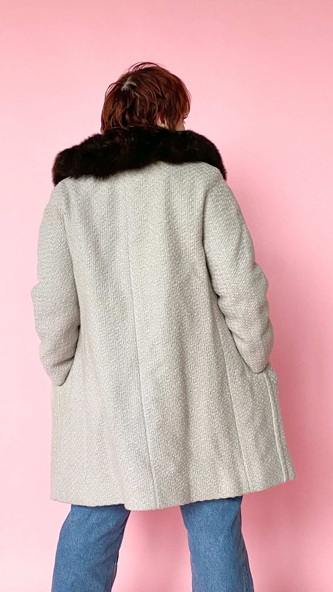 Stunning 1950s light grey tweed midi coat with an espresso brown fur trim collar. Button closure up the front with pockets on both sides.