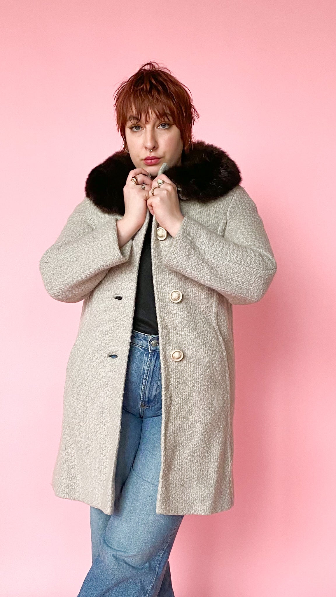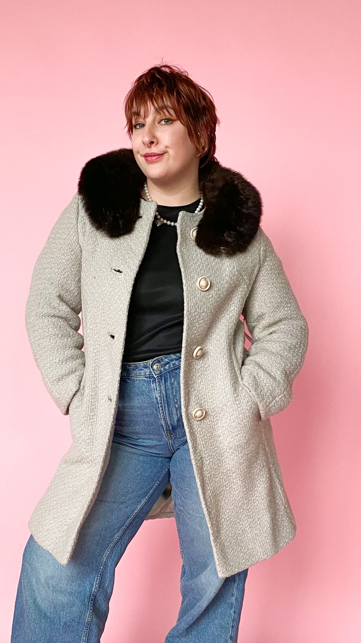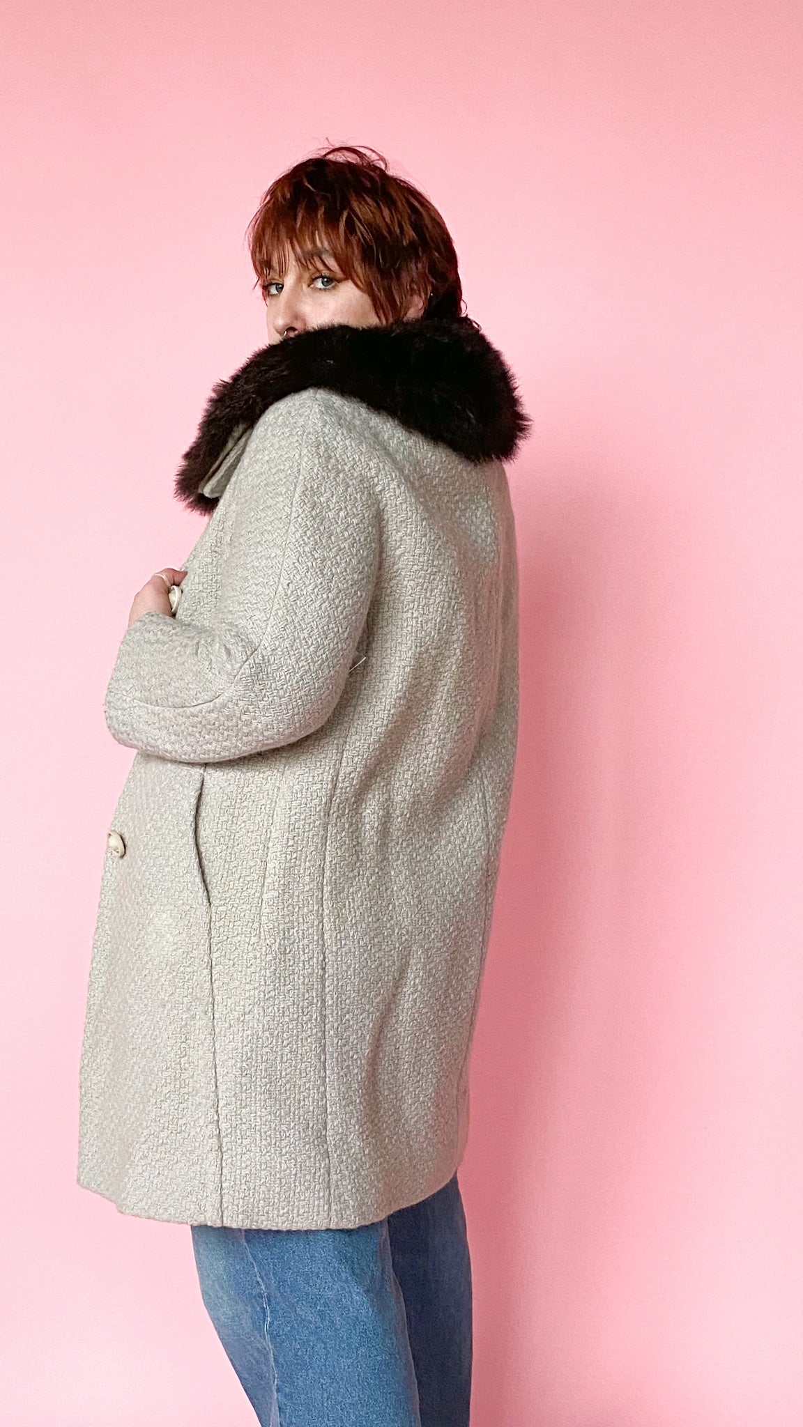 Stunning 1950s light grey tweed midi coat with an espresso brown fur trim collar. Button closure up the front with pockets on both sides.
