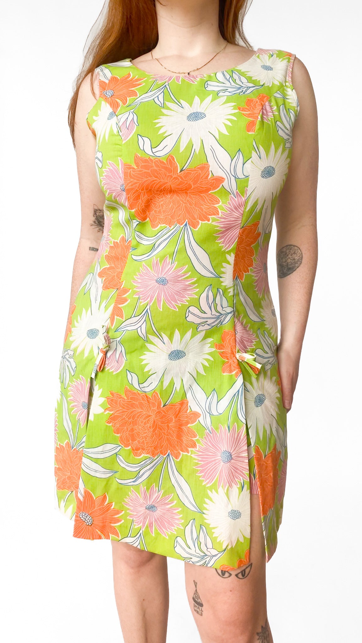 Description: Bright green sleeveless dress with large white, orange and pink flowers. Dress has side slits in front and back. The front slits have a bow tied on top. Dress comes with matching shorts to wear underneath. Dress has zipper down back. Shorts have elastic waistband.