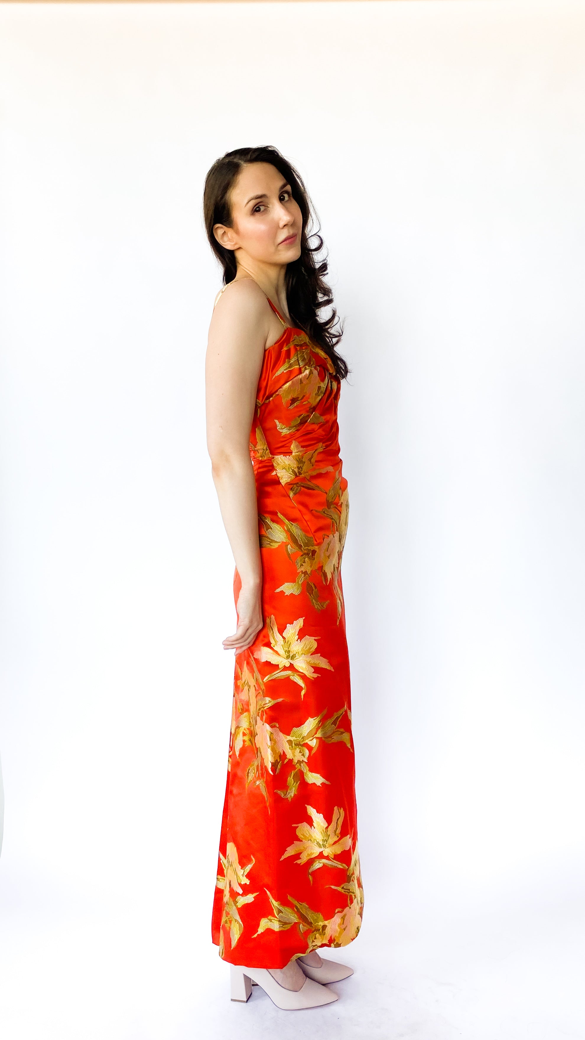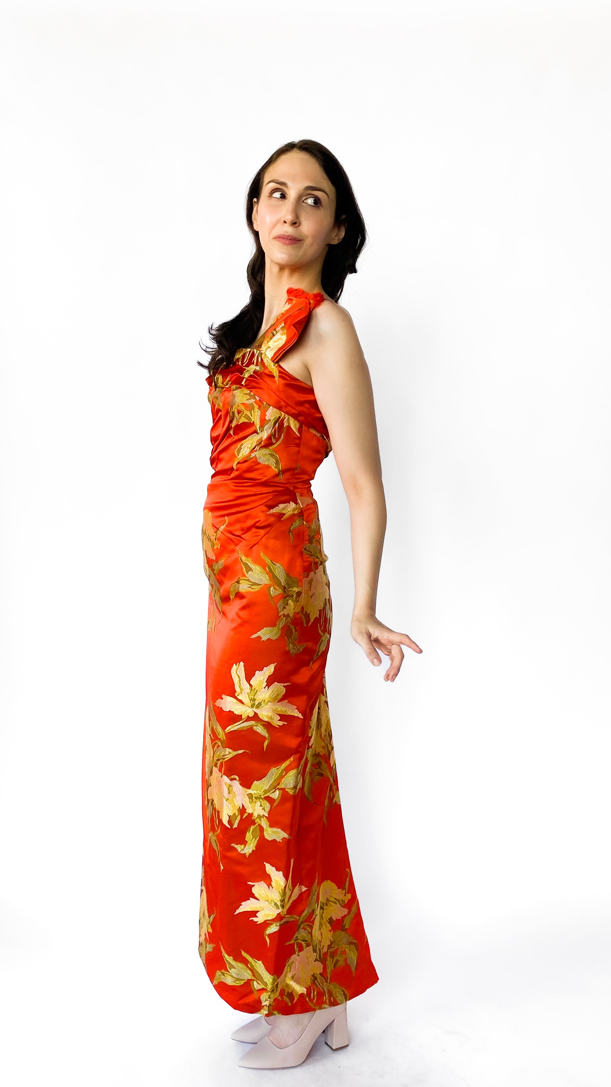 Description: Sleeveless bright orange form-fitting dress with gorgeous green, yellow and pink-toned floral designs. Dress has zipper in back. One of the straps has a pleated asymmetrical detail with intentional frays.