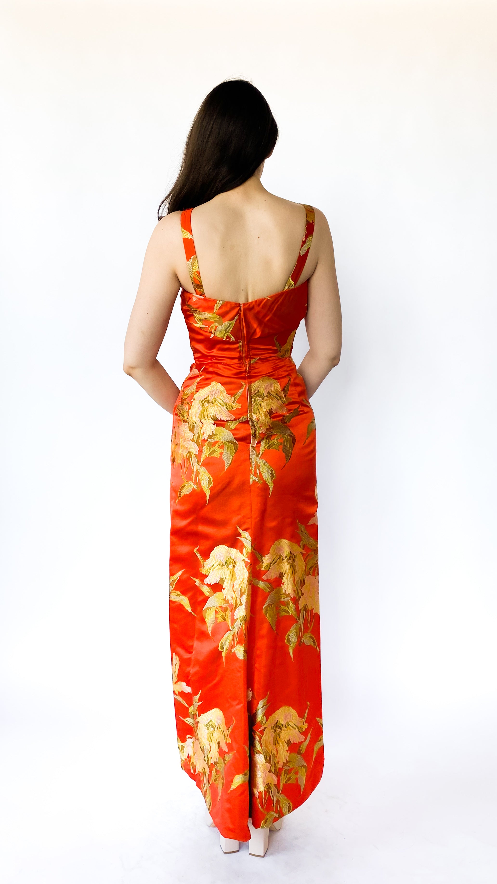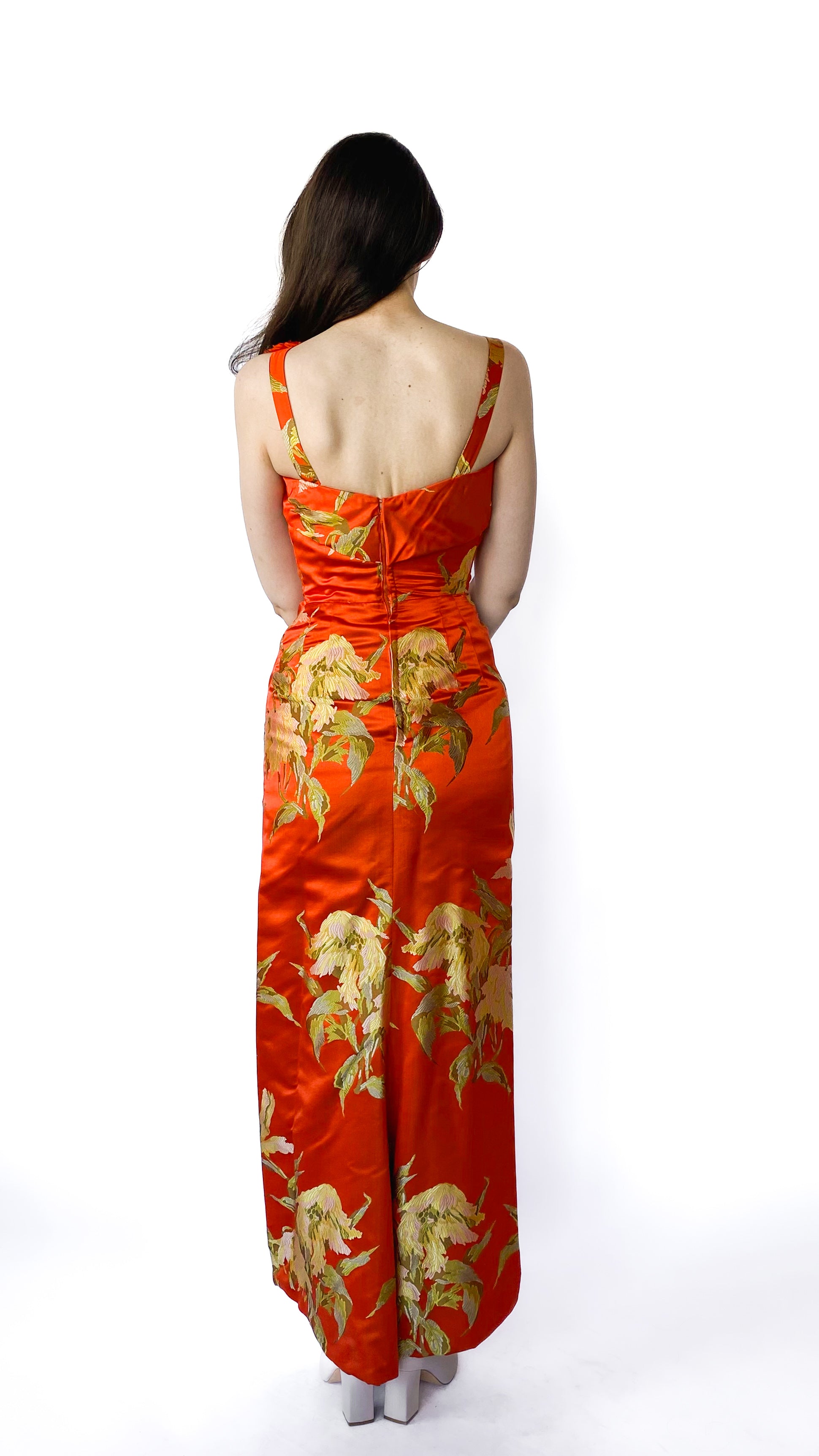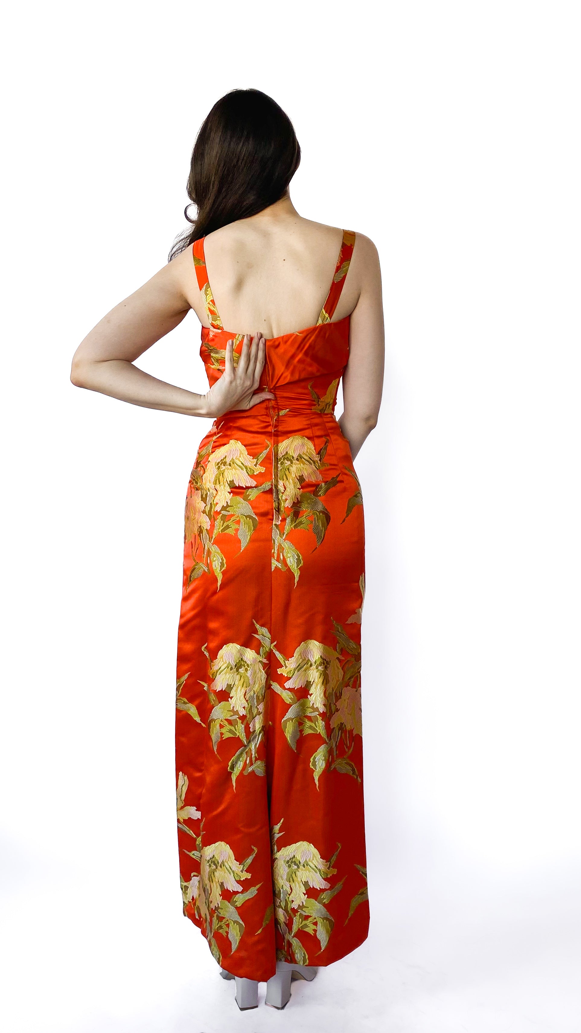 1960s Bright Orange Floral Brocade Gown, sz. XS