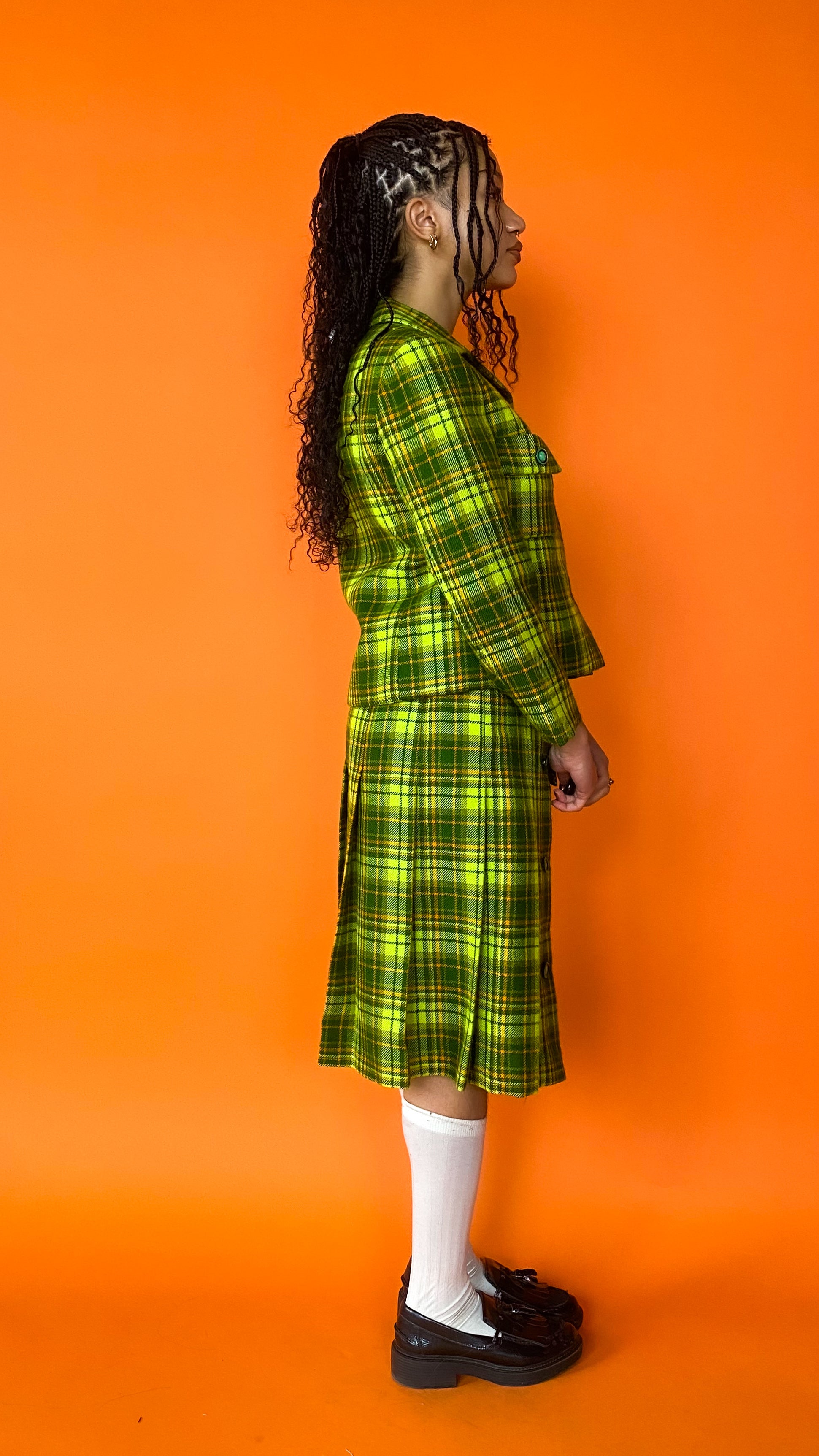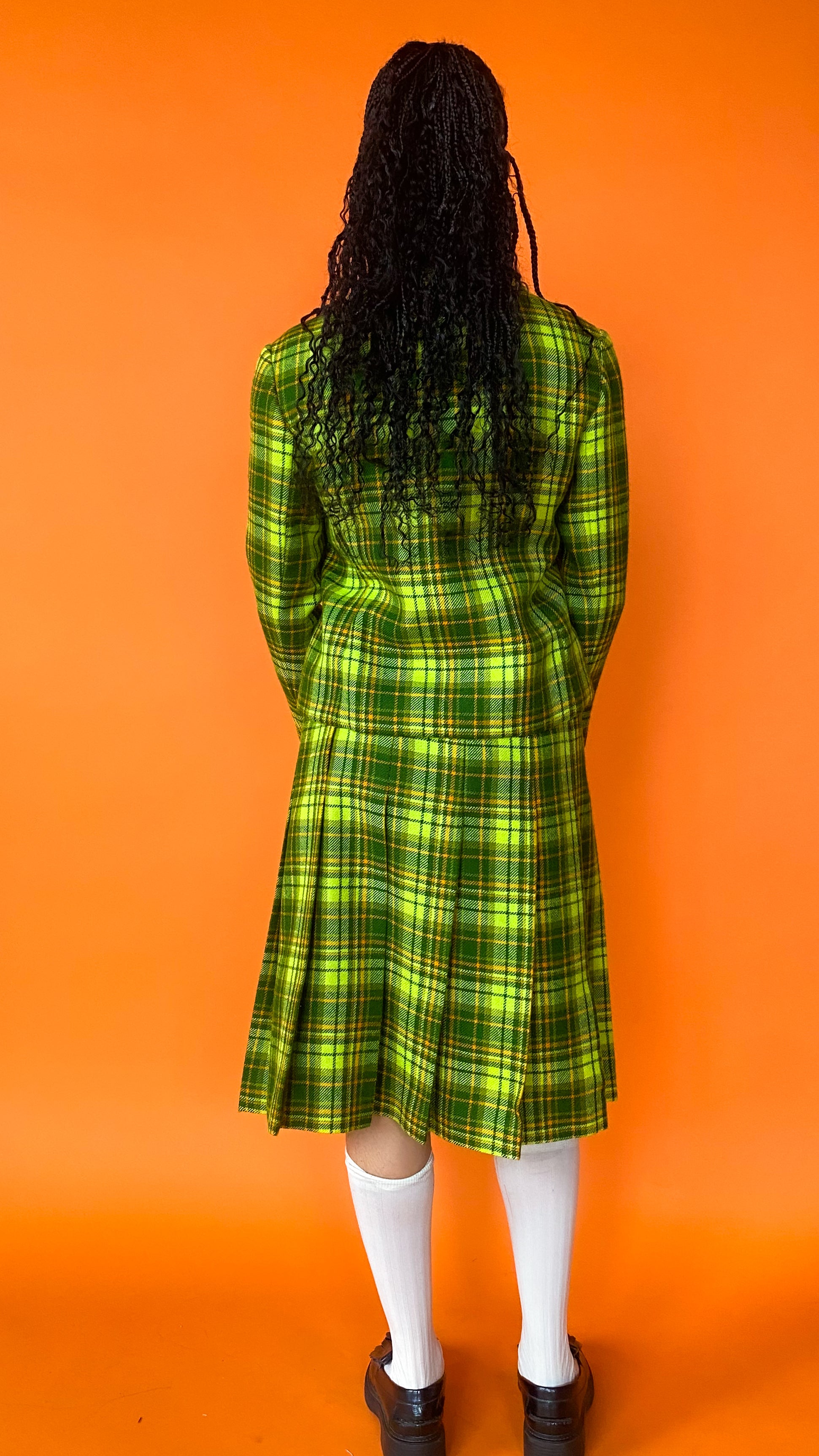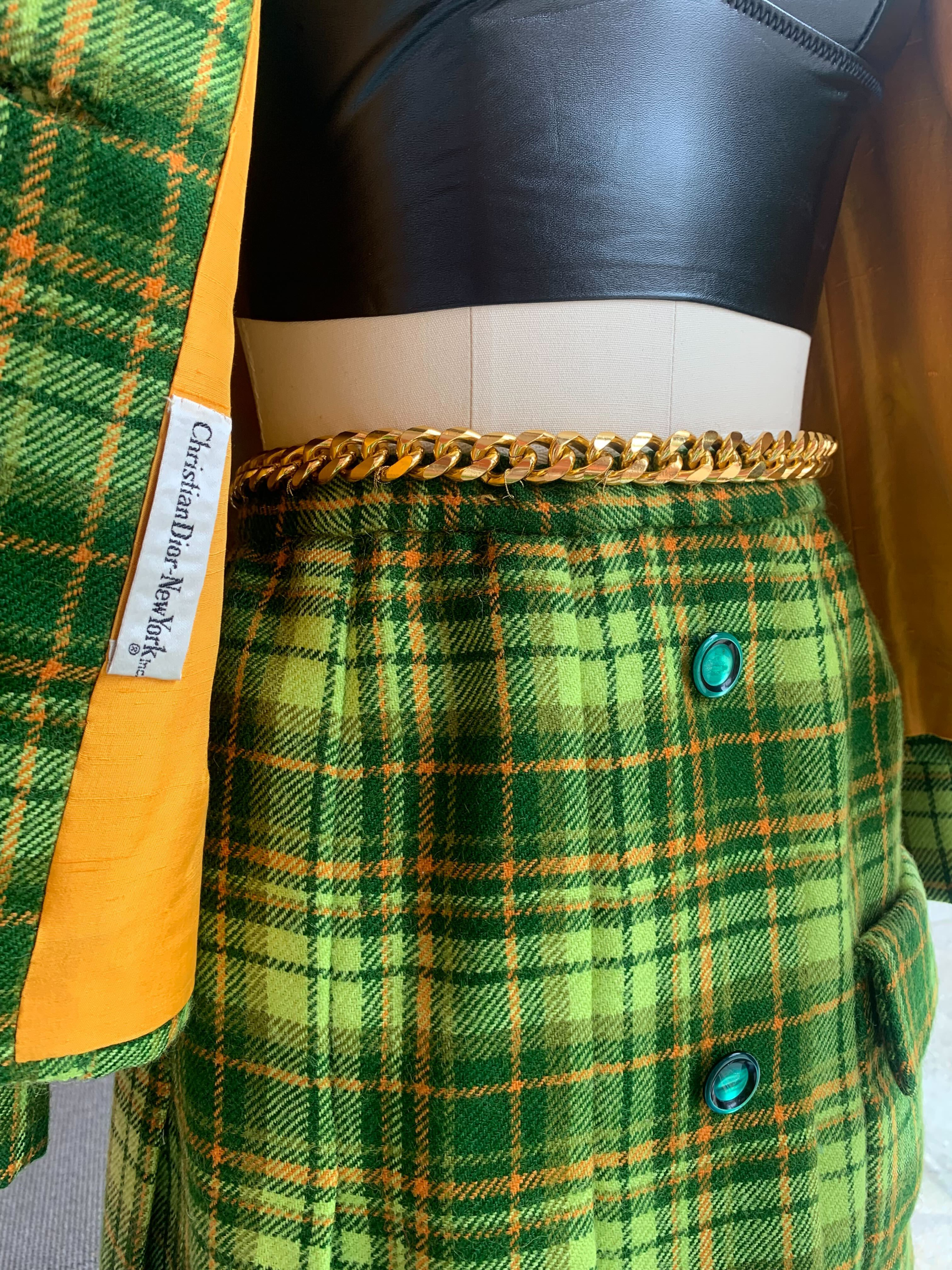 Description: Lime green plaid skirt with matching blazer. Skirt has gold chain belt & back zipper closure, with button detailing & pleating on front. Jacket has buttons down front & pockets over bust. Both skirt and jacket are fully lined in bright yellow.