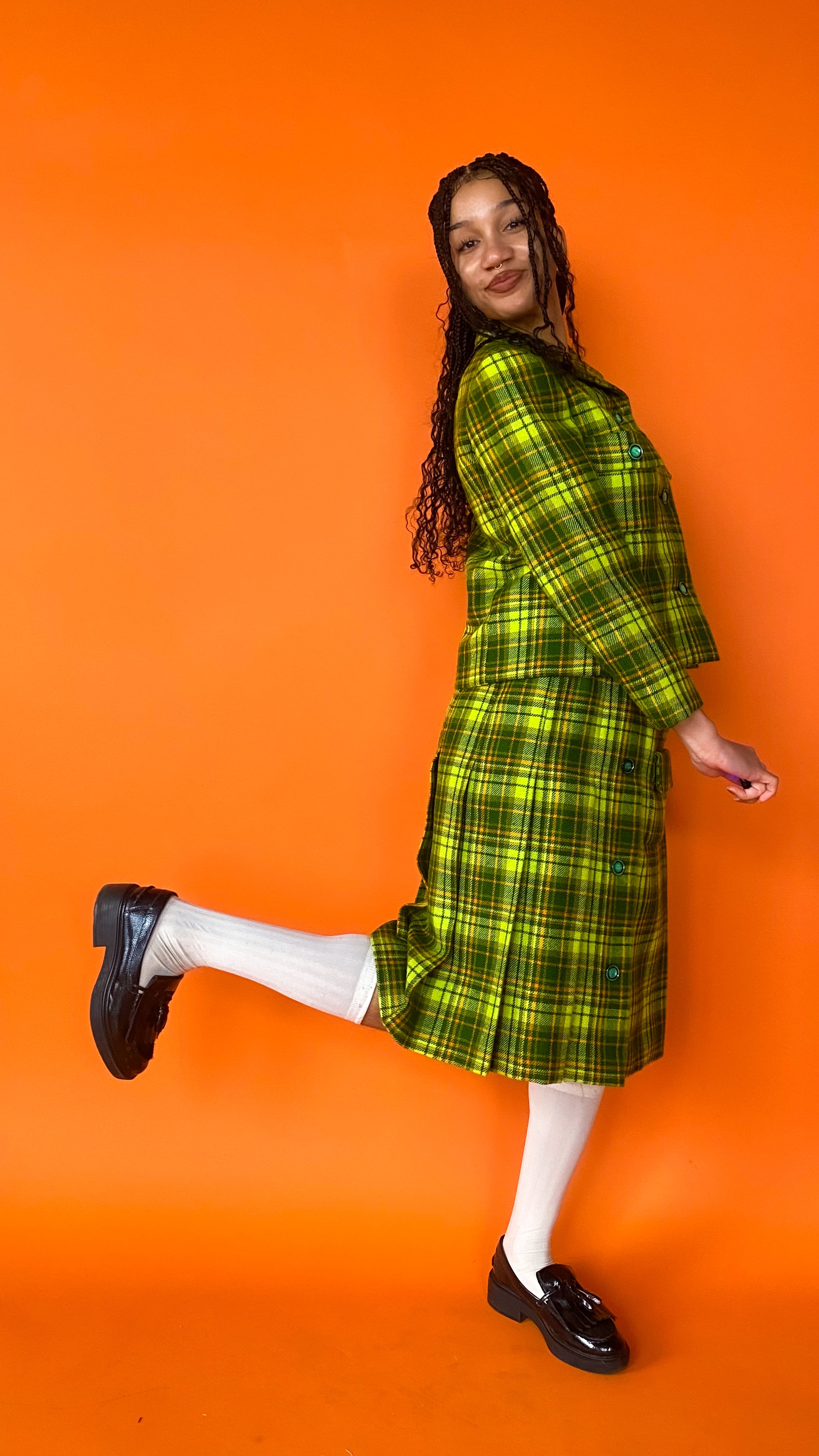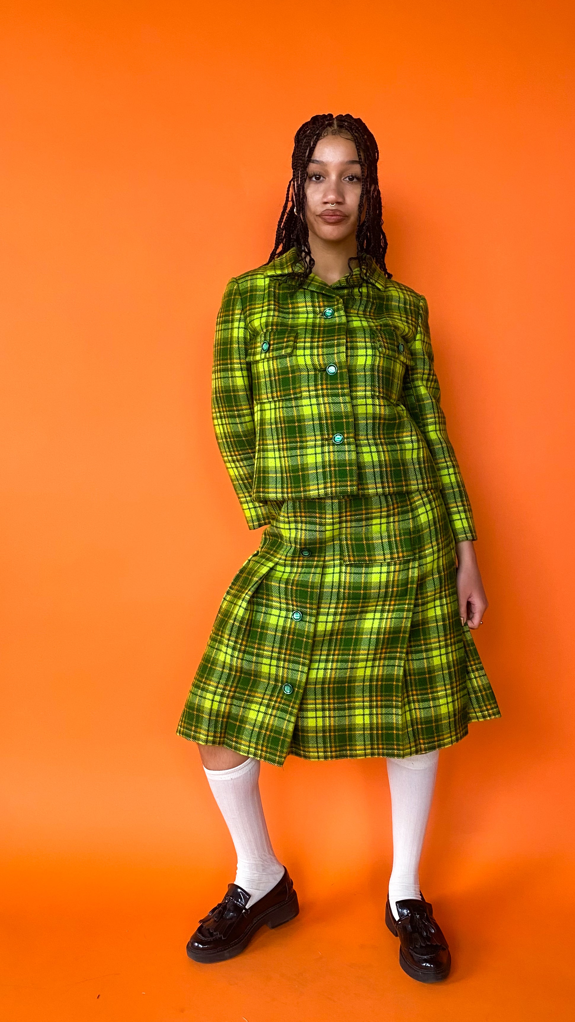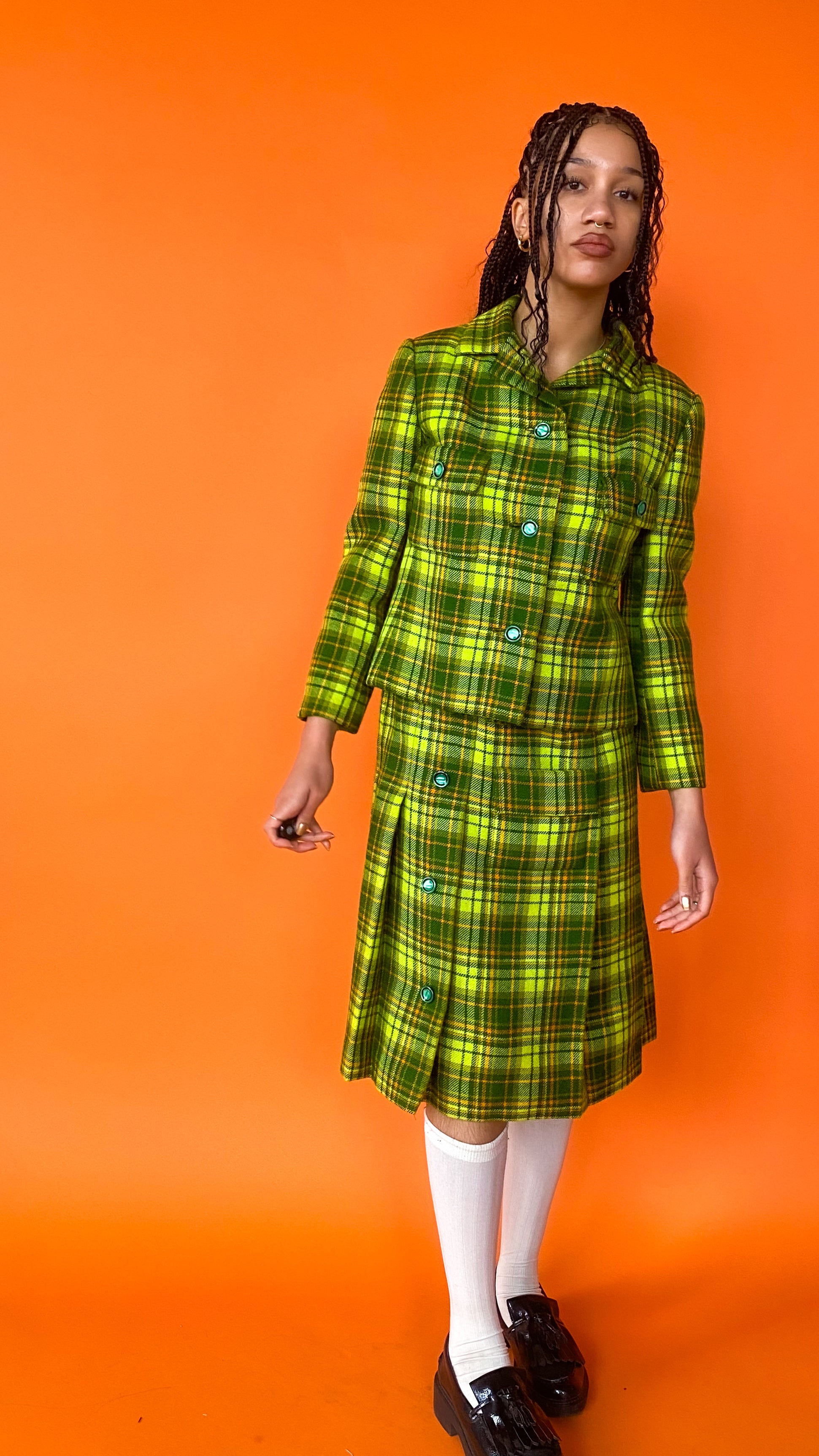 Description: Lime green plaid skirt with matching blazer. Skirt has gold chain belt & back zipper closure, with button detailing & pleating on front. Jacket has buttons down front & pockets over bust. Both skirt and jacket are fully lined in bright yellow.