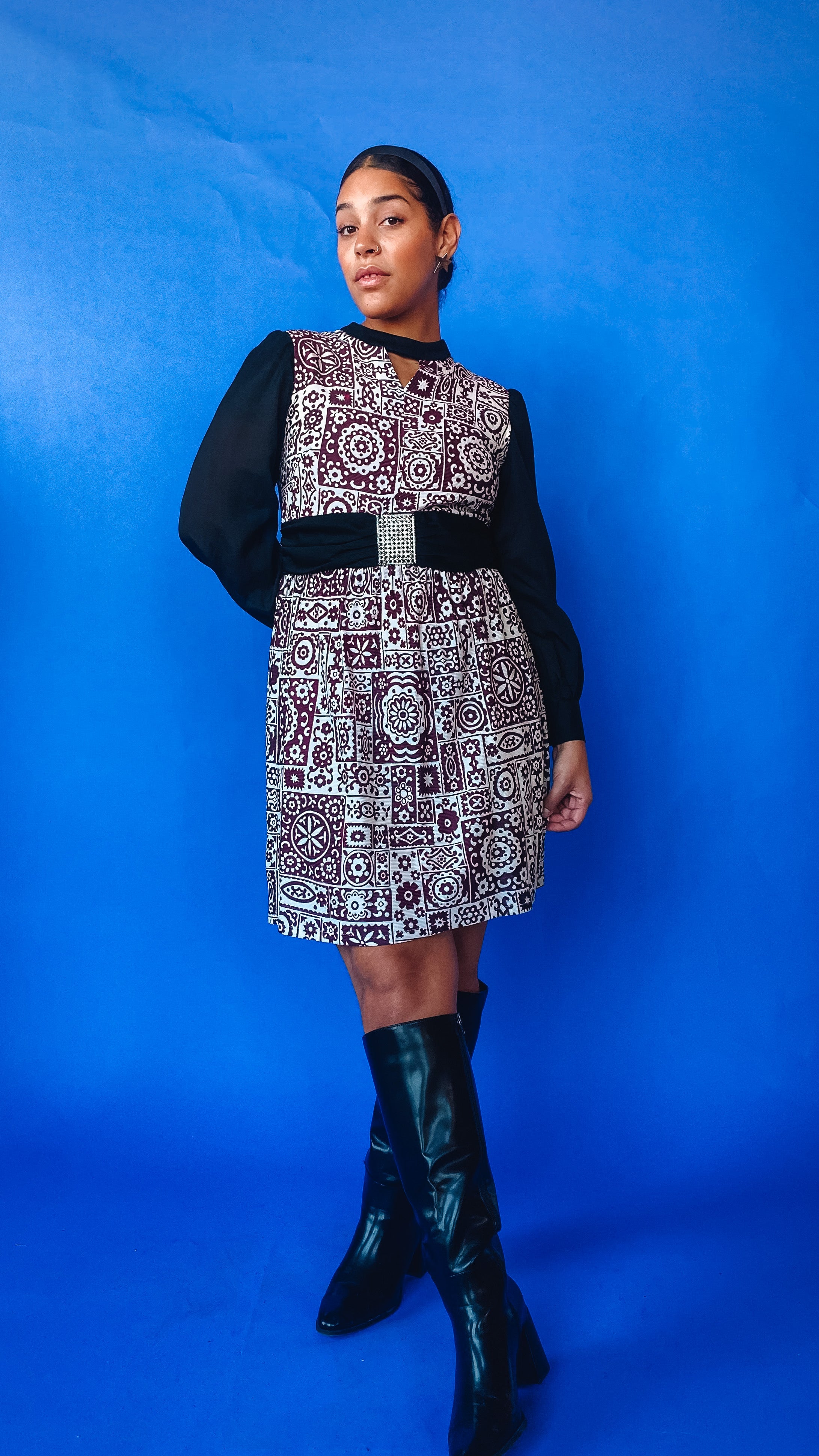Gorgeous '60s floral tile print mini dress with sheer sleeves and silver, rhinestoned belt buckle detail. Good vintage condition - no visible flaws.