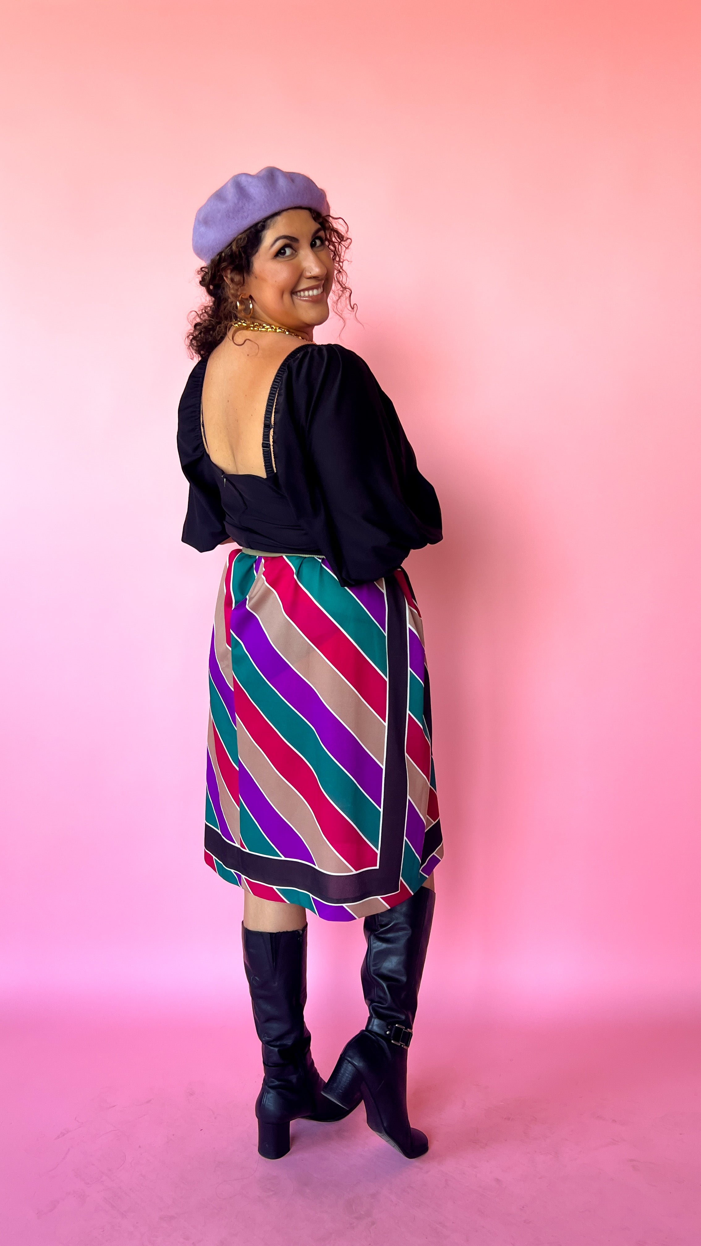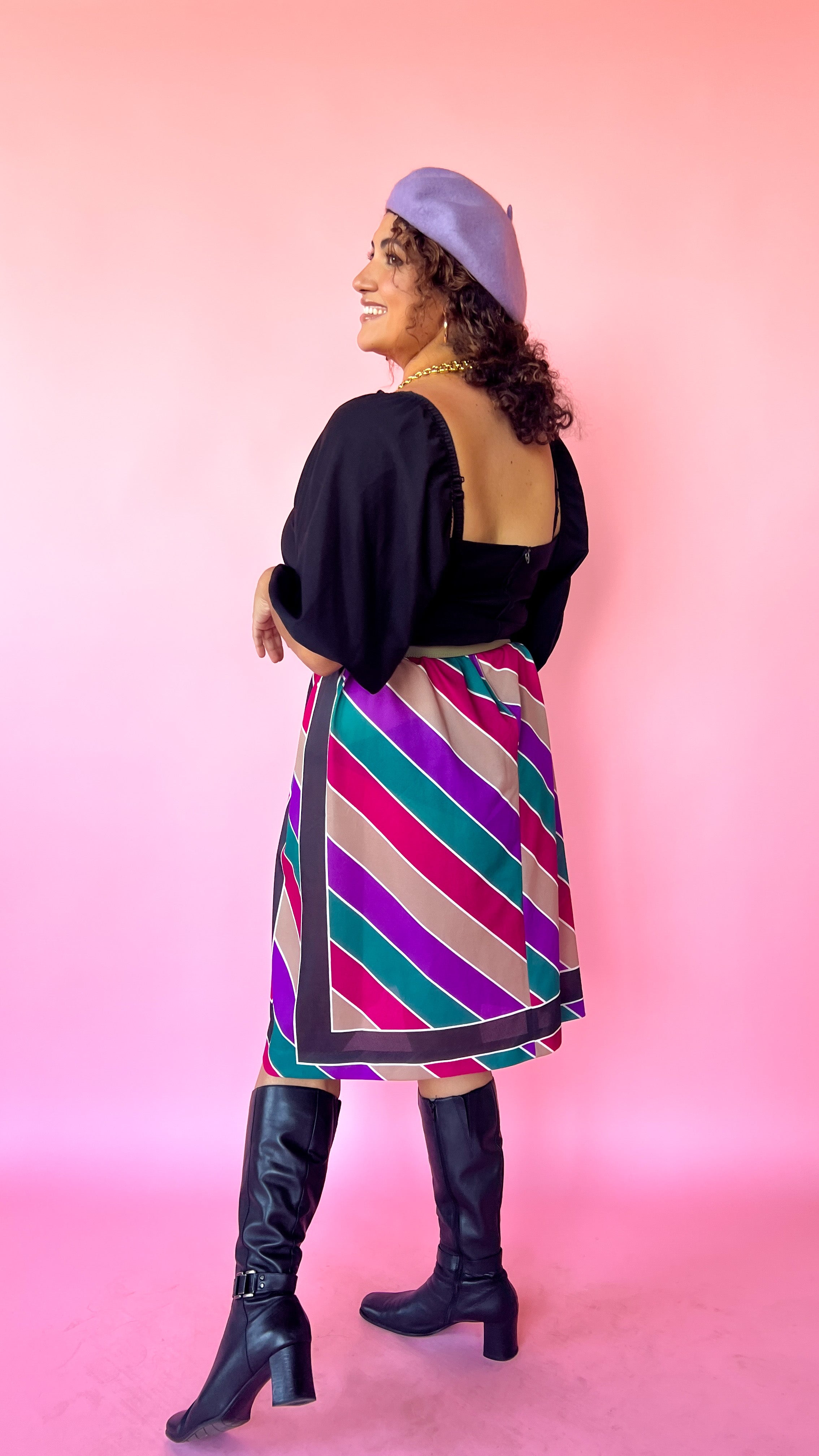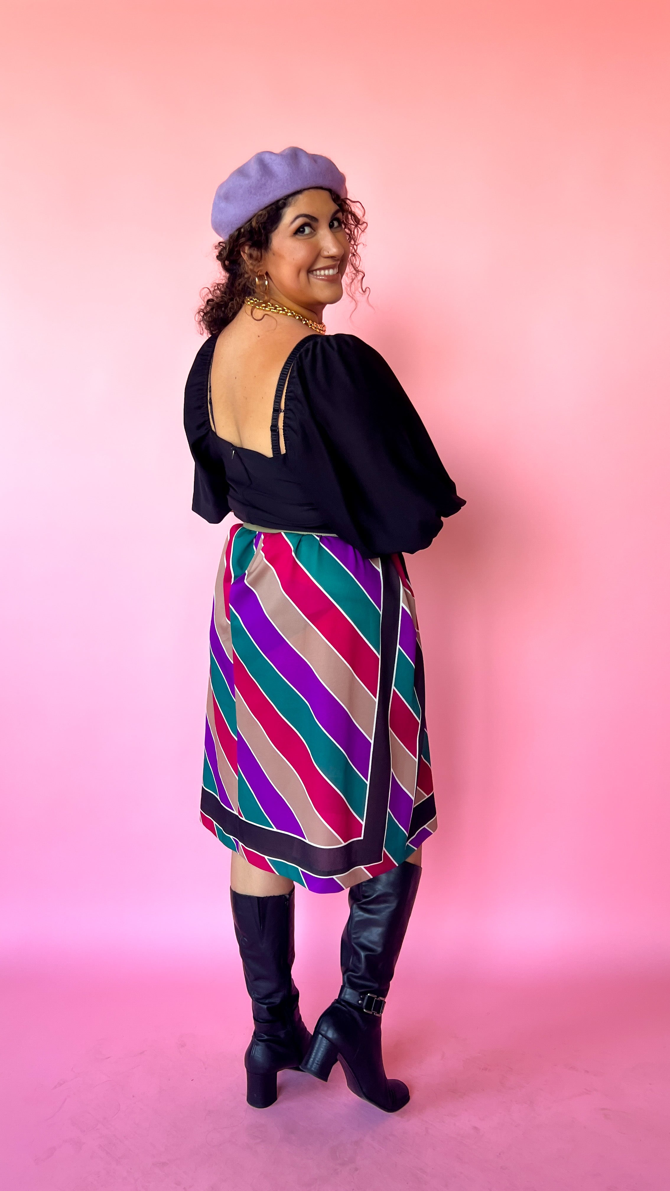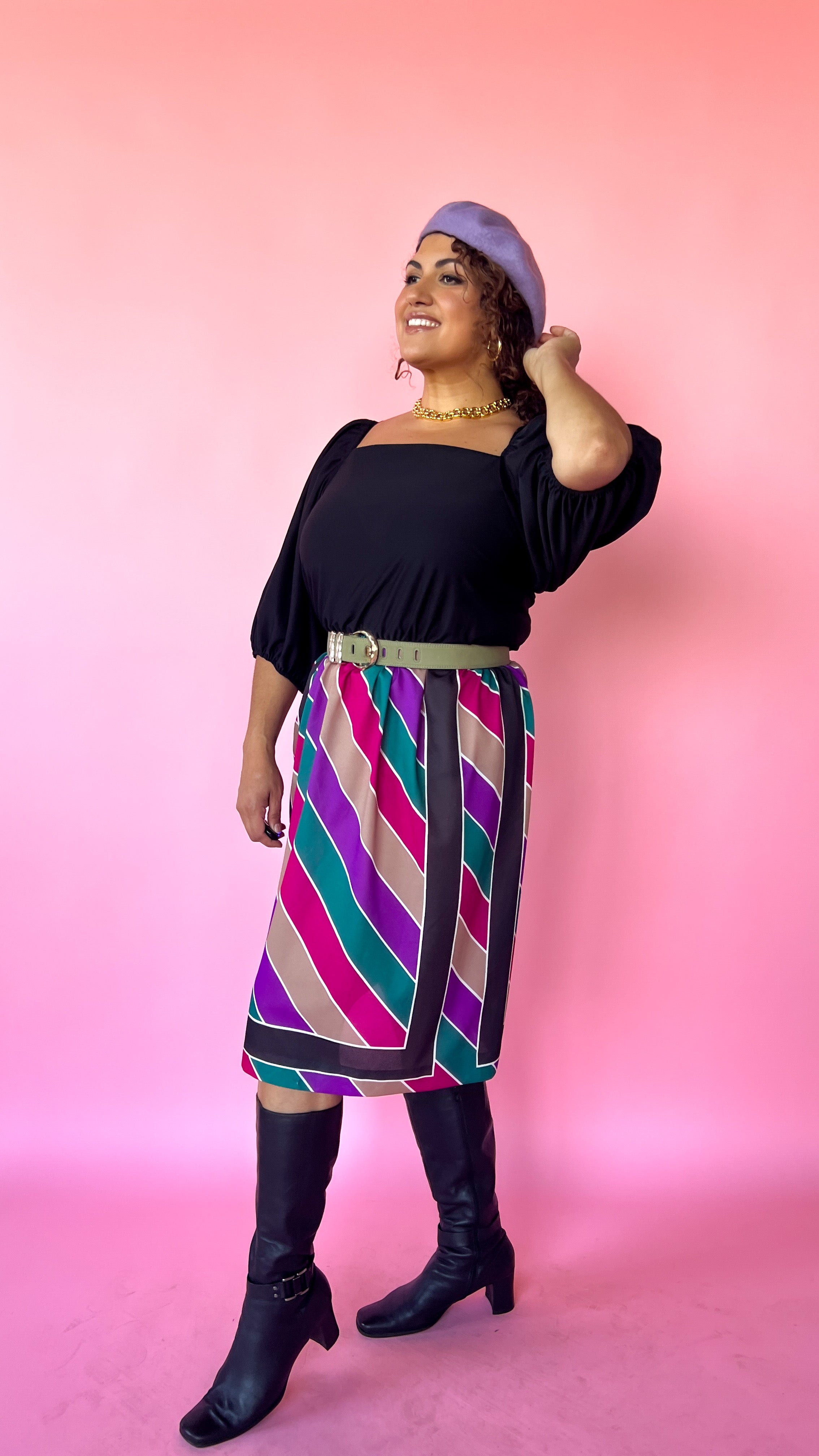 Black bodice with green, purple, magenta and taupe diagonal stripes. Puff sleeves. Some elastic in waist. Zipper closure in back. Union label.