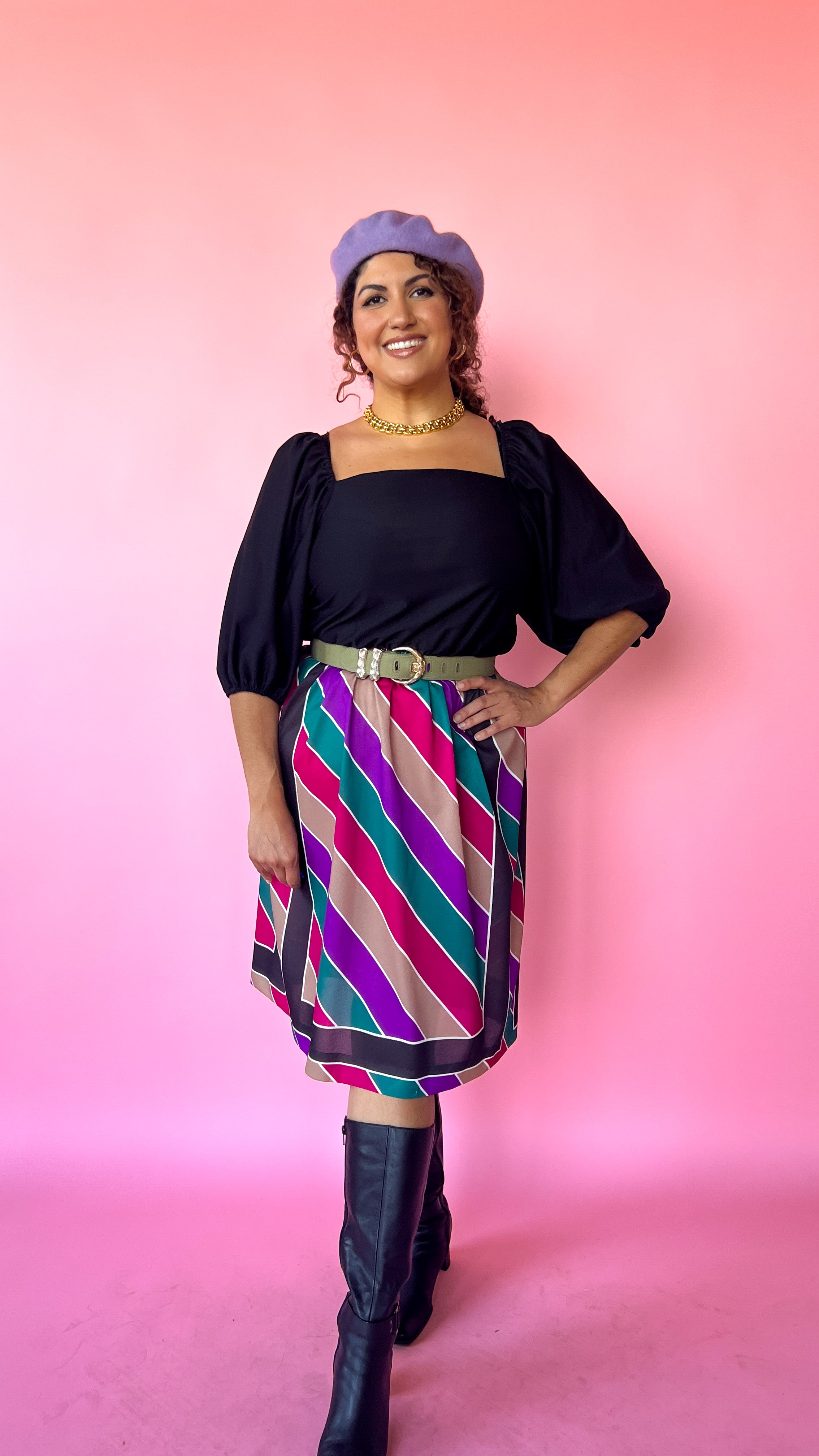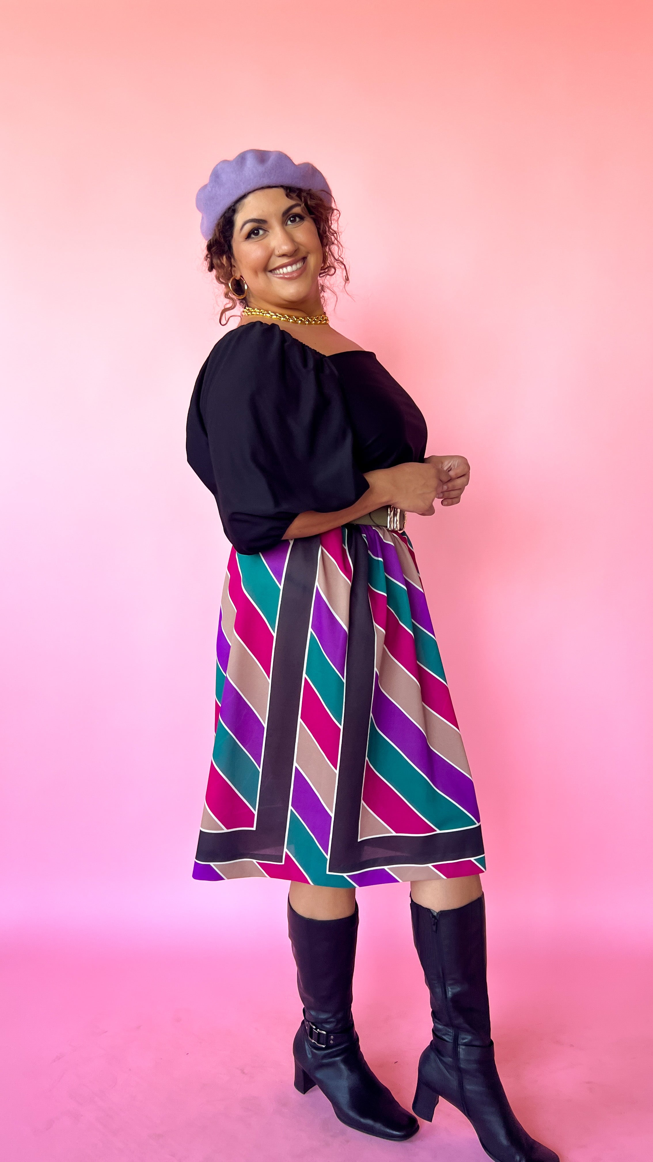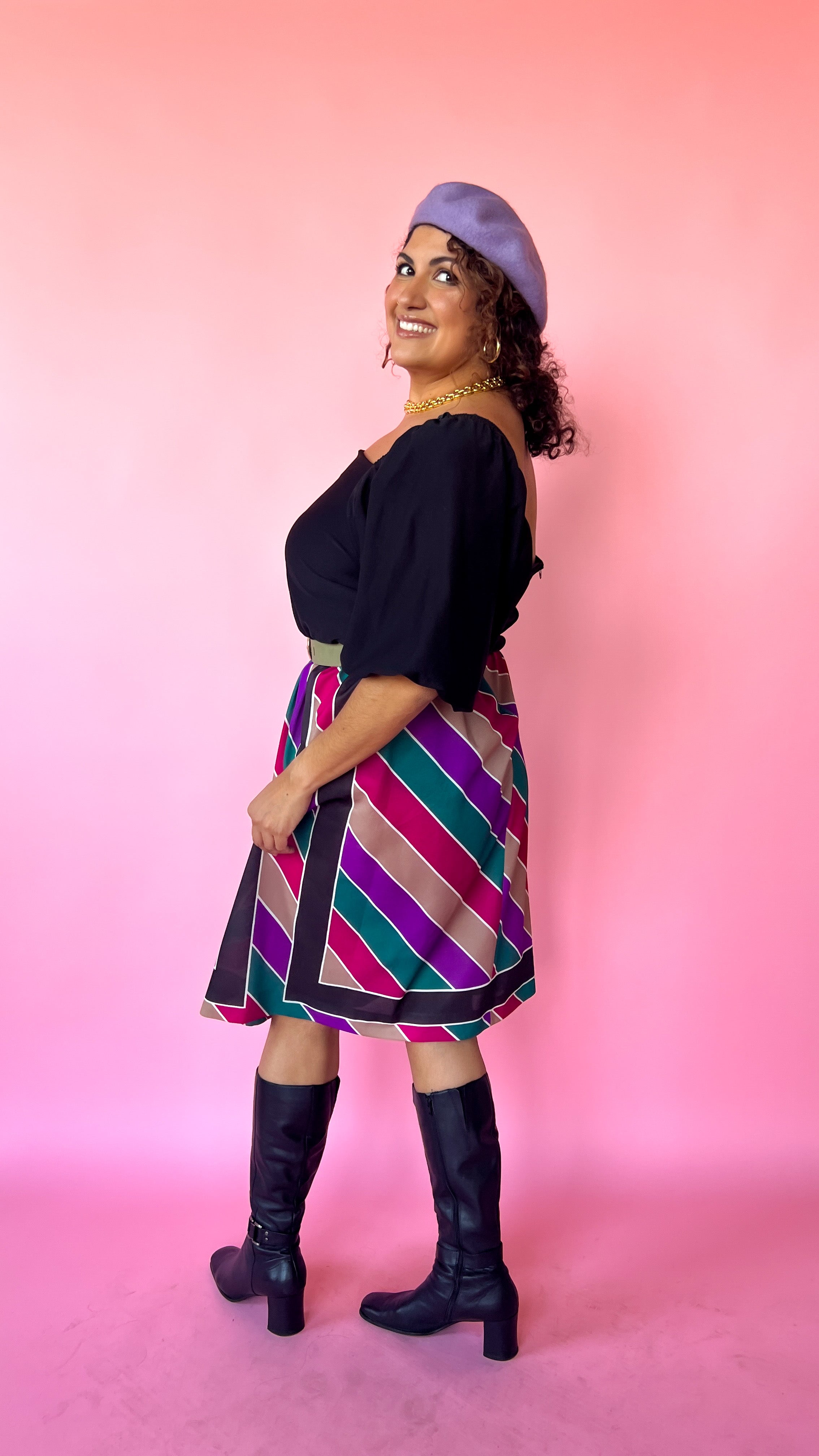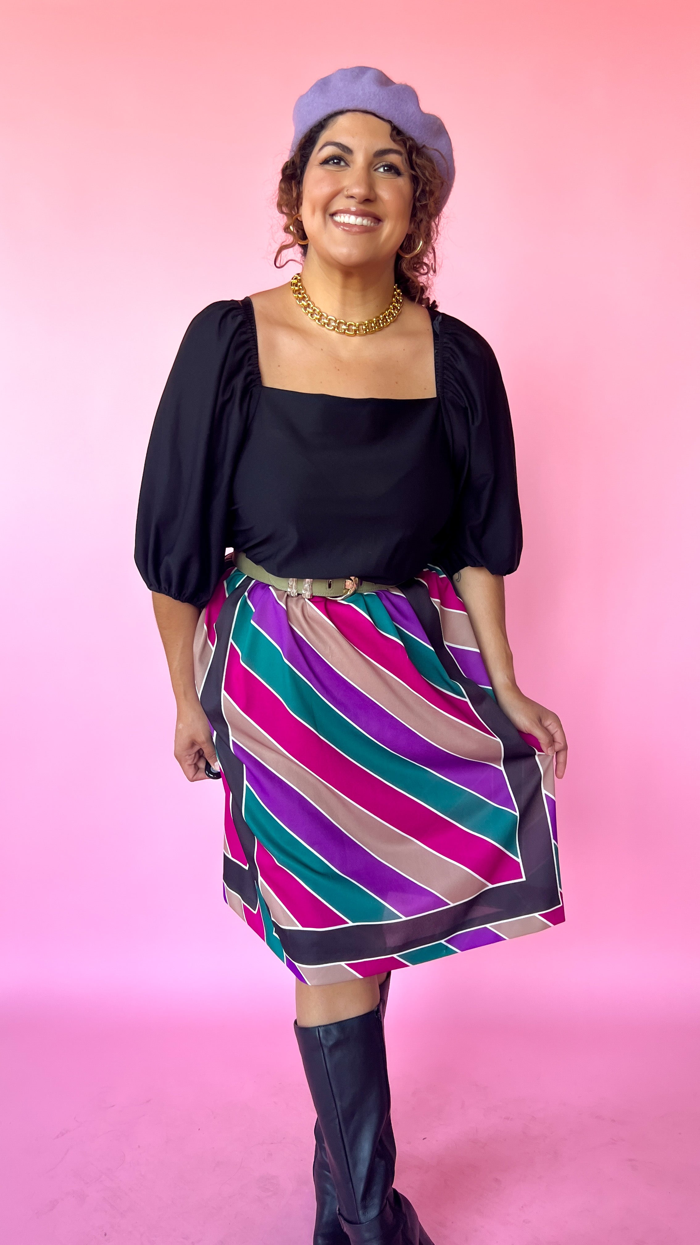 Black bodice with green, purple, magenta and taupe diagonal stripes. Puff sleeves. Some elastic in waist. Zipper closure in back. Union label.
