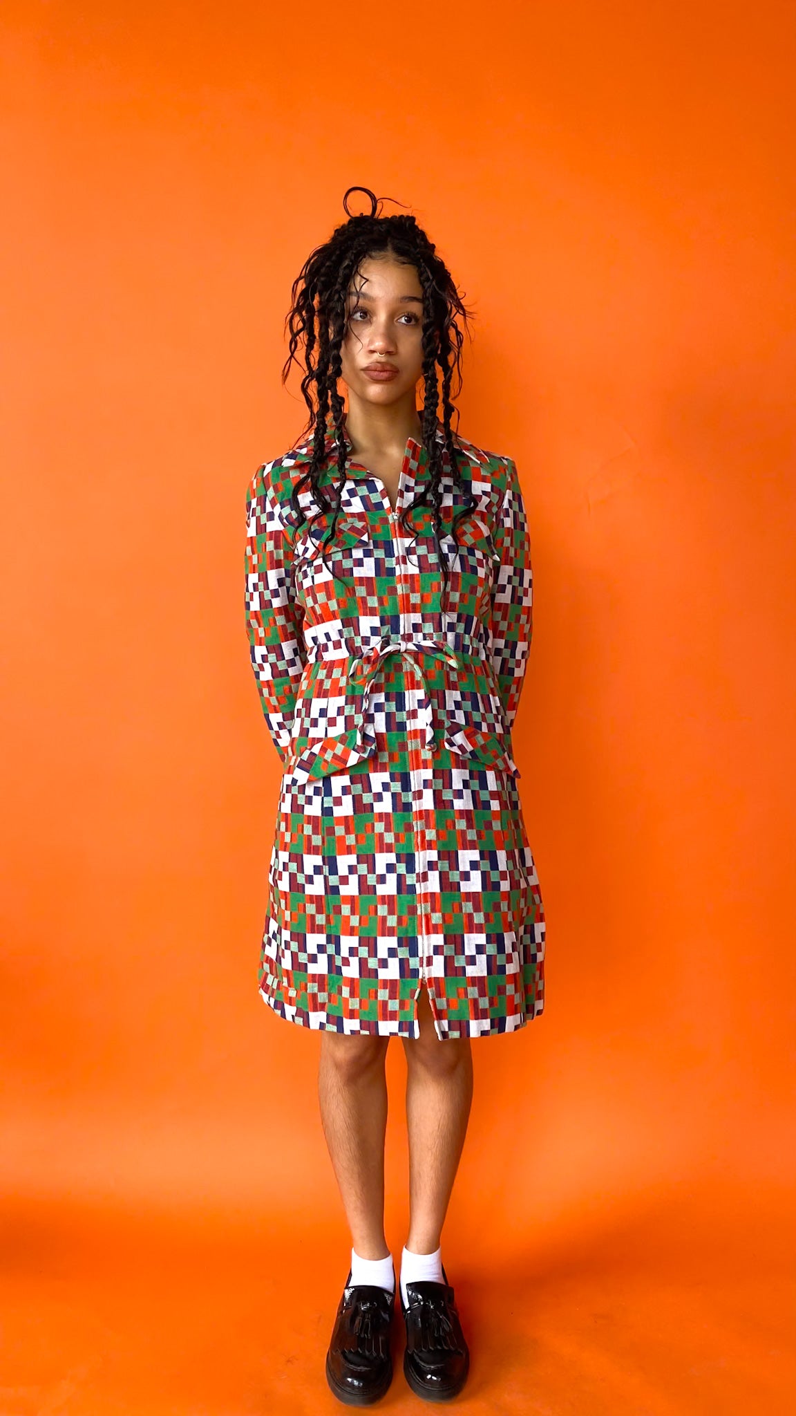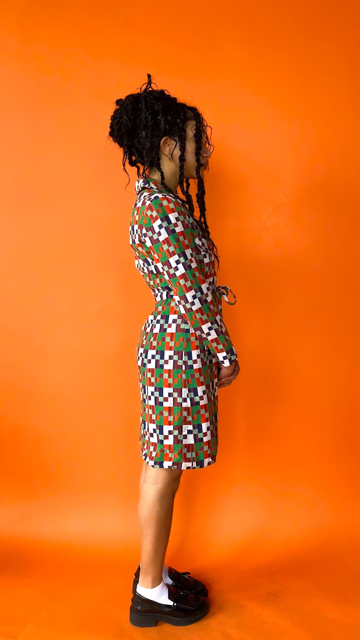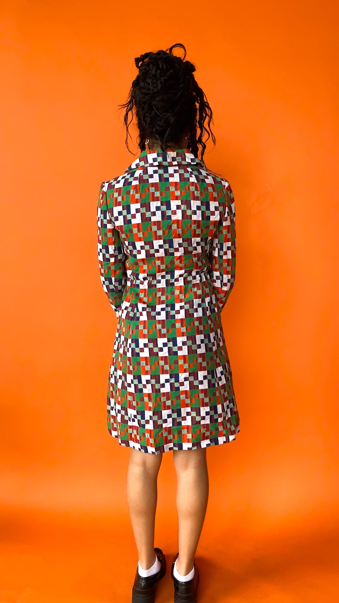 Description: 70s orange, green, blue, white, geometric/checkered print dress. Zipper closure on front. Adjustable ties around waist. Collared and long sleeved. Decorative pocket details on front.