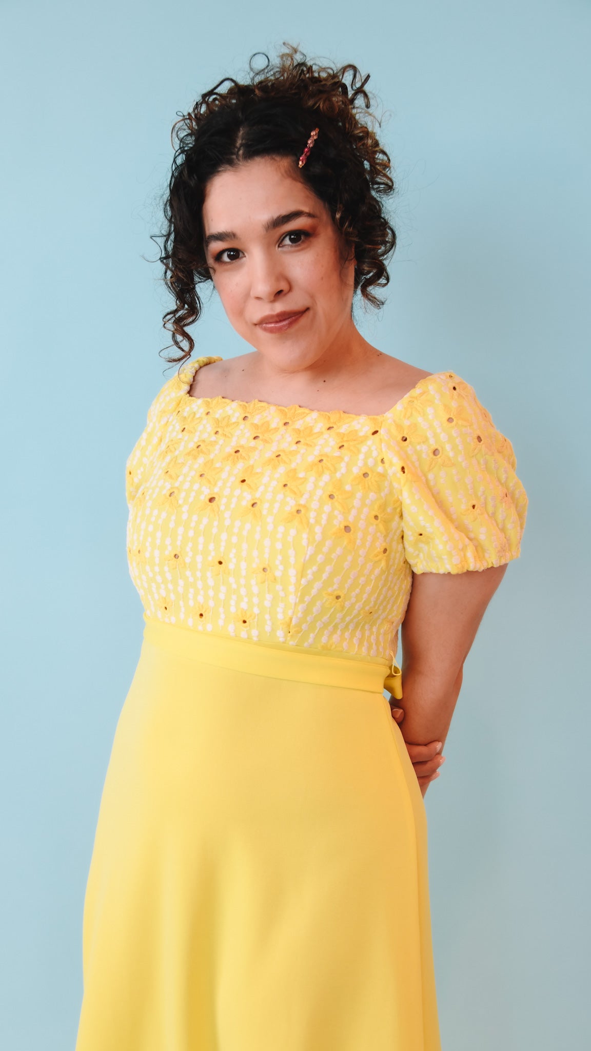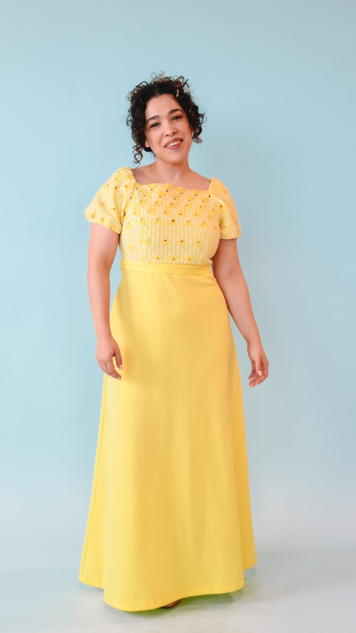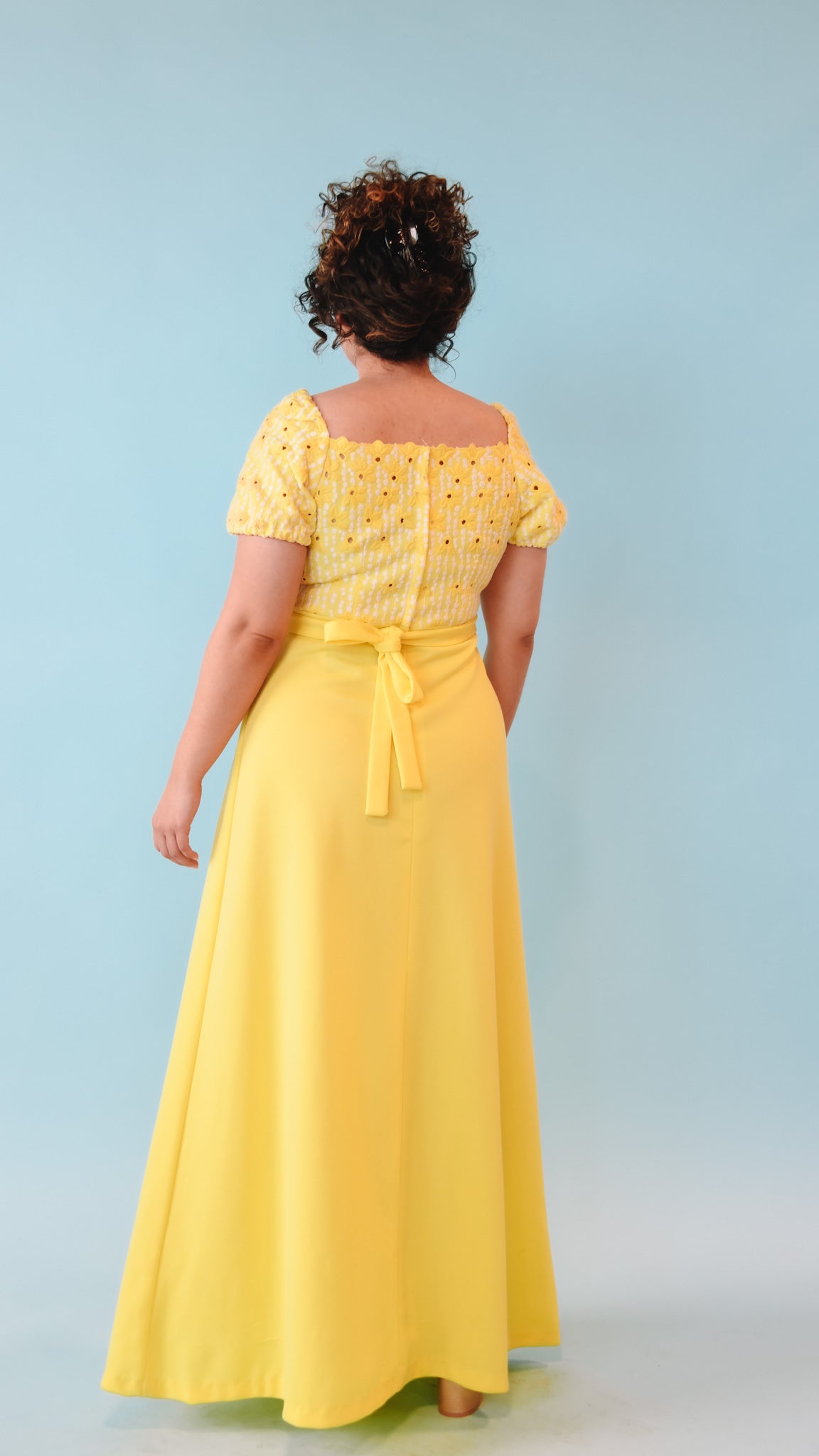 Bright yellow maxi dress with eyelet at the bust. Comes with tie belt. Center back zipper. Puff sleeves.