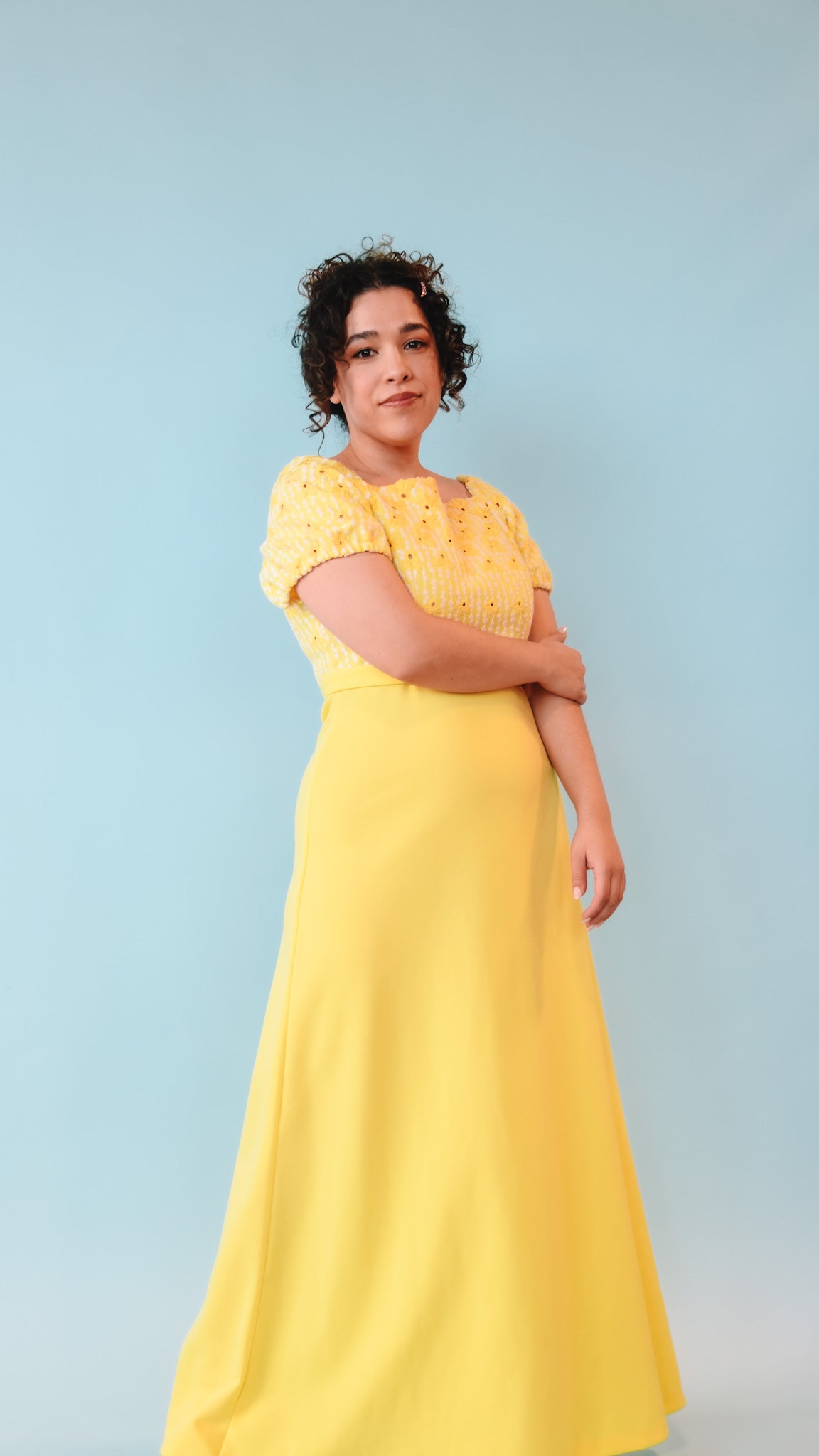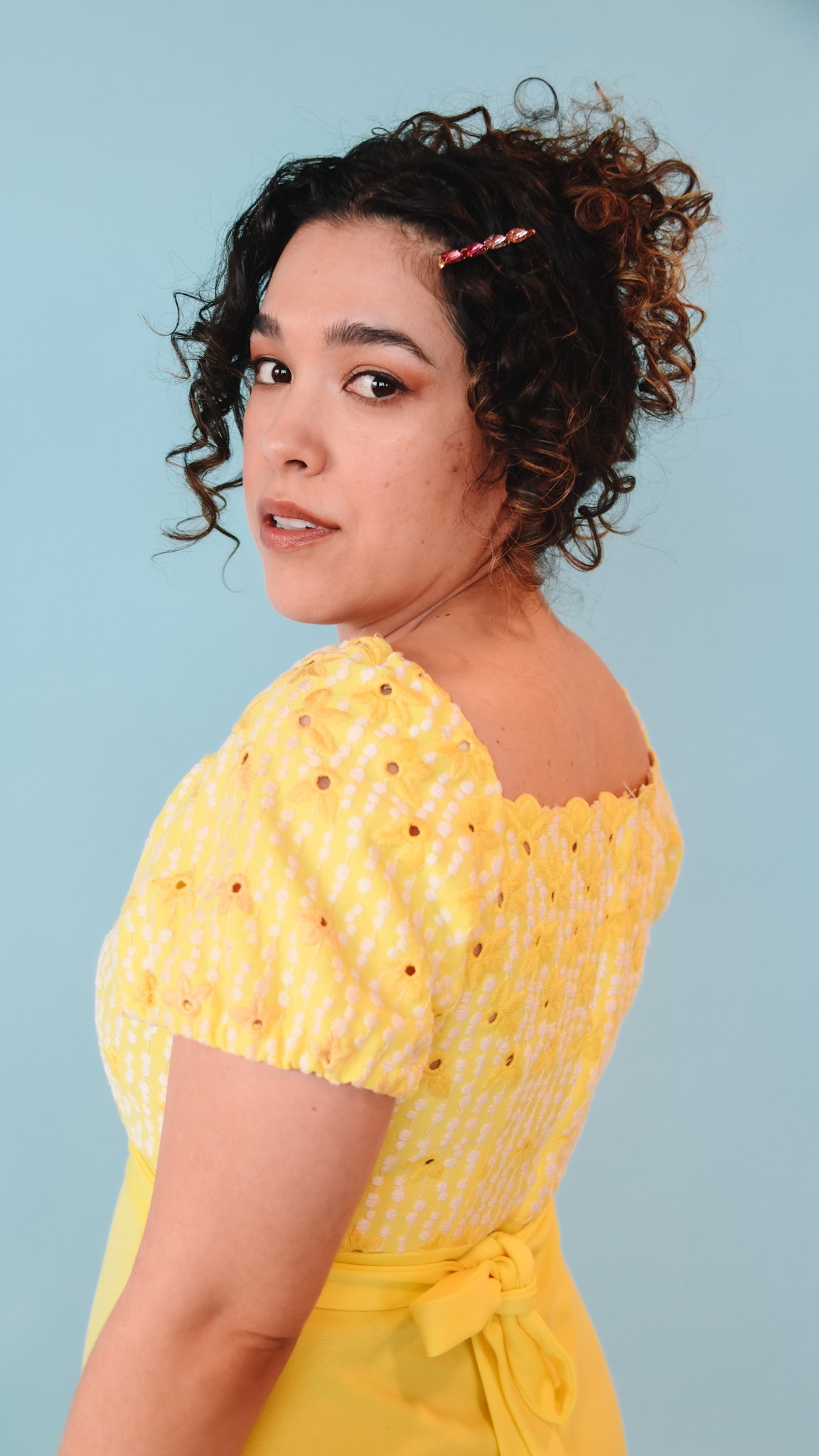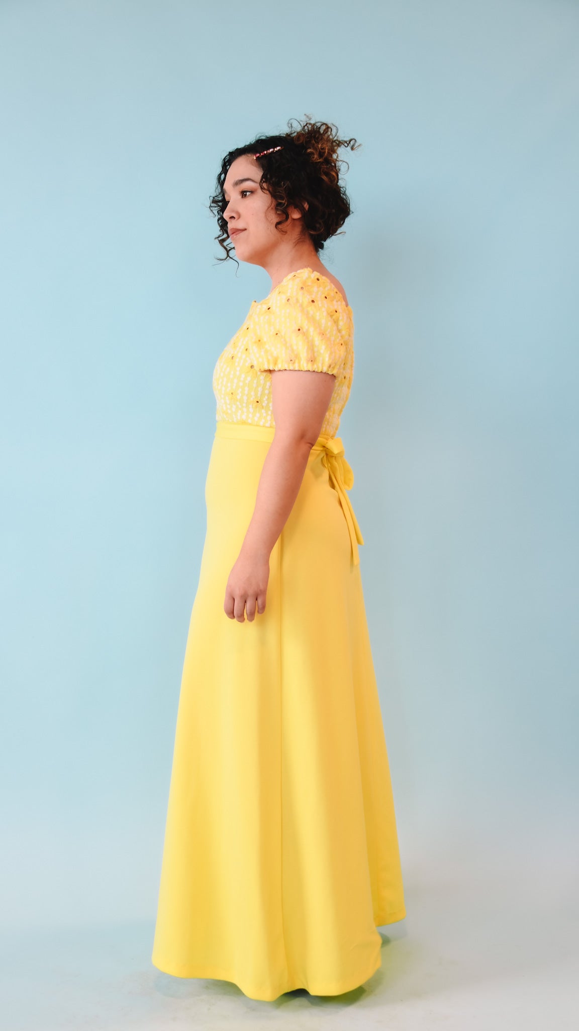Bright yellow maxi dress with eyelet at the bust. Comes with tie belt. Center back zipper. Puff sleeves.