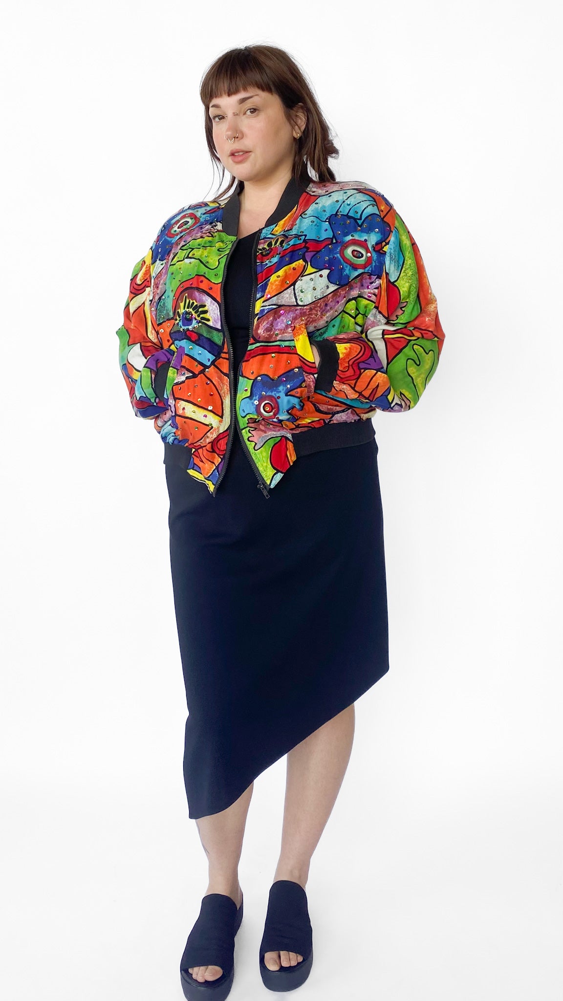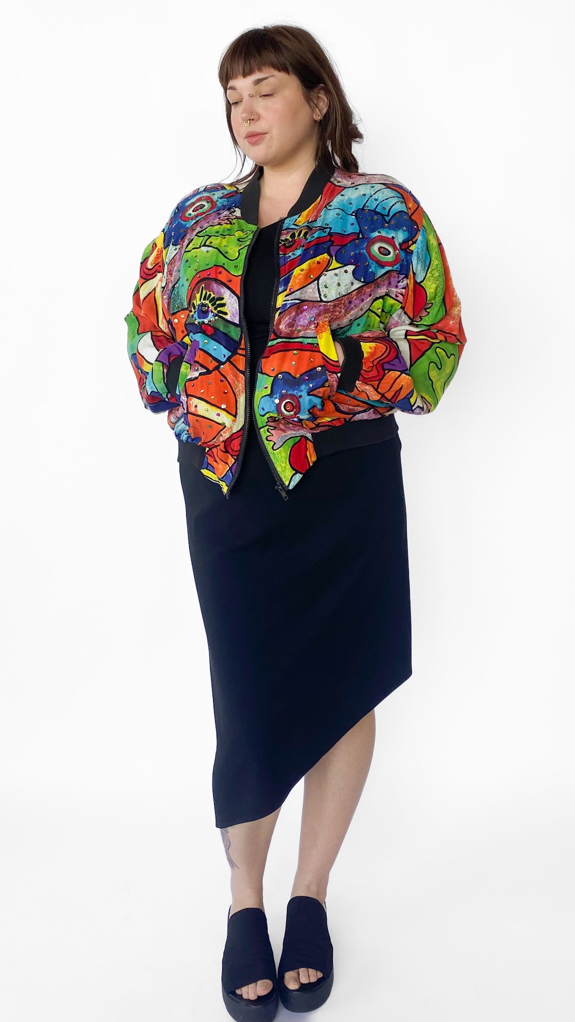 Description: Black base coat with textured, colorful abstract face pattern. Colorful sequins decorate the front of the jacket. Collar, zipper, hemline and sleeve cuffs are black. Two front pockets near hemline.