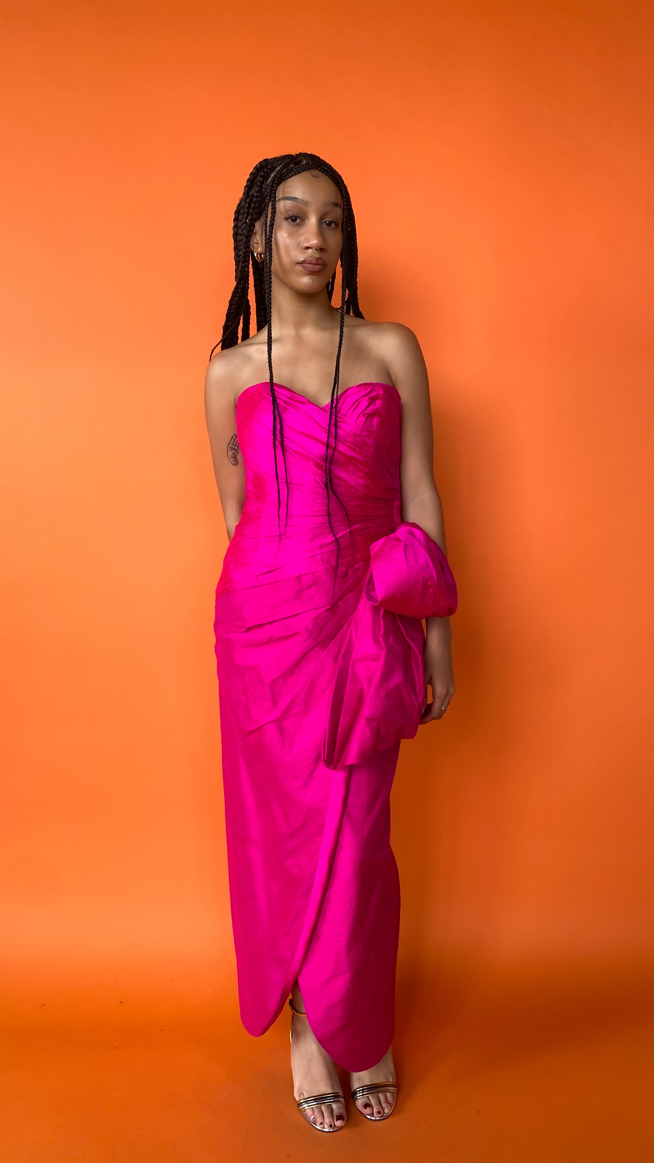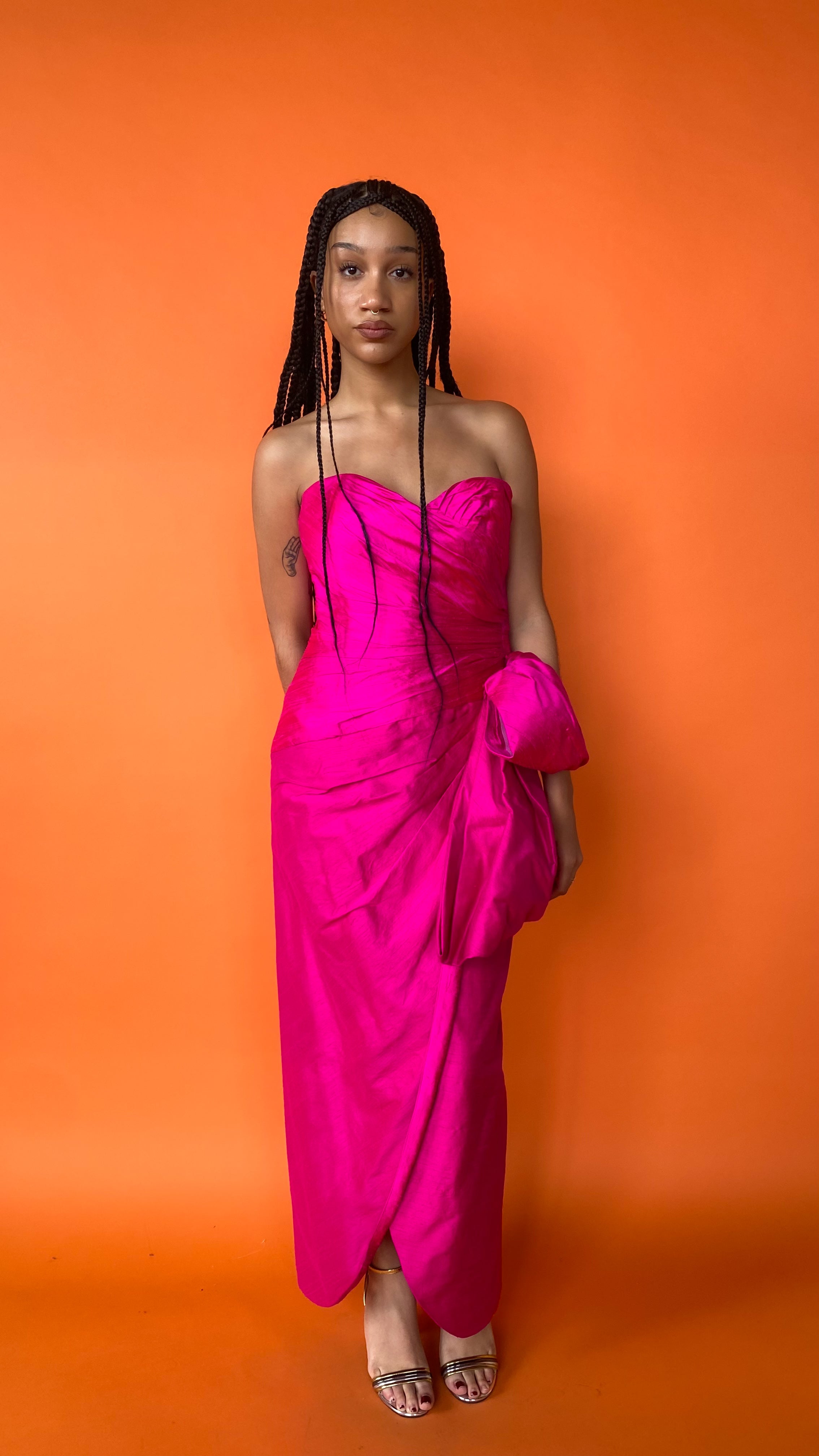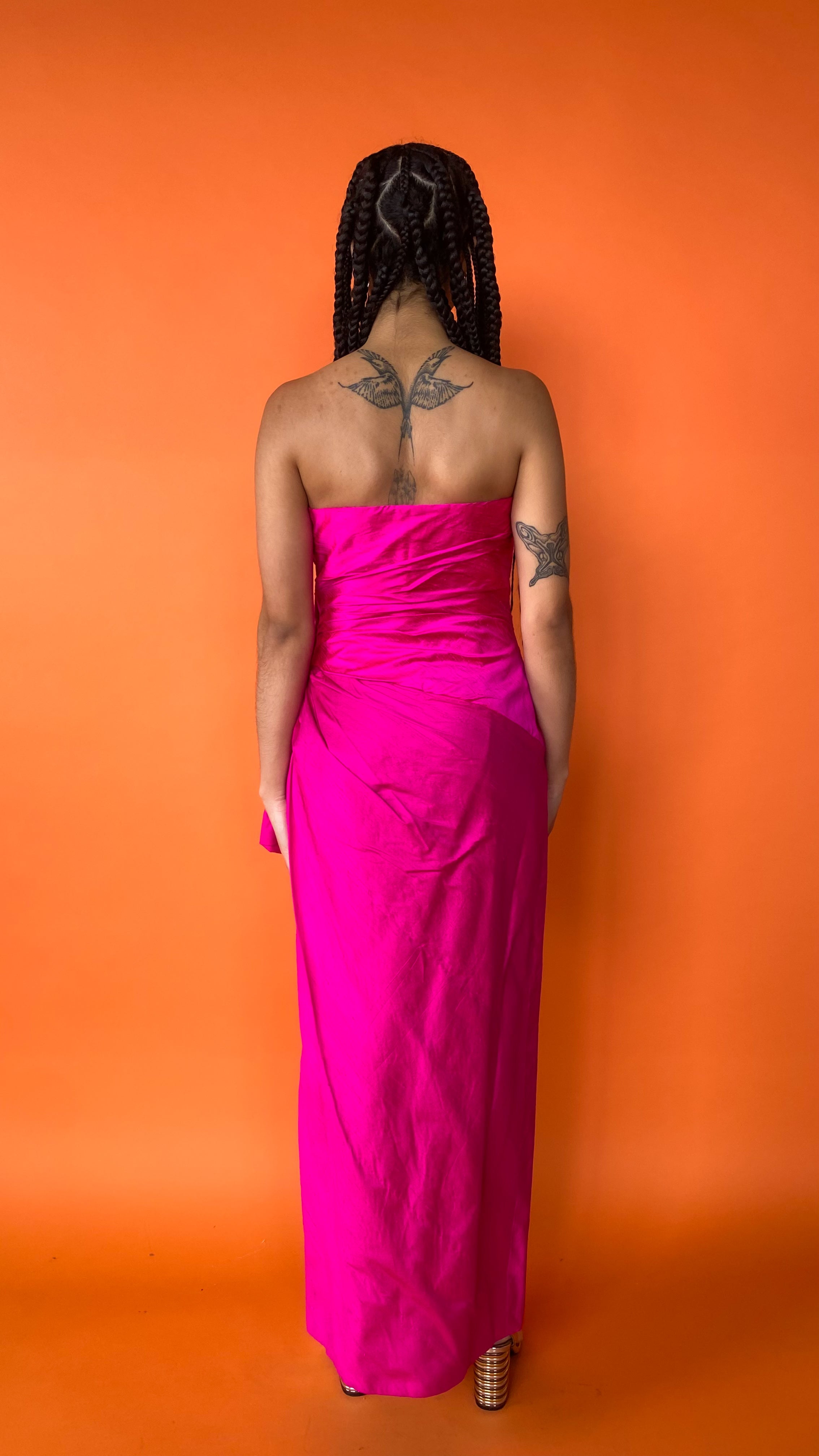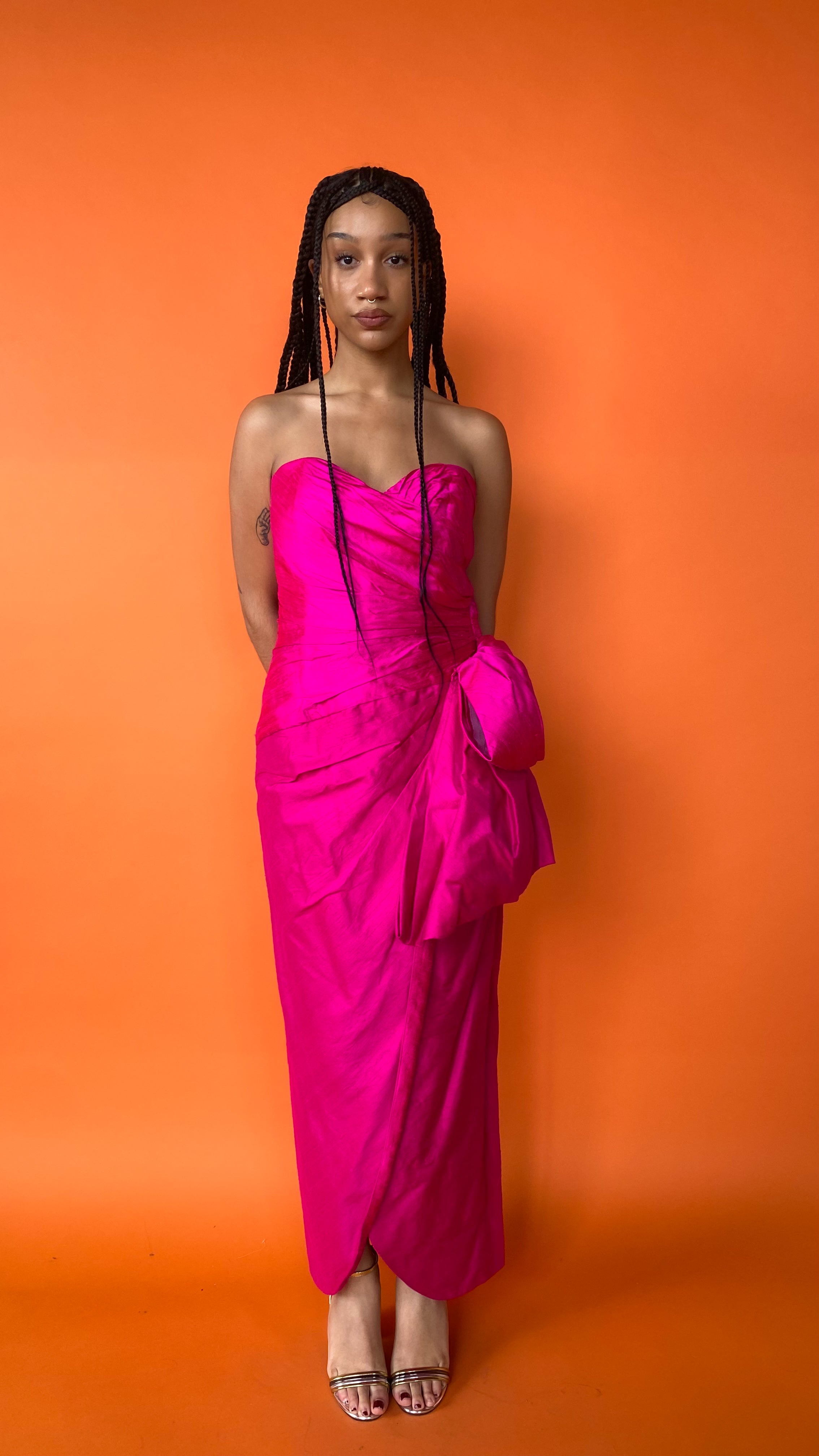 Description: Bold fuchsia strapless sweetheart neckline dress with ruching details and large bow on left hip. Dramatic slit up left side. Zipper down center back and boning in bodice for structure.