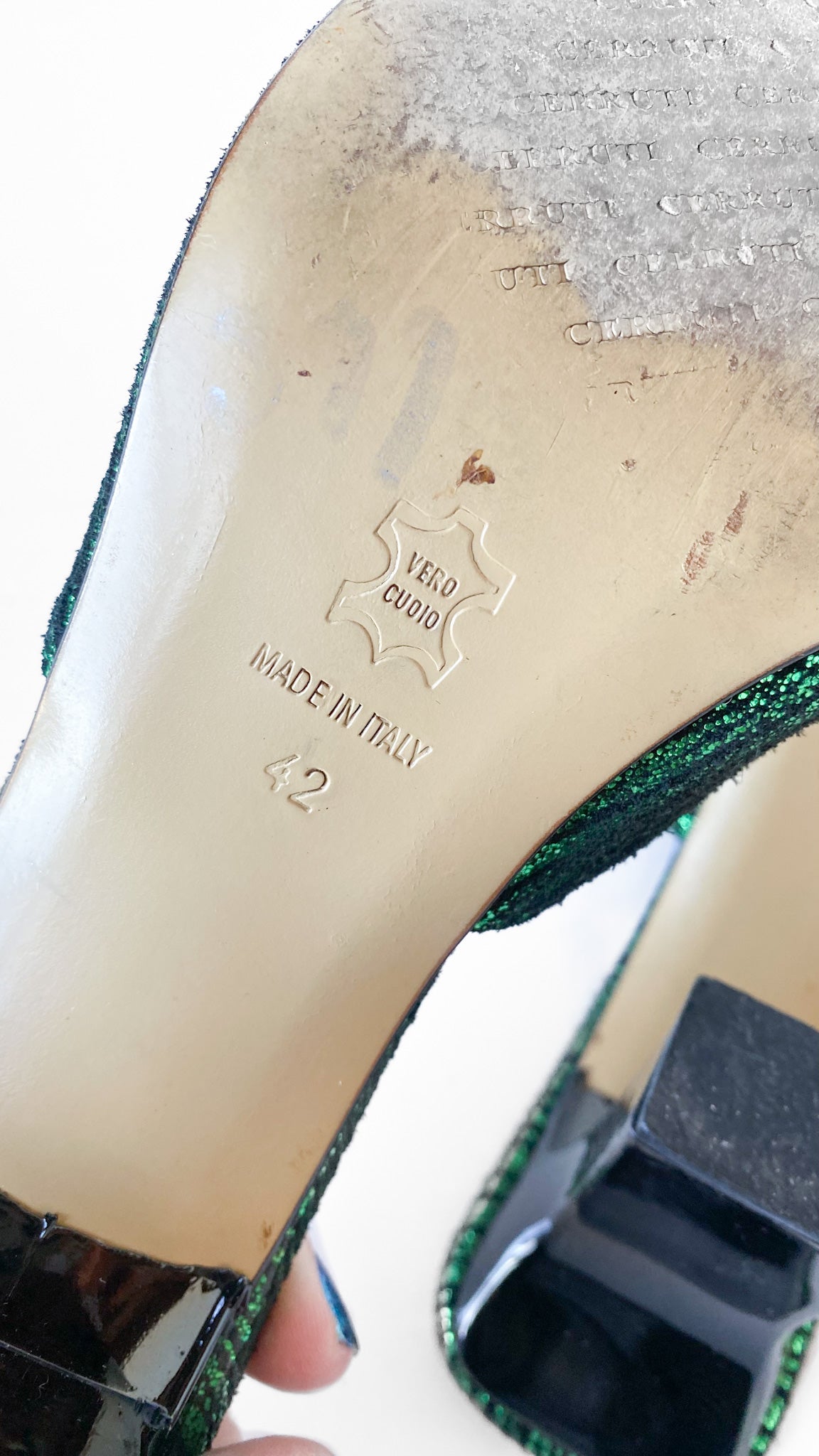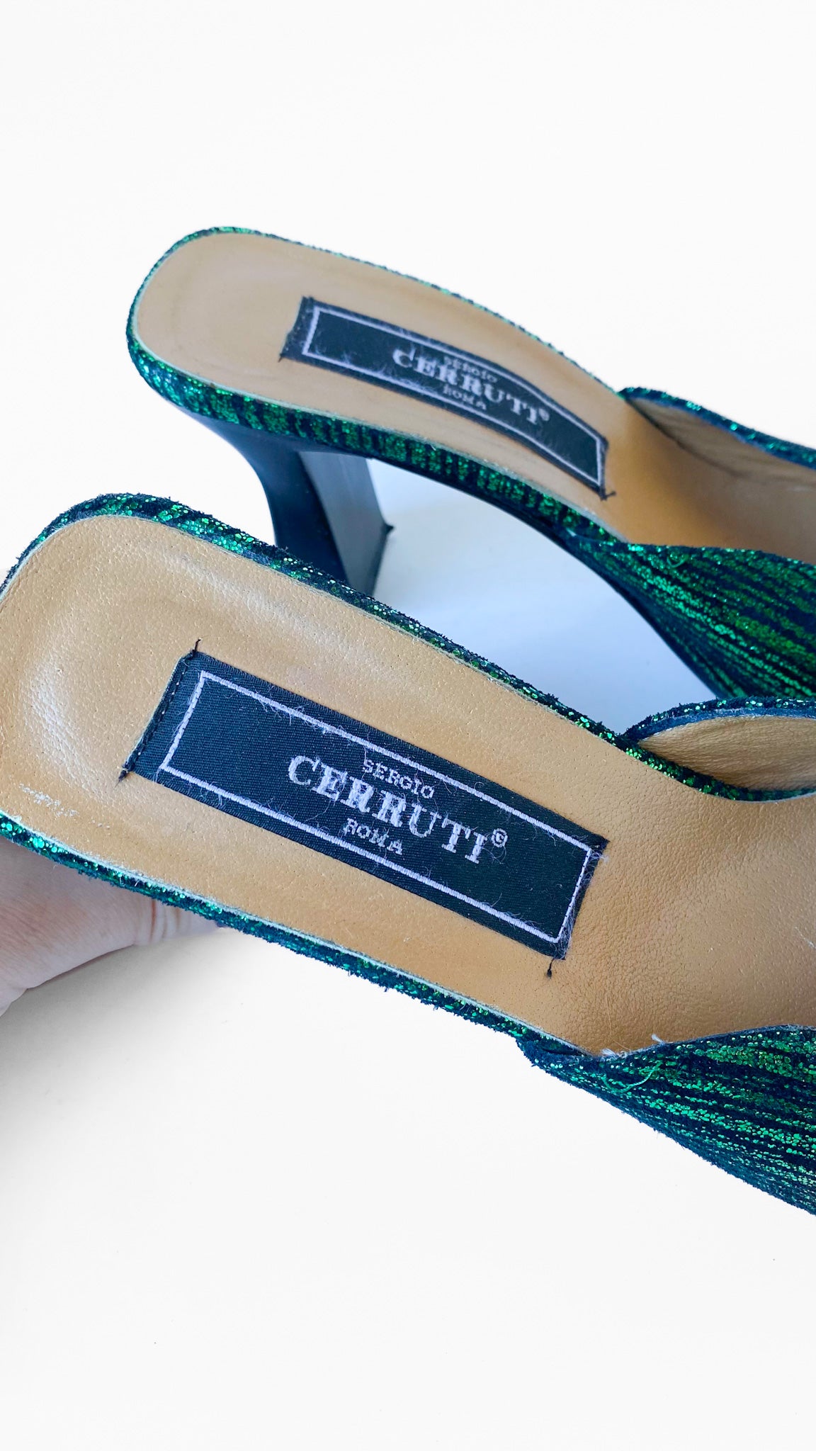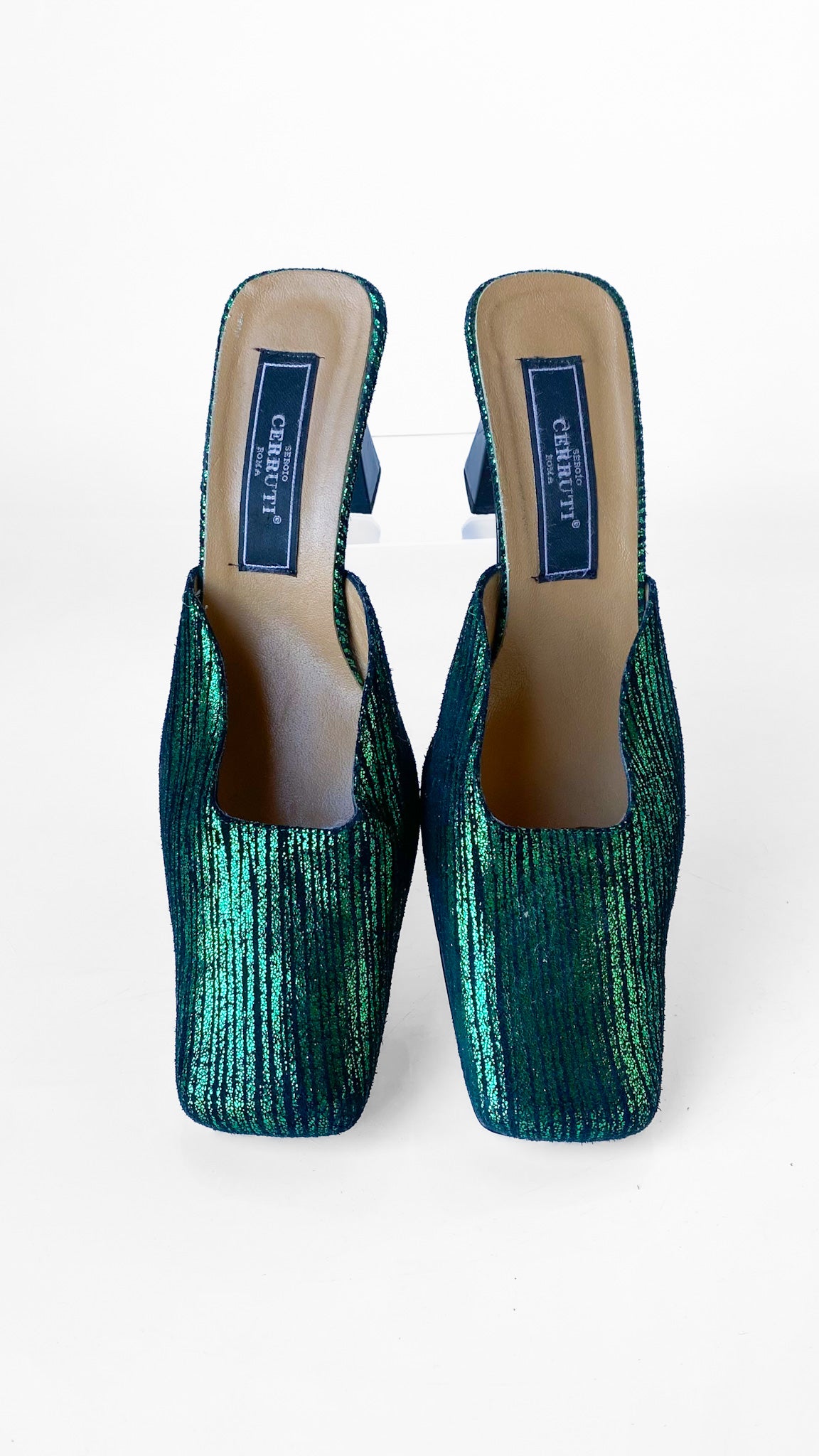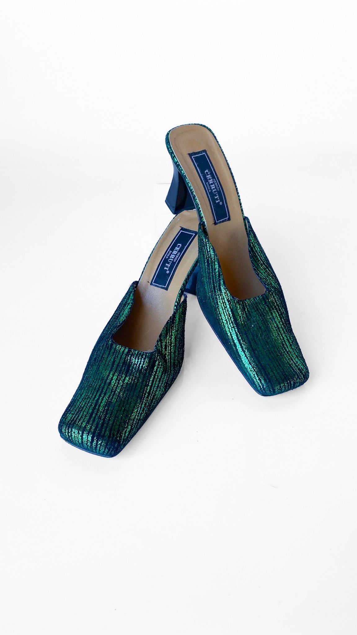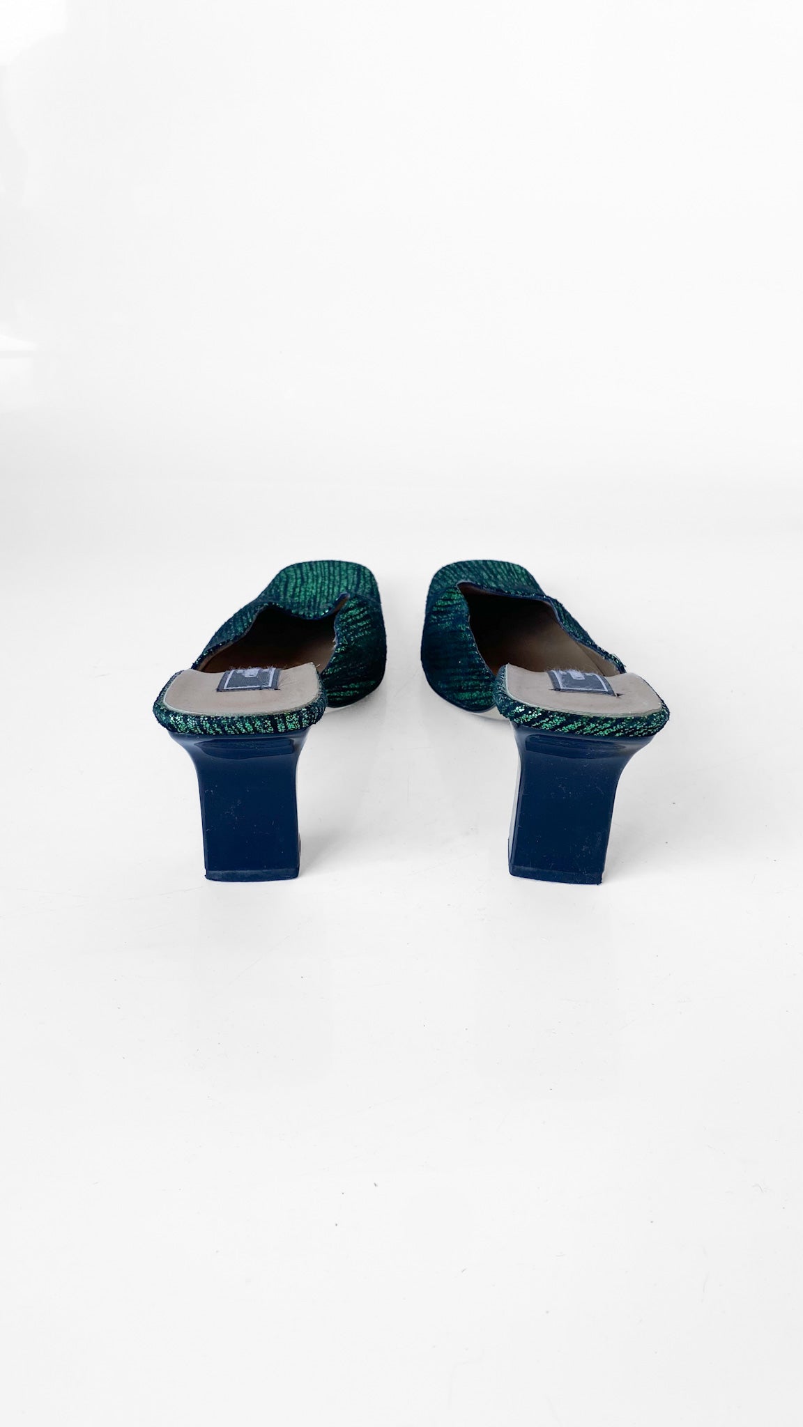 Description: Metallic emerald green and black suede square toed mule heels. Black acrylic heel.