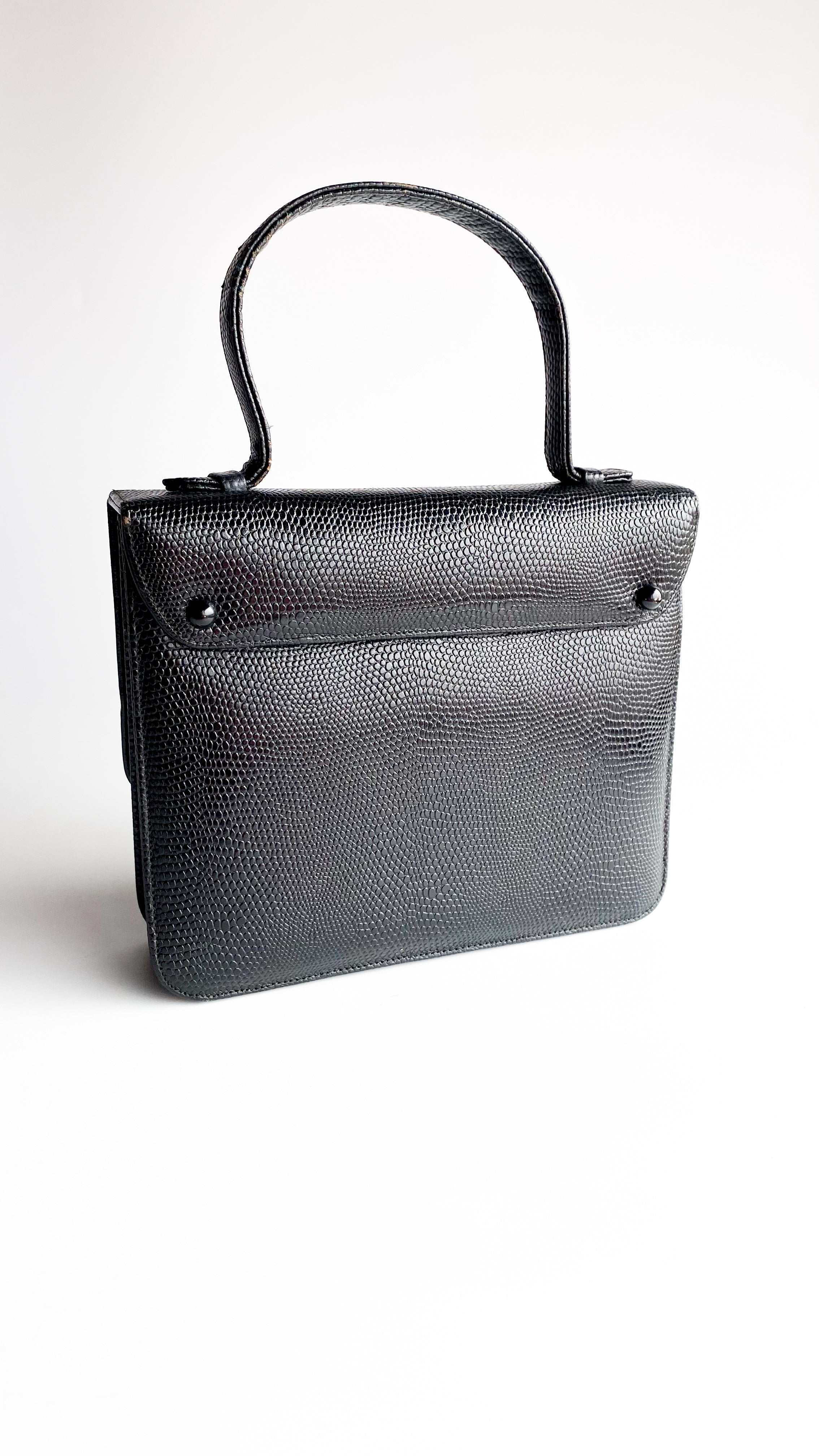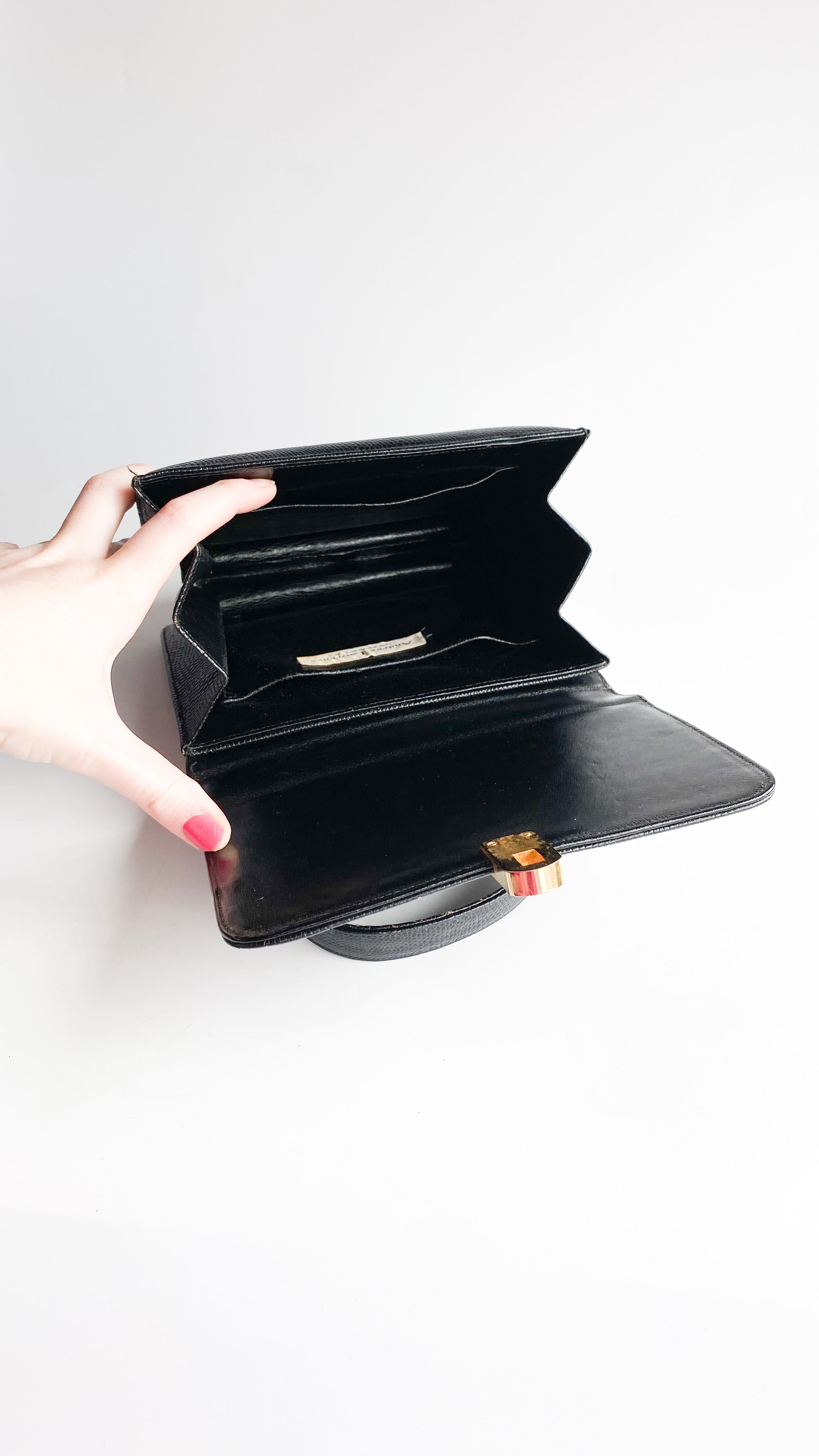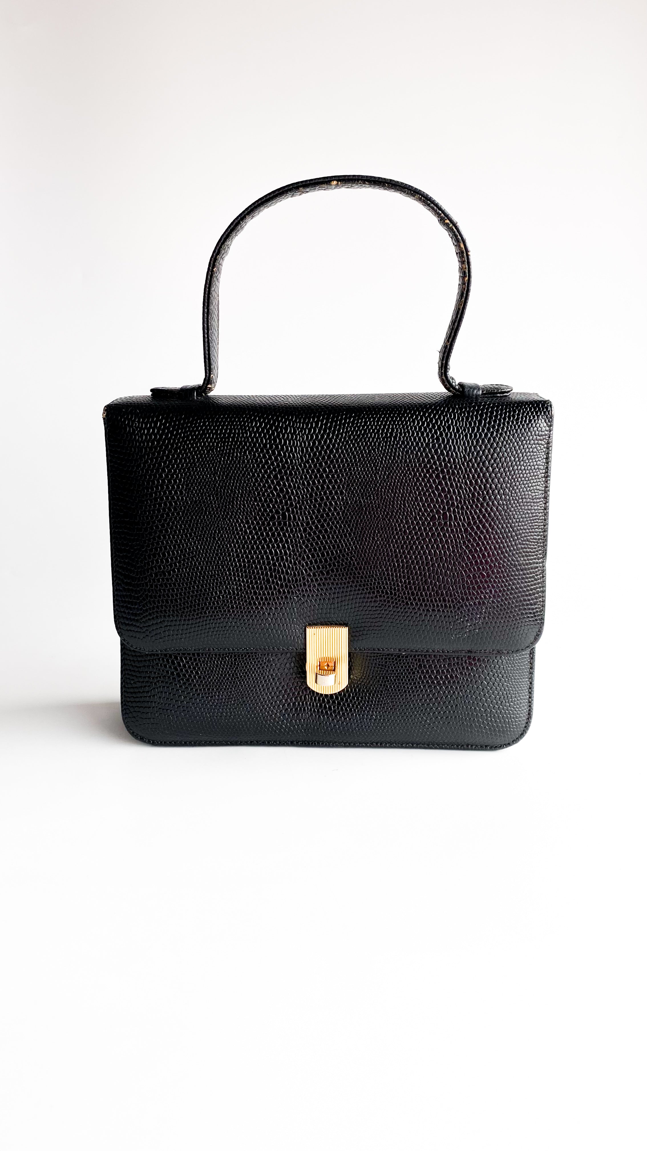 Description: Elegant small black handbag with one handle and front flap with gold tone twist lock. Bag opens to one compartment that has two side pockets with no closure. Bag has snakeskin like texture throughout.