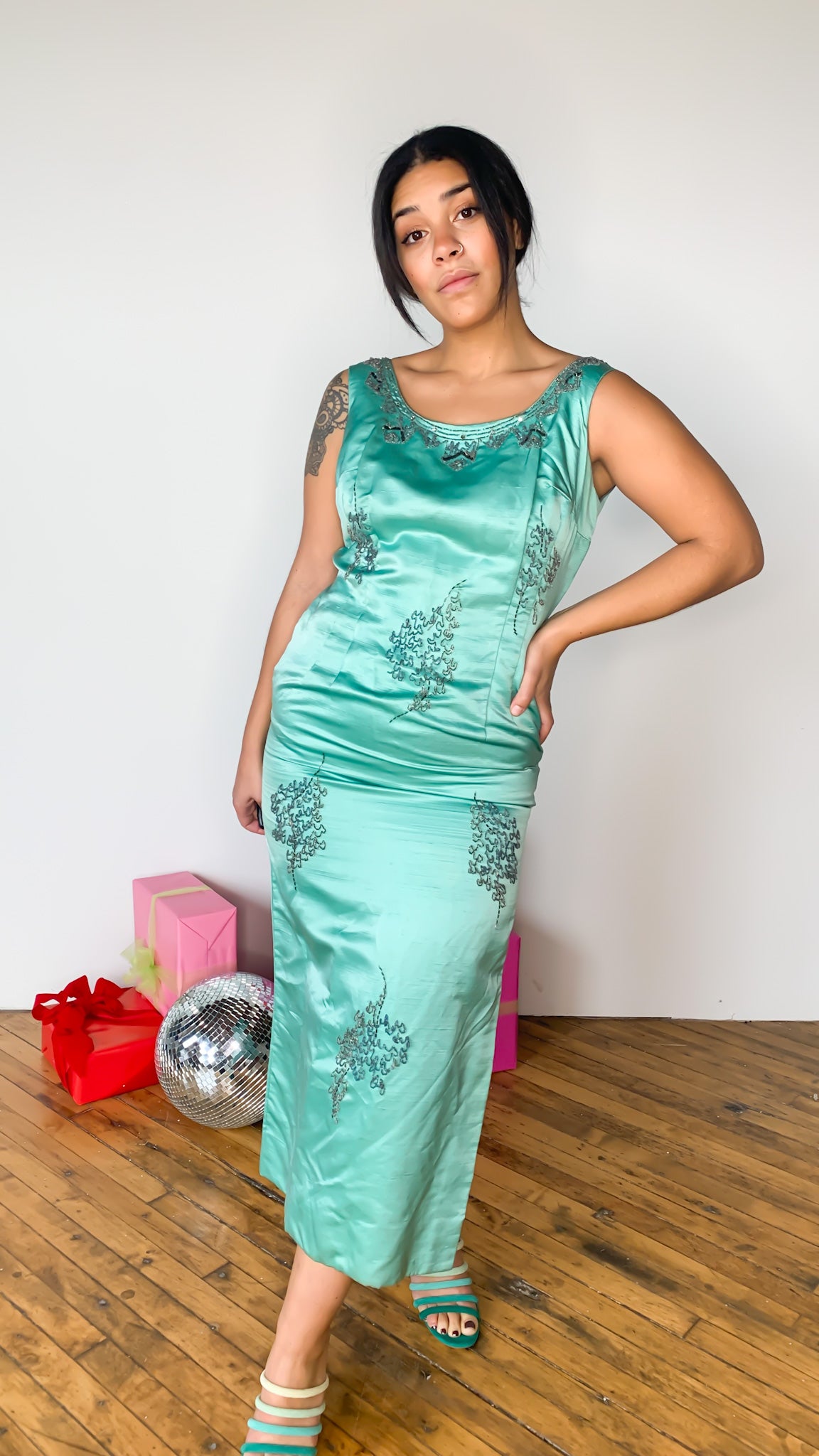 Beautiful seafoam colored gown decorated with silver and blue beads. Slit on one side. Lined throughout. Zipper closure on back. *as is, some beads missing