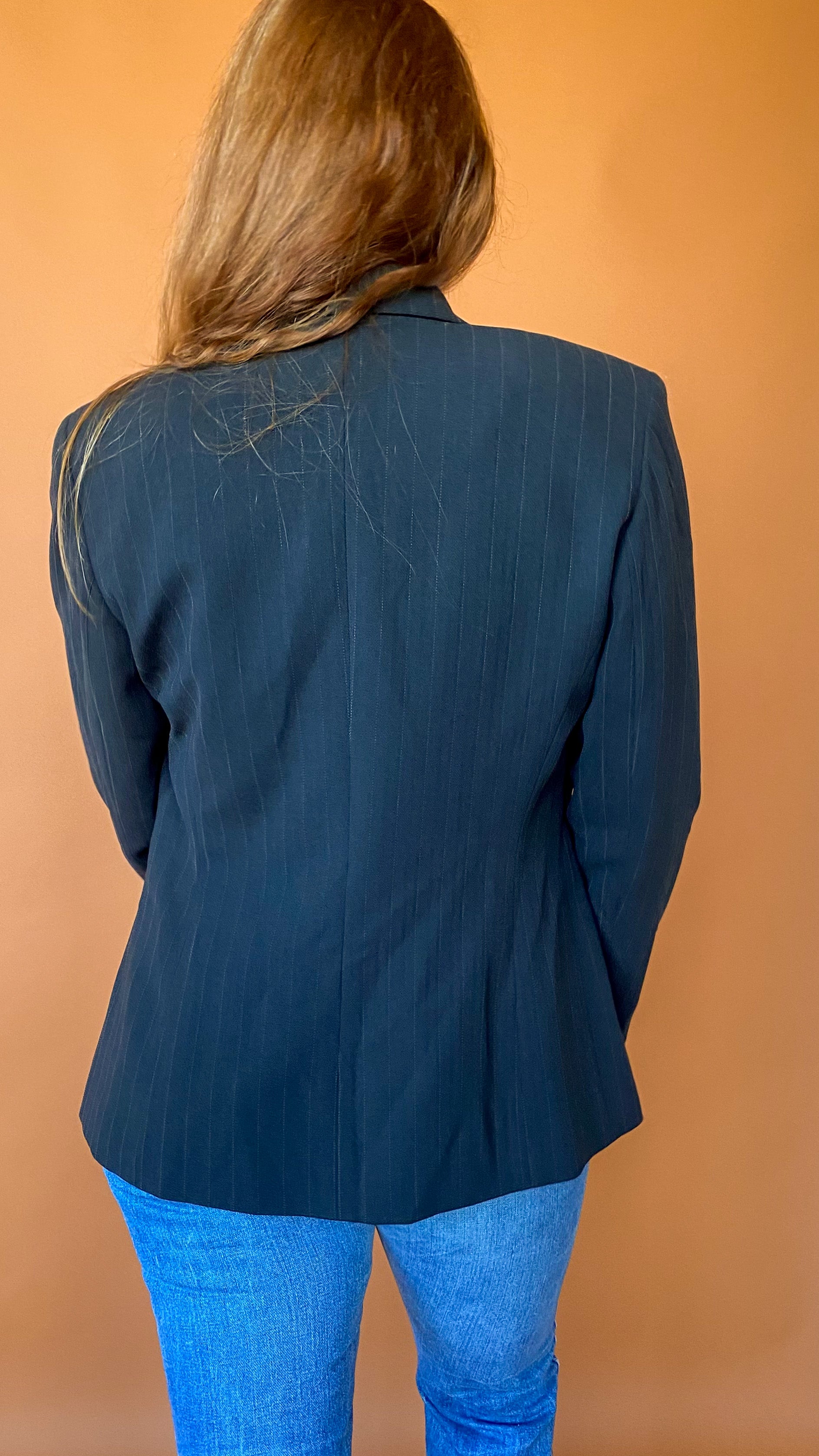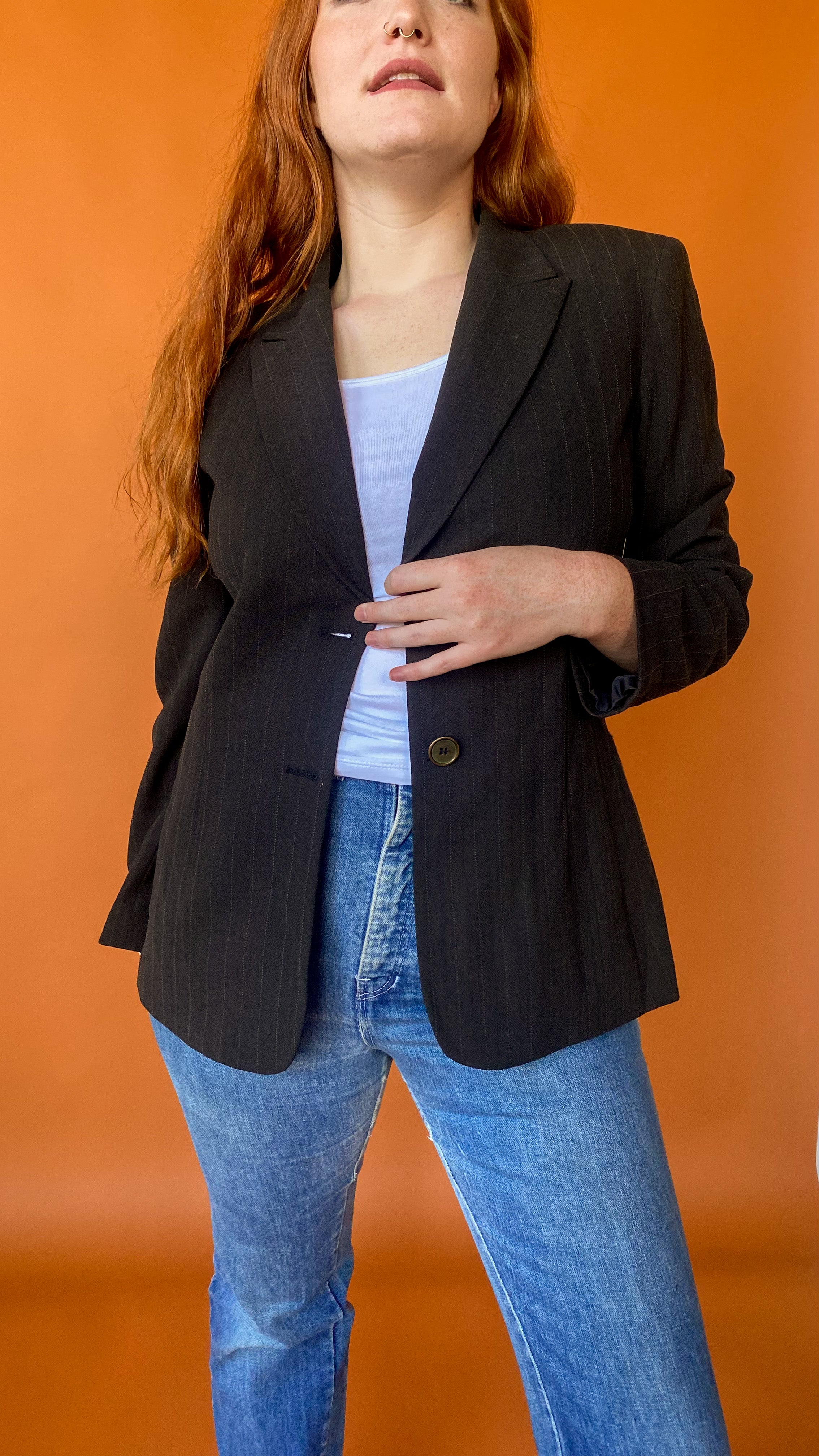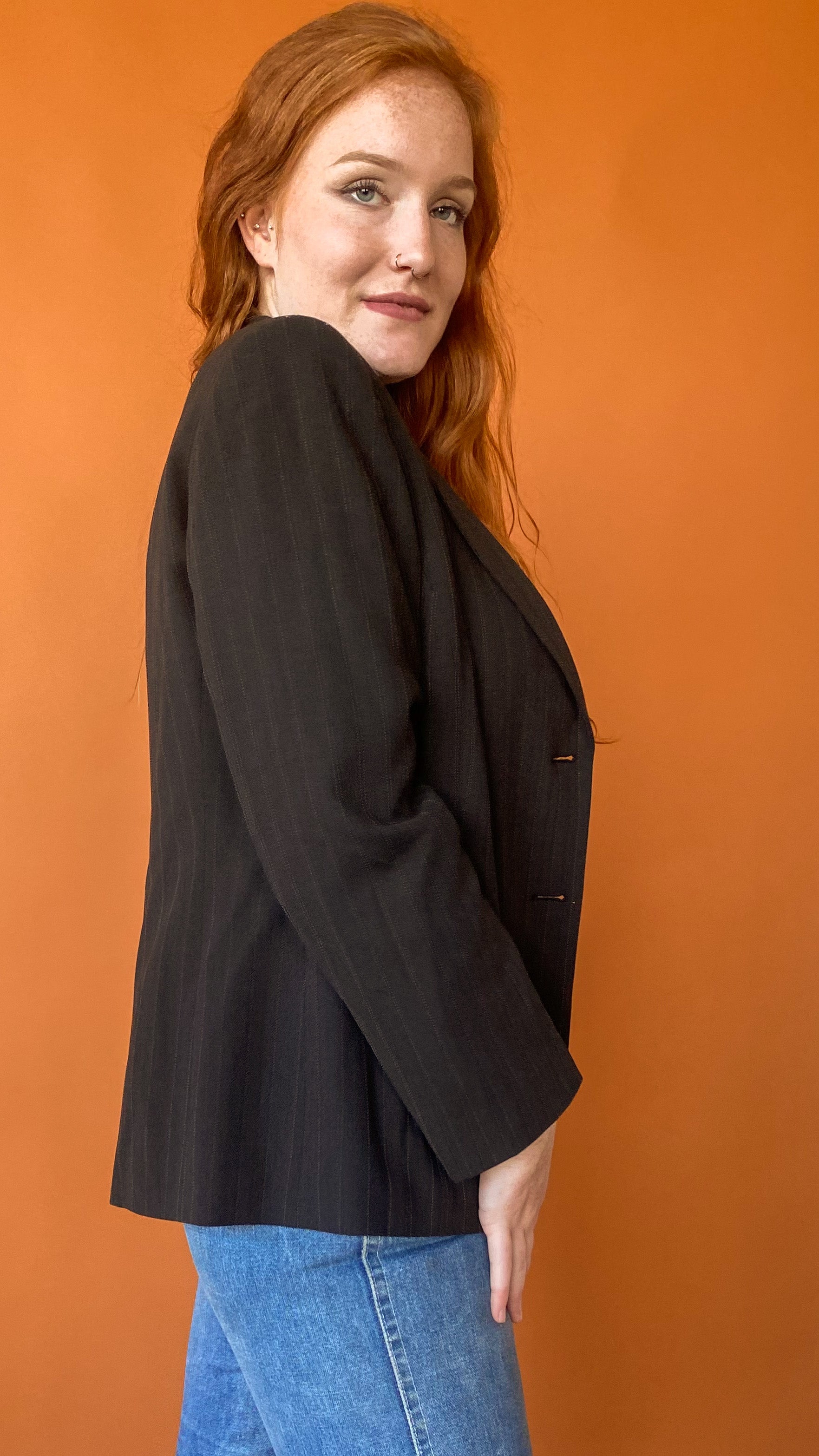 Dark gray blazer with tan vertical stripes; has button closure, shoulder pads.
