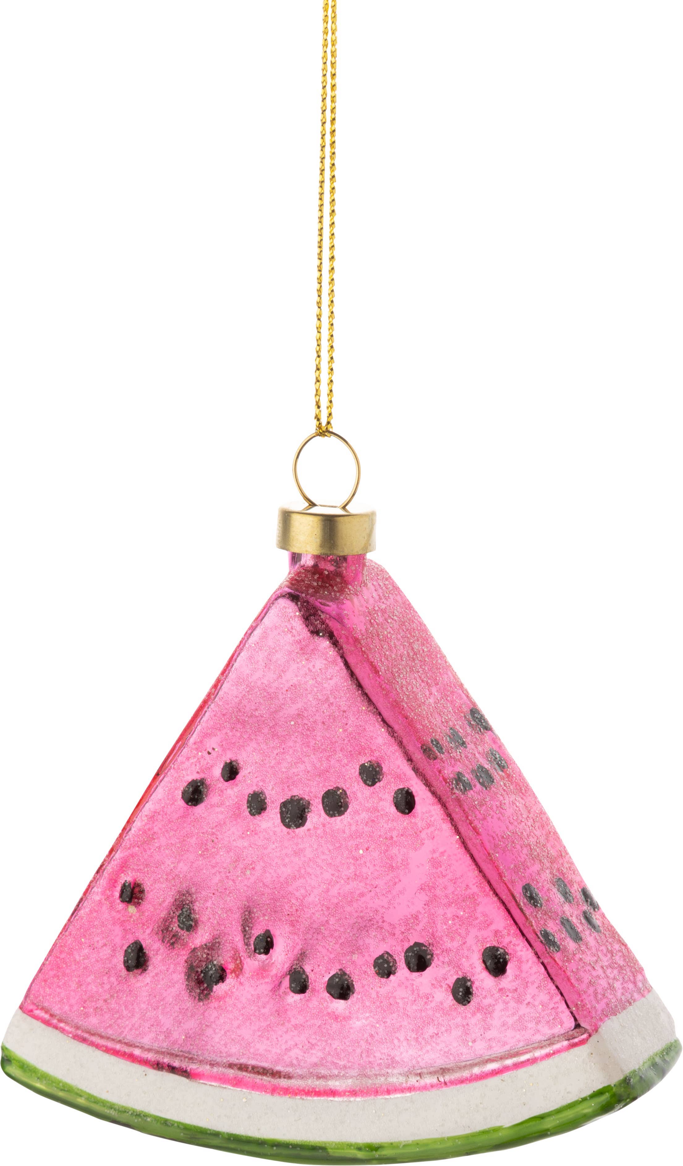Glass watermelon slice ornament, 3.5 in. Please note that due to the nature of the materials, slight color variations may occur between individual items and compared to images. These differences are minimal and do not affect the overall appearance.