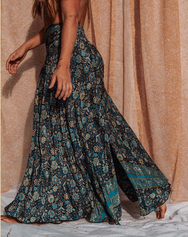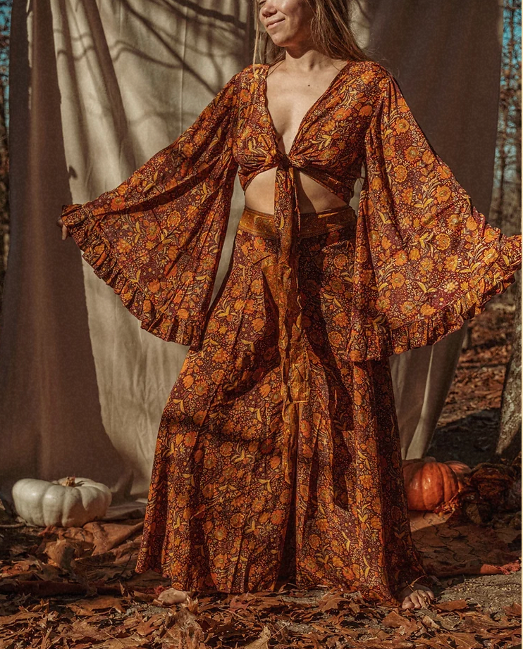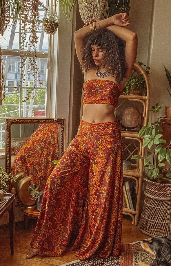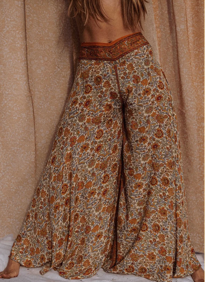 Silk free-spirit flowy bell bottom pants! High waisted super flowy fit! Elastic waist on the back for adjusted fit.