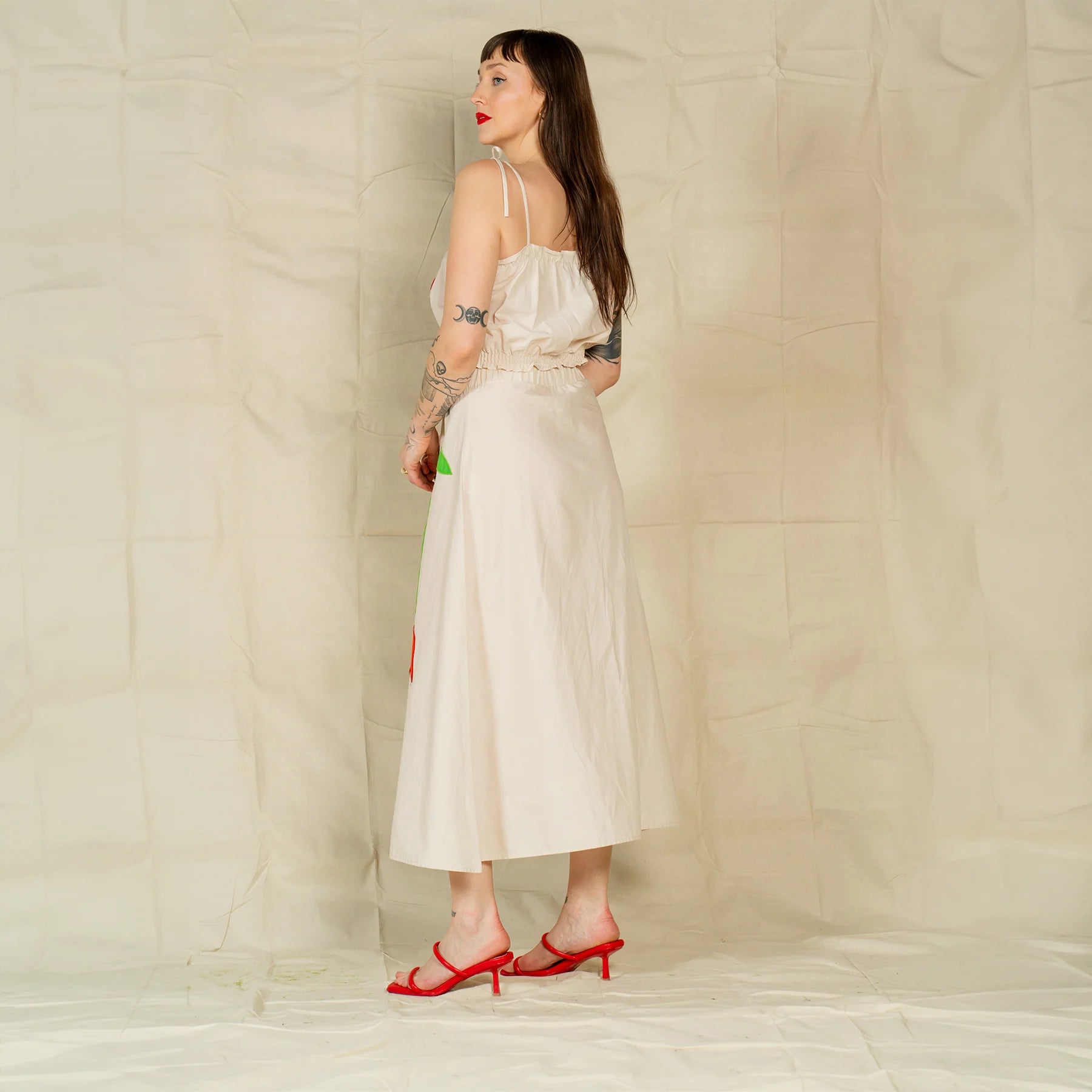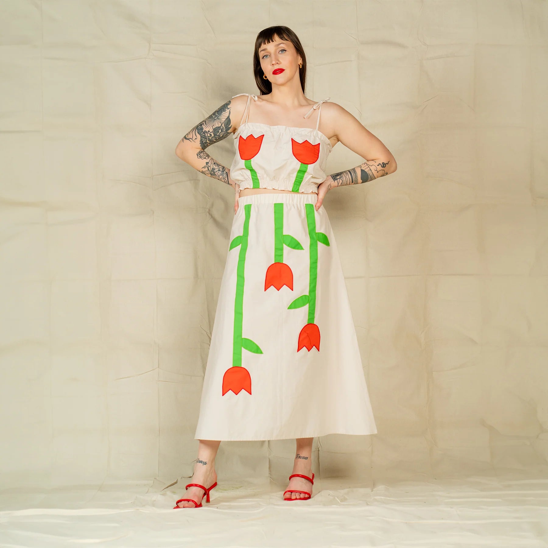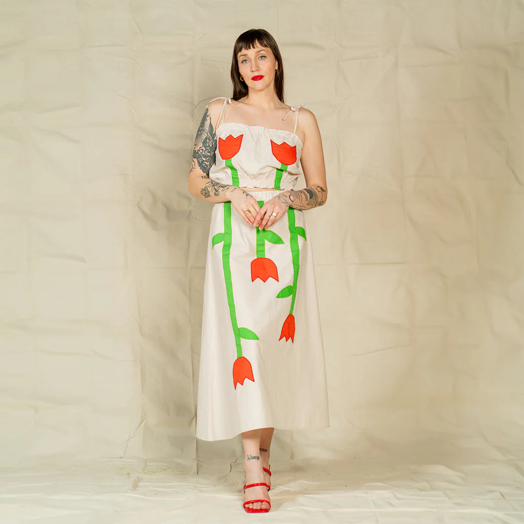 The Isabelle Skirt is an easy and effortless spring staple that makes a statement. Adorned with embroidered/ applique tulips, this novelty piece brings more to the table than comfort and ease! Size Inclusive and made of 100% cotton the Isabelle skirt is perfect for any summer outing. The elastic waistband is just an added plus!