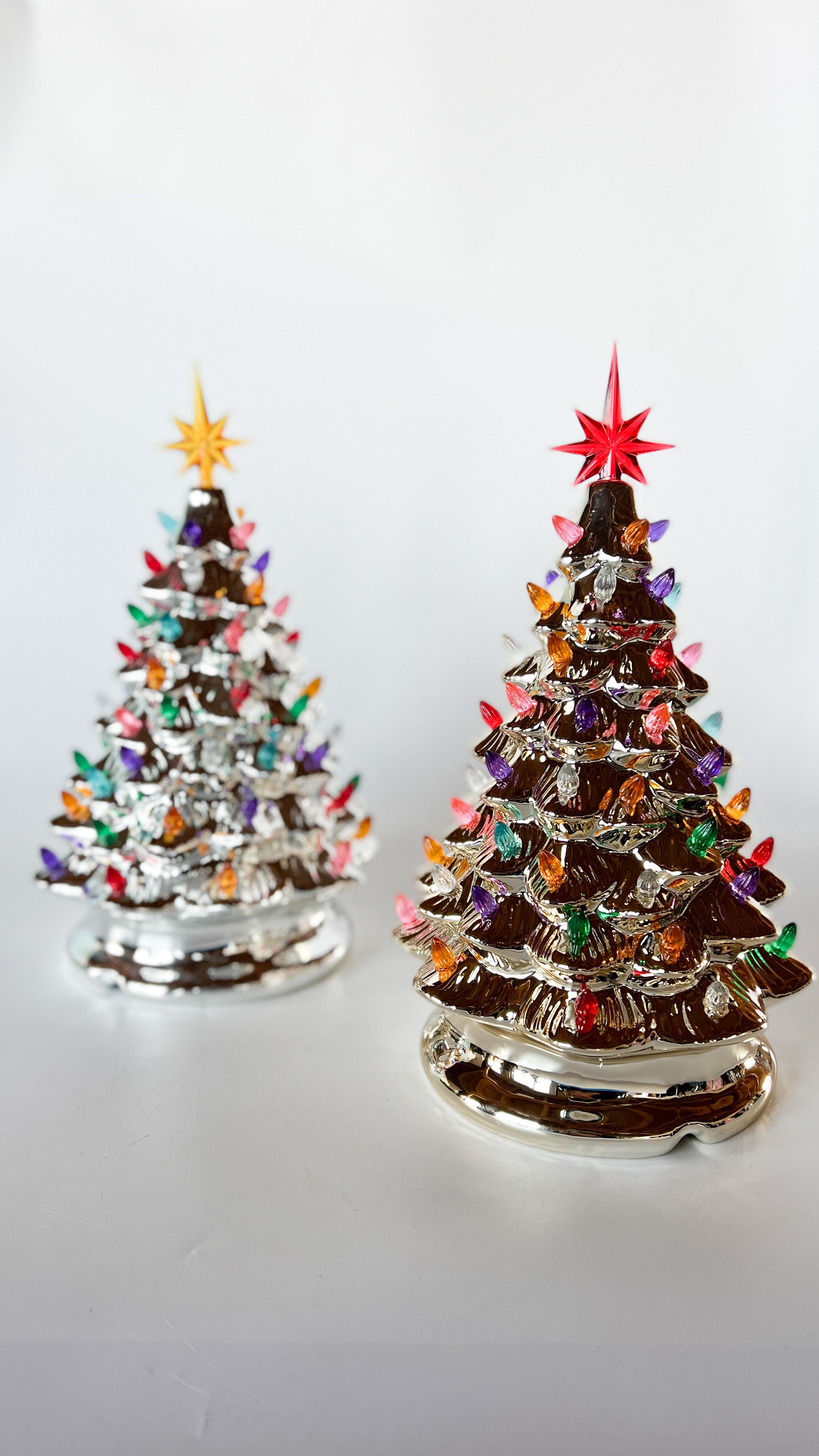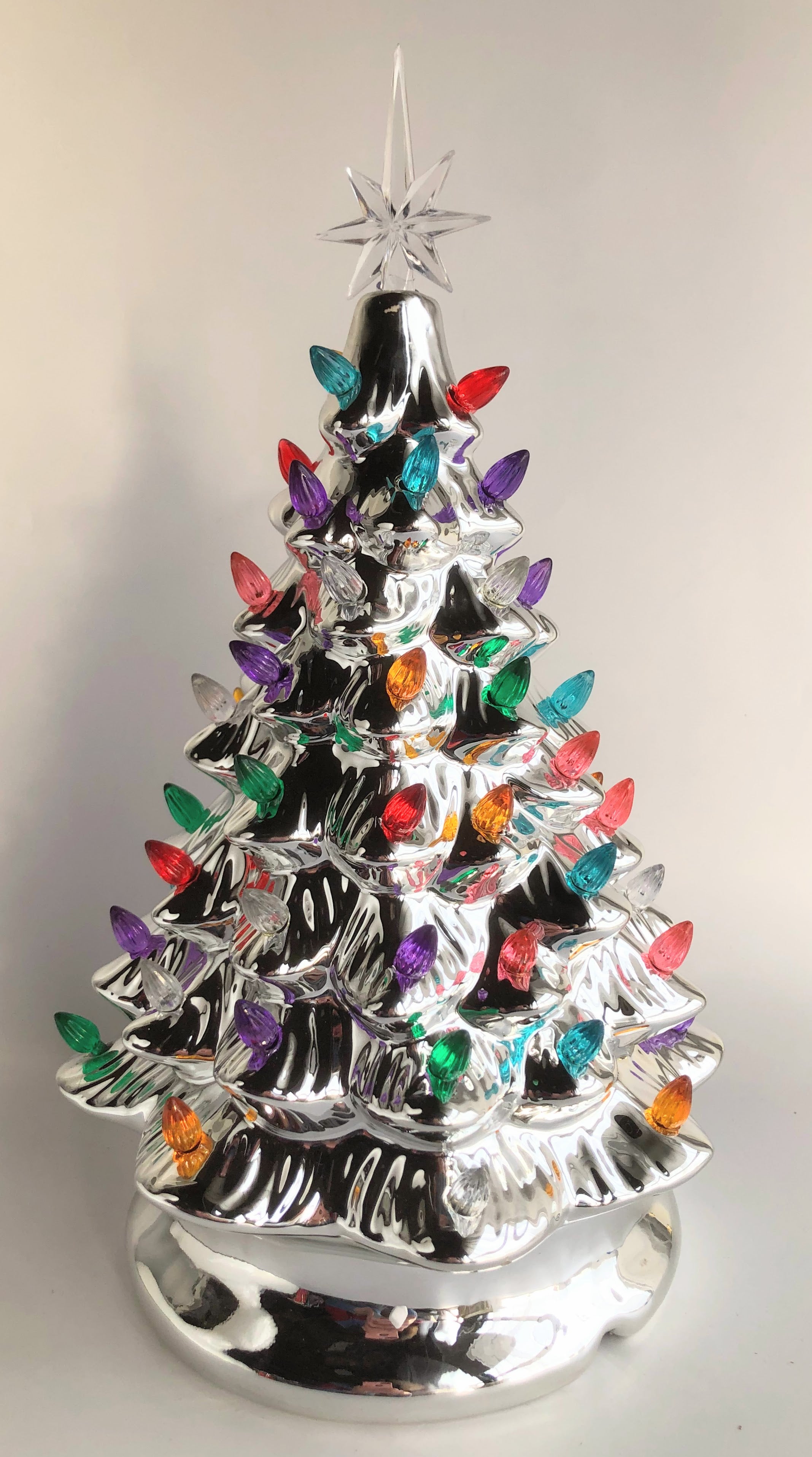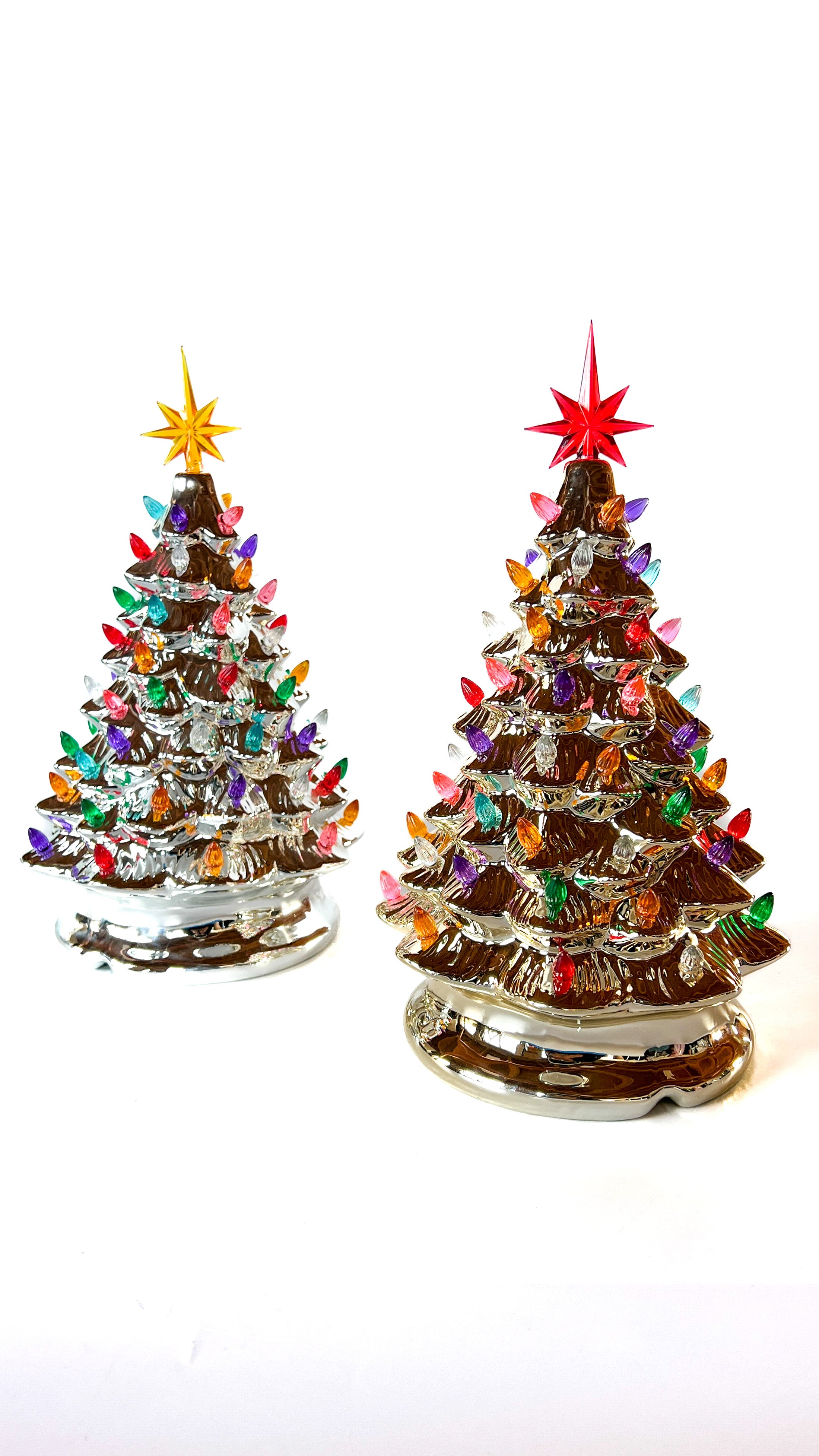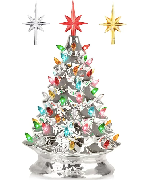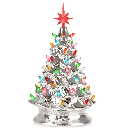 15-Inch silver ceramic Christmas decorative tree is a timeless holiday decoration. Made from only the finest ceramics, hand painted and handcrafted with extra-attention to the finest of details, this pre-lit tree will transform your home, preserving that cozy atmosphere but bringing the festive factor. Each and every ceramic Christmas Tree has 50 or more multiple color beads, each with a powerful LED light inside. Although small, this Christmas tree will shine bright, lighting up any room in your house within seconds. Three different tree topper options included.