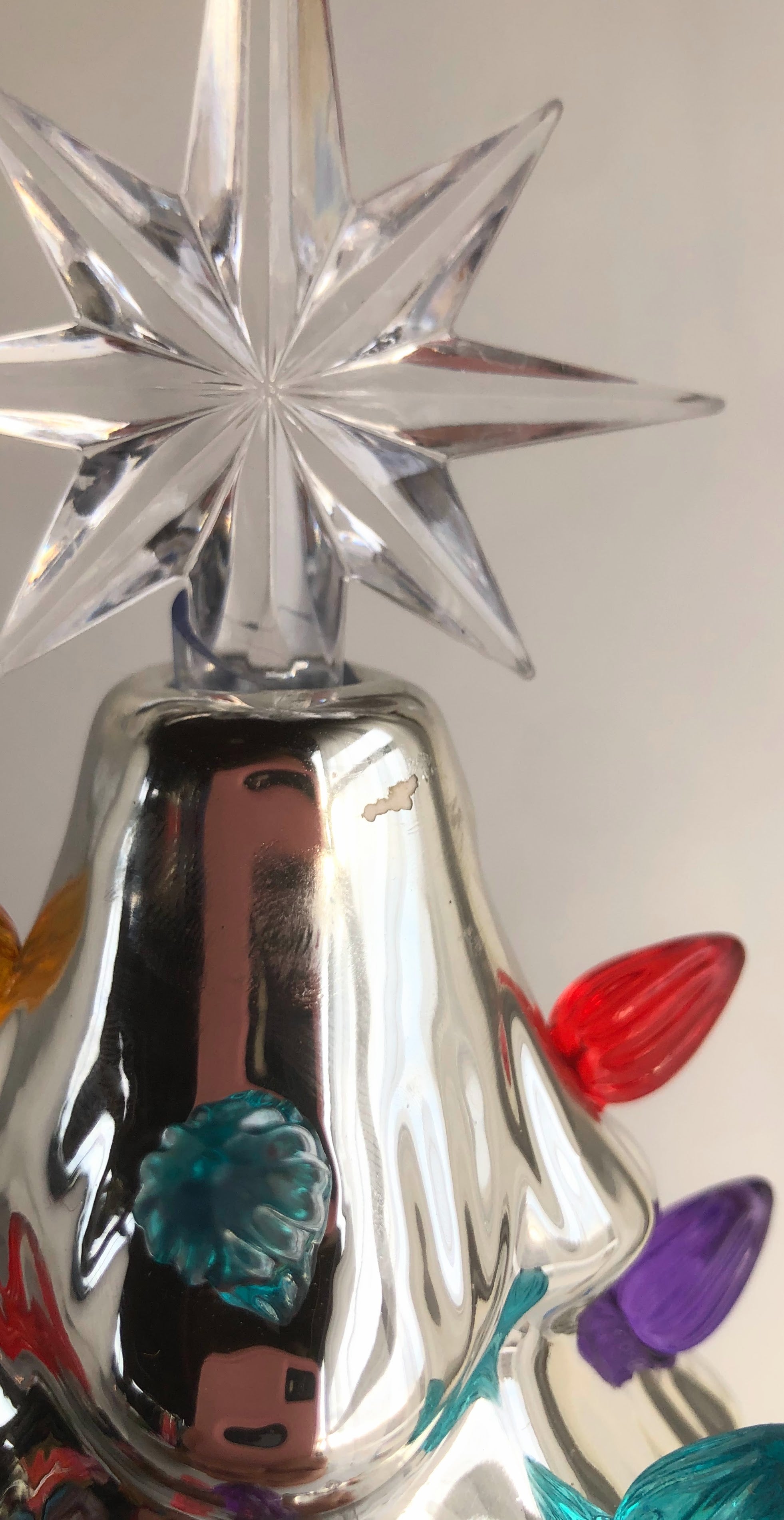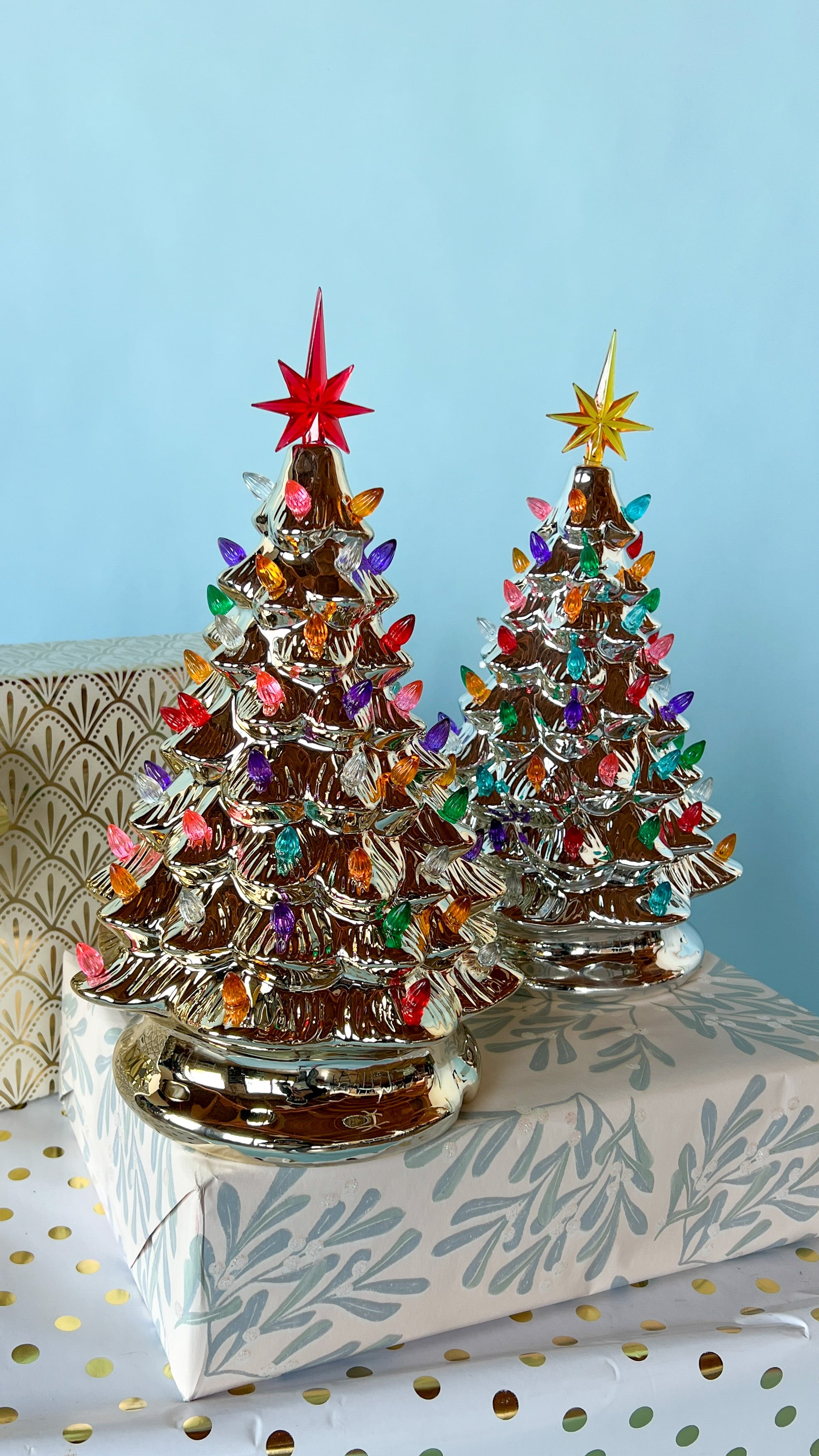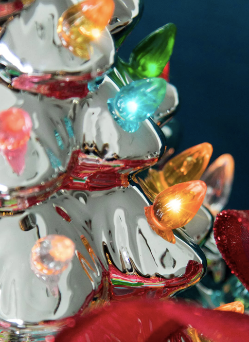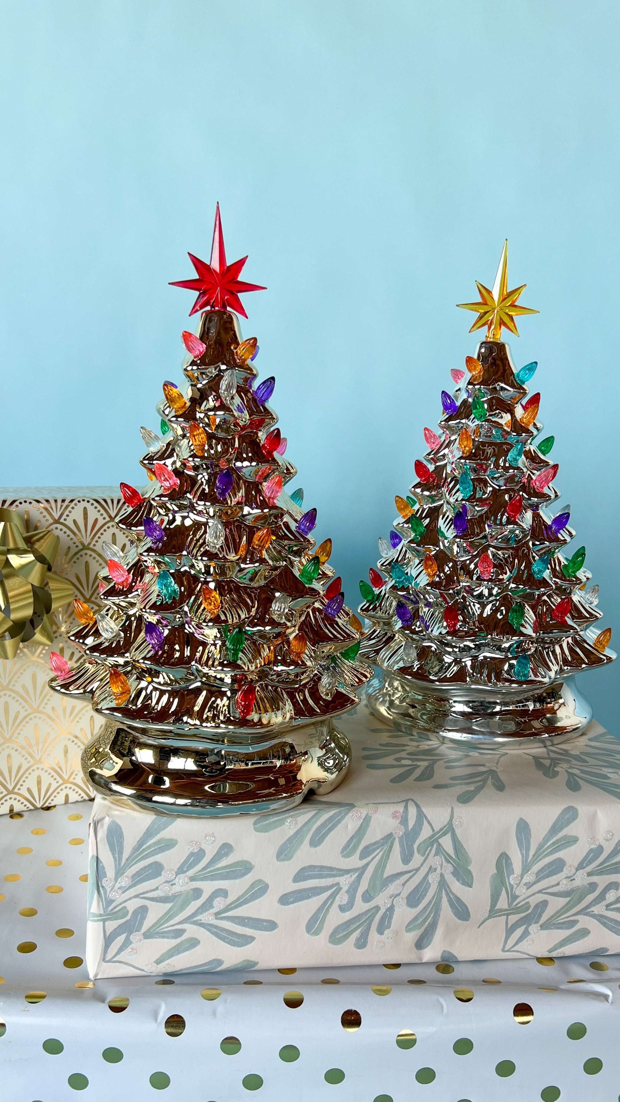 15-Inch silver ceramic Christmas decorative tree is a timeless holiday decoration. Made from only the finest ceramics, hand painted and handcrafted with extra-attention to the finest of details, this pre-lit tree will transform your home, preserving that cozy atmosphere but bringing the festive factor. Each and every ceramic Christmas Tree has 50 or more multiple color beads, each with a powerful LED light inside. Although small, this Christmas tree will shine bright, lighting up any room in your house within seconds. Three different tree topper options included.