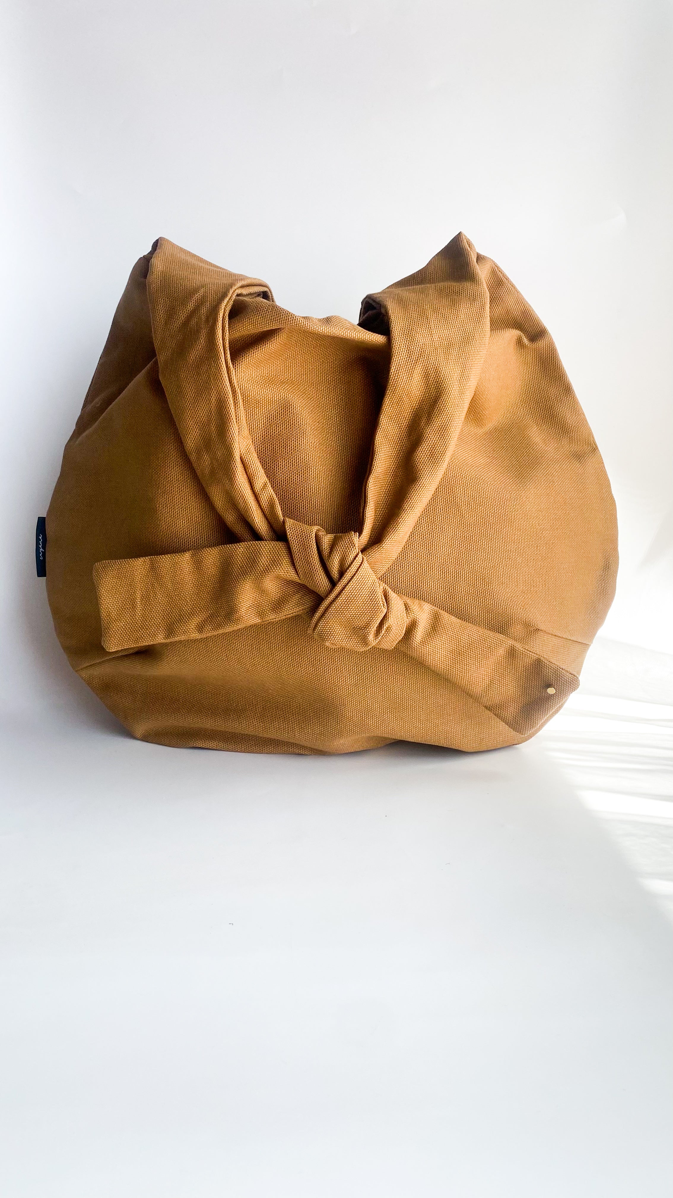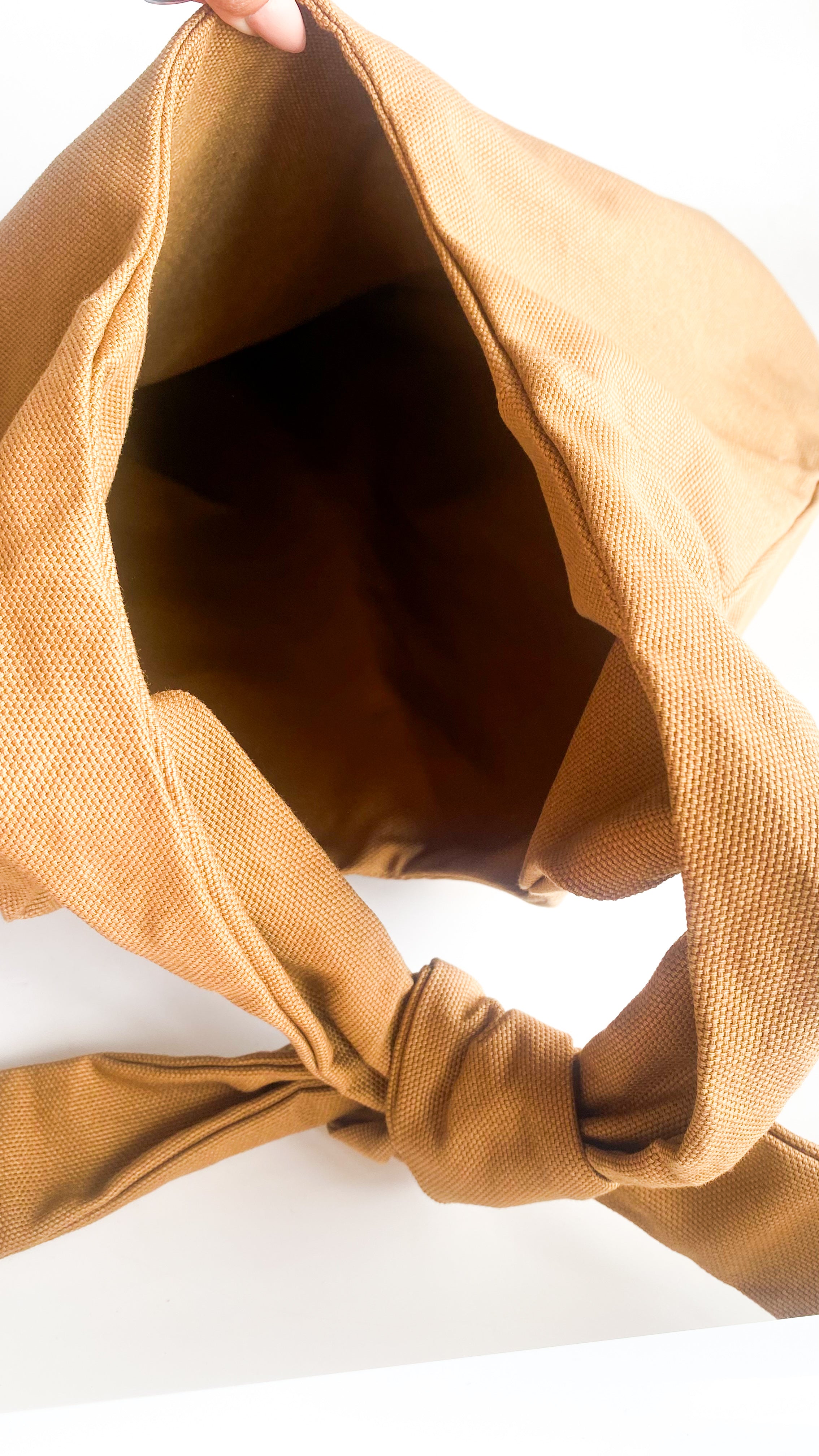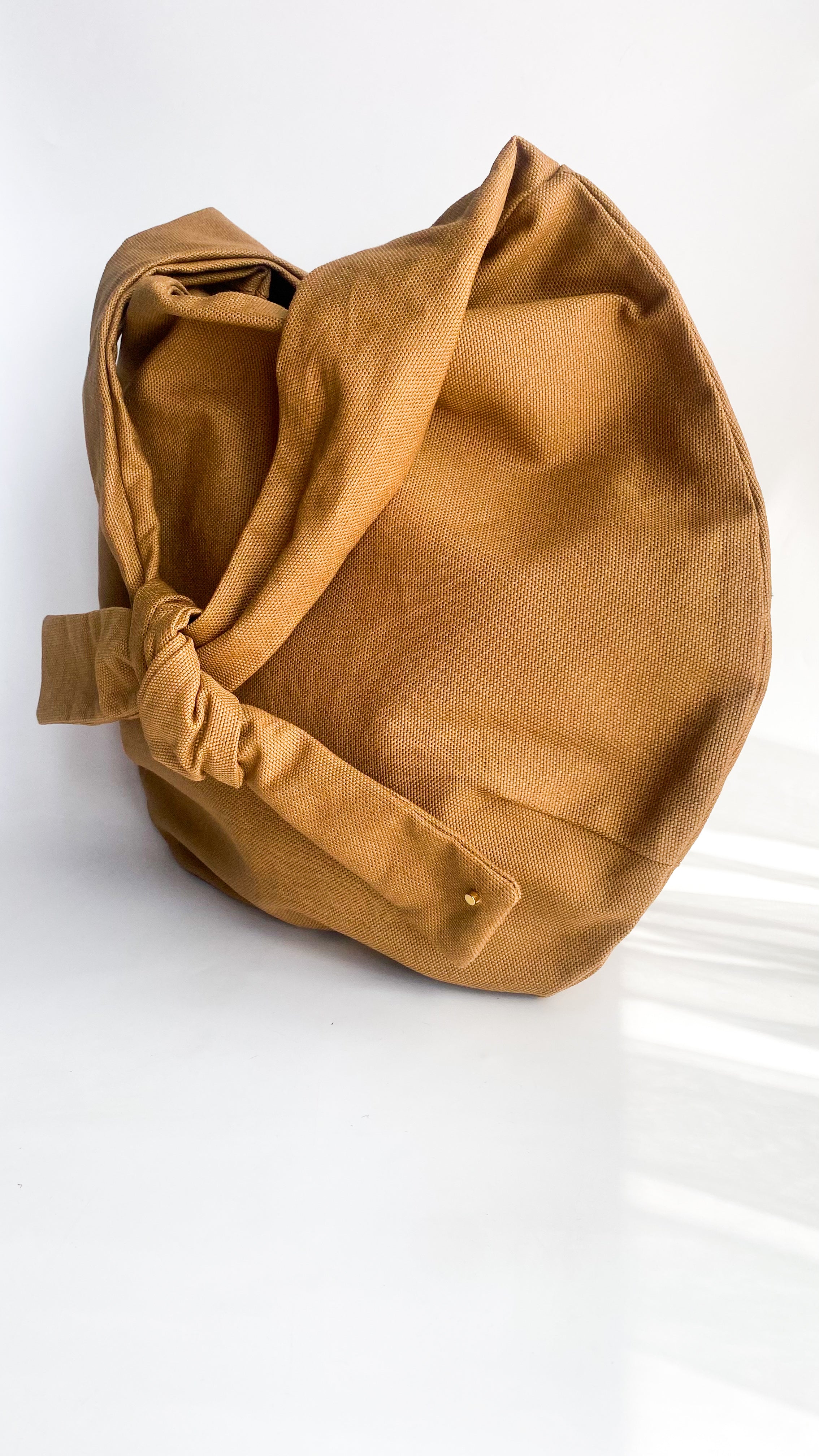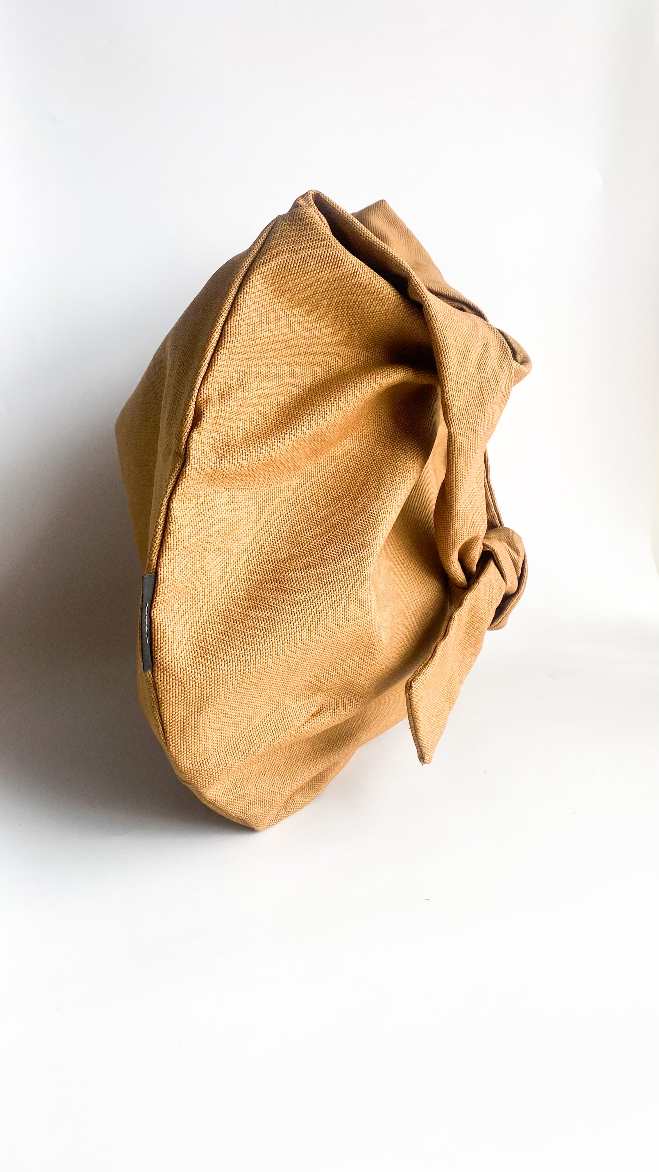 Description: Structured canvas bag with knotted handle; bag is fully lined with exterior fabric. There is no closure to main opening. Was a limited edition zero-waste market bag drop from Cuyana.
