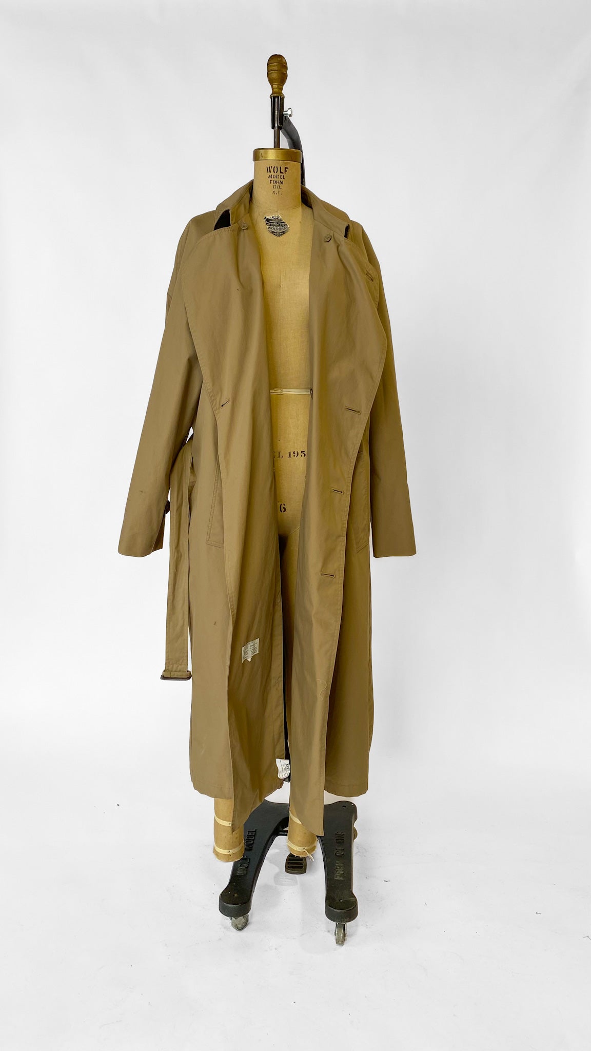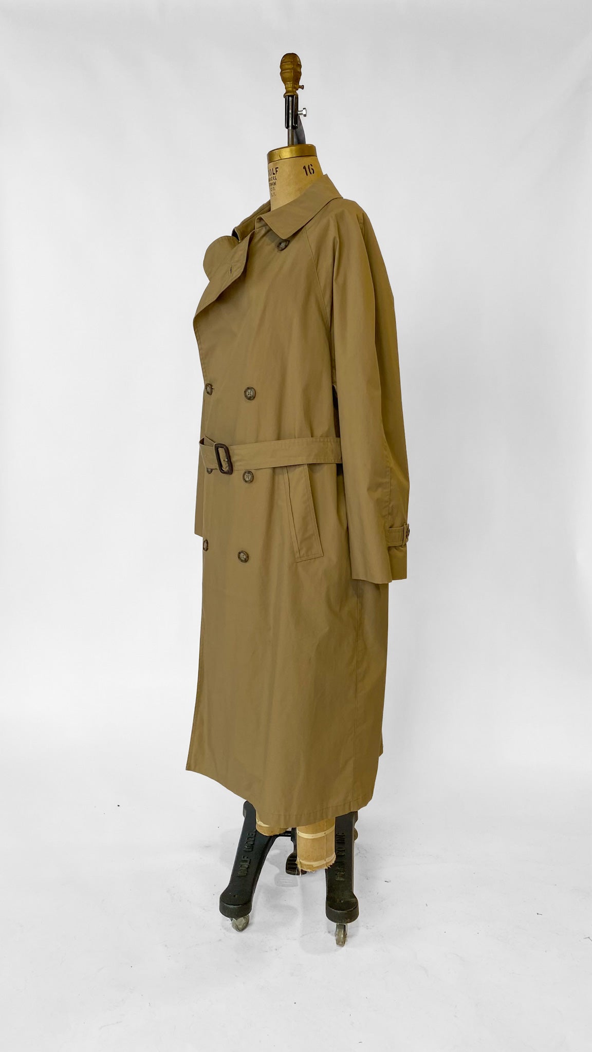 Classic double breasted khaki London Fog trench coat with belt and vent in back. Inset pockets.