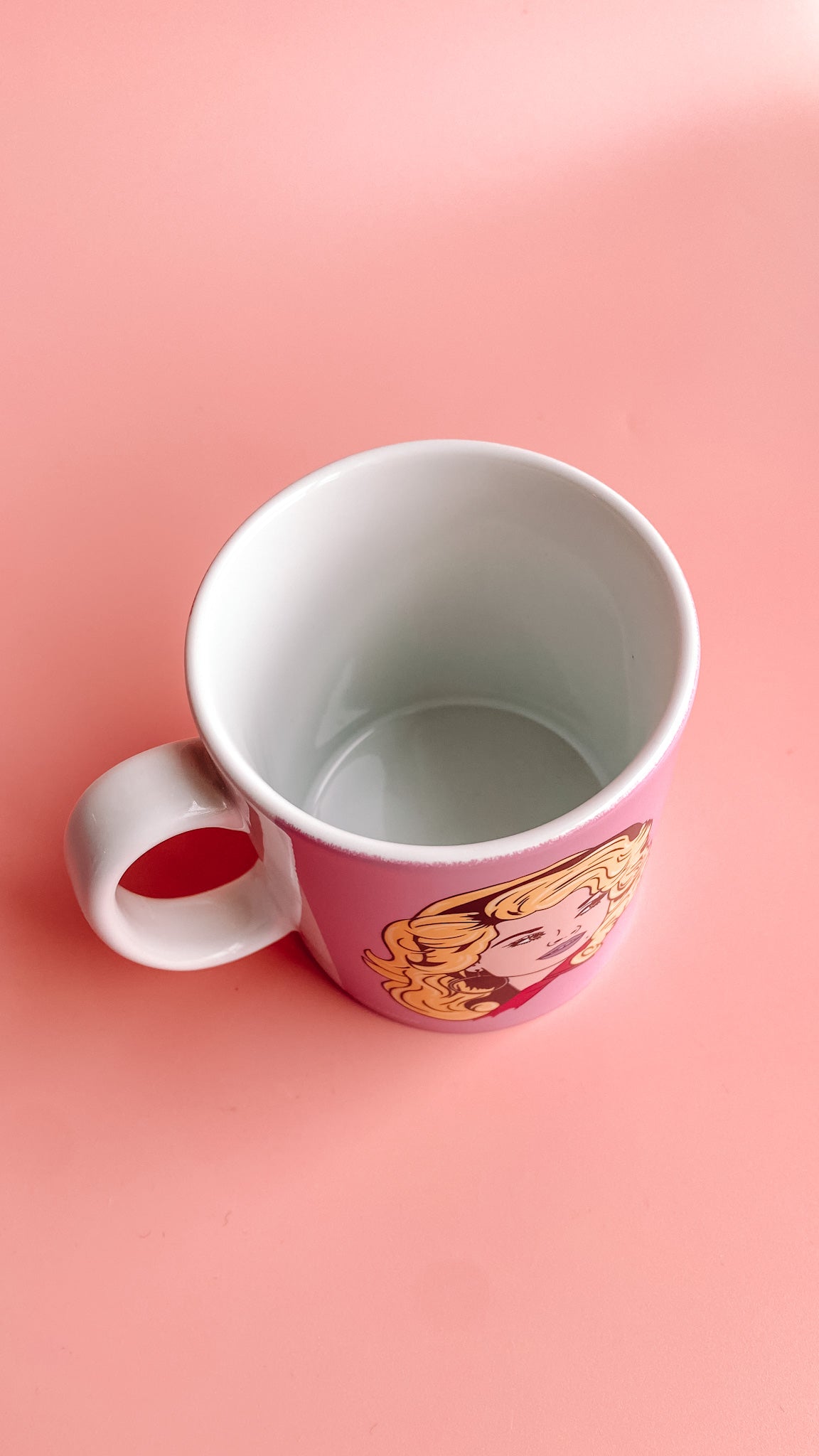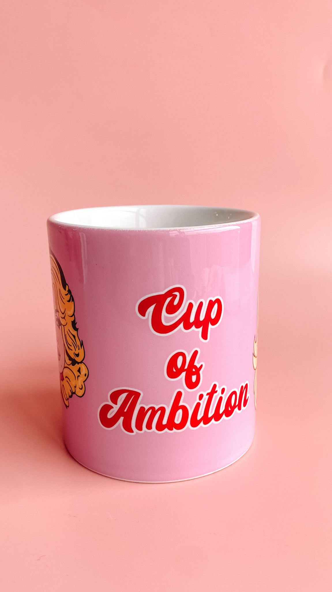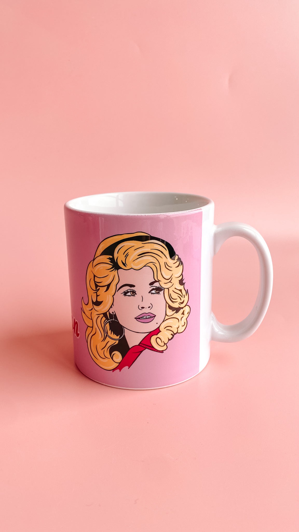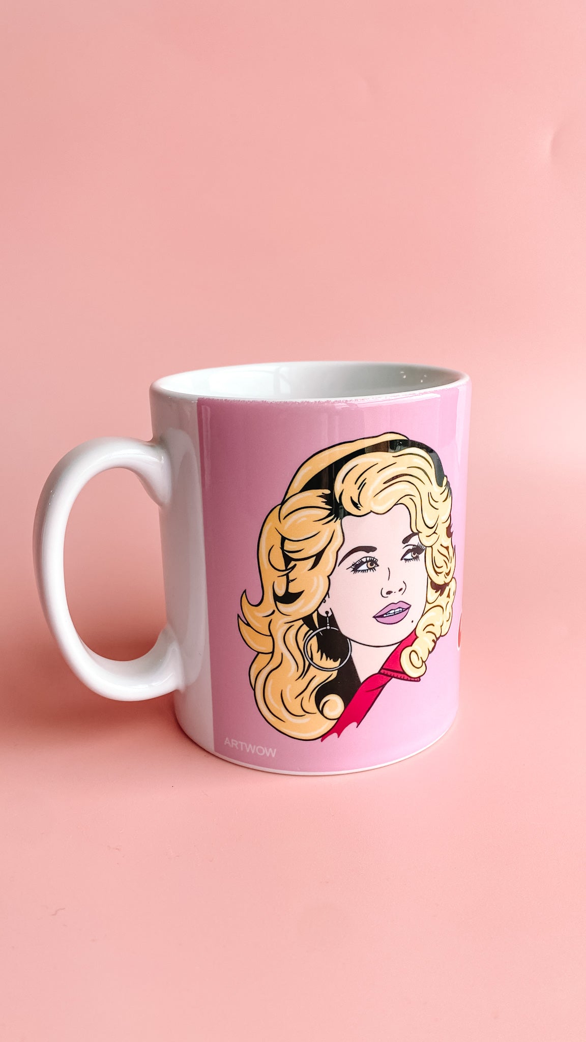 - Light pink and white ceramic mug of Dolly Parton that reads "Cup of Ambition" in a retro script.
