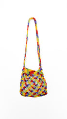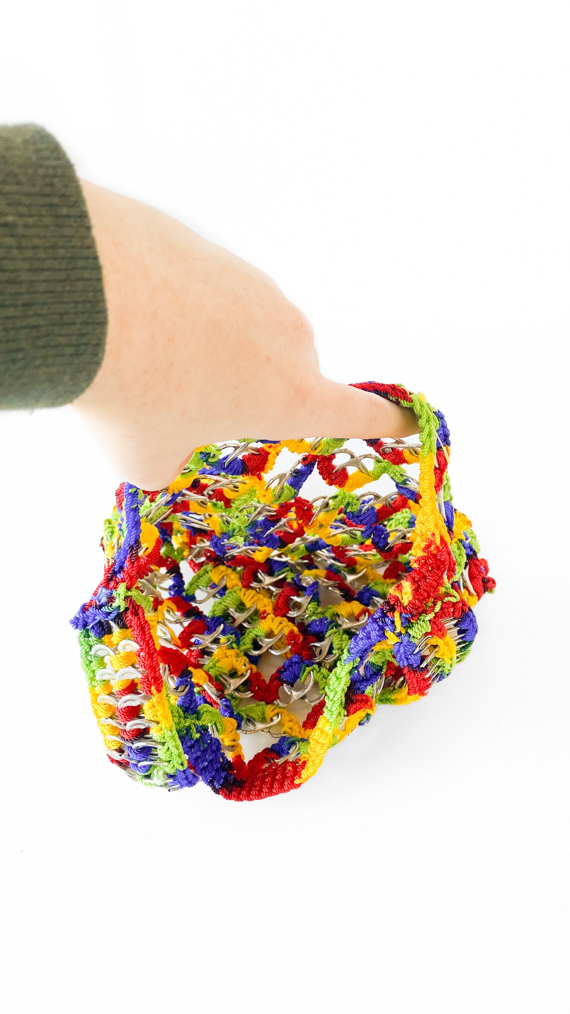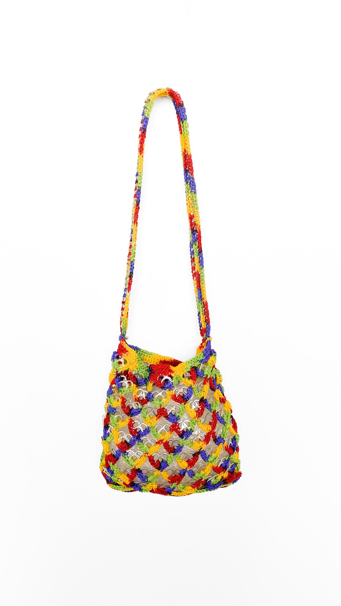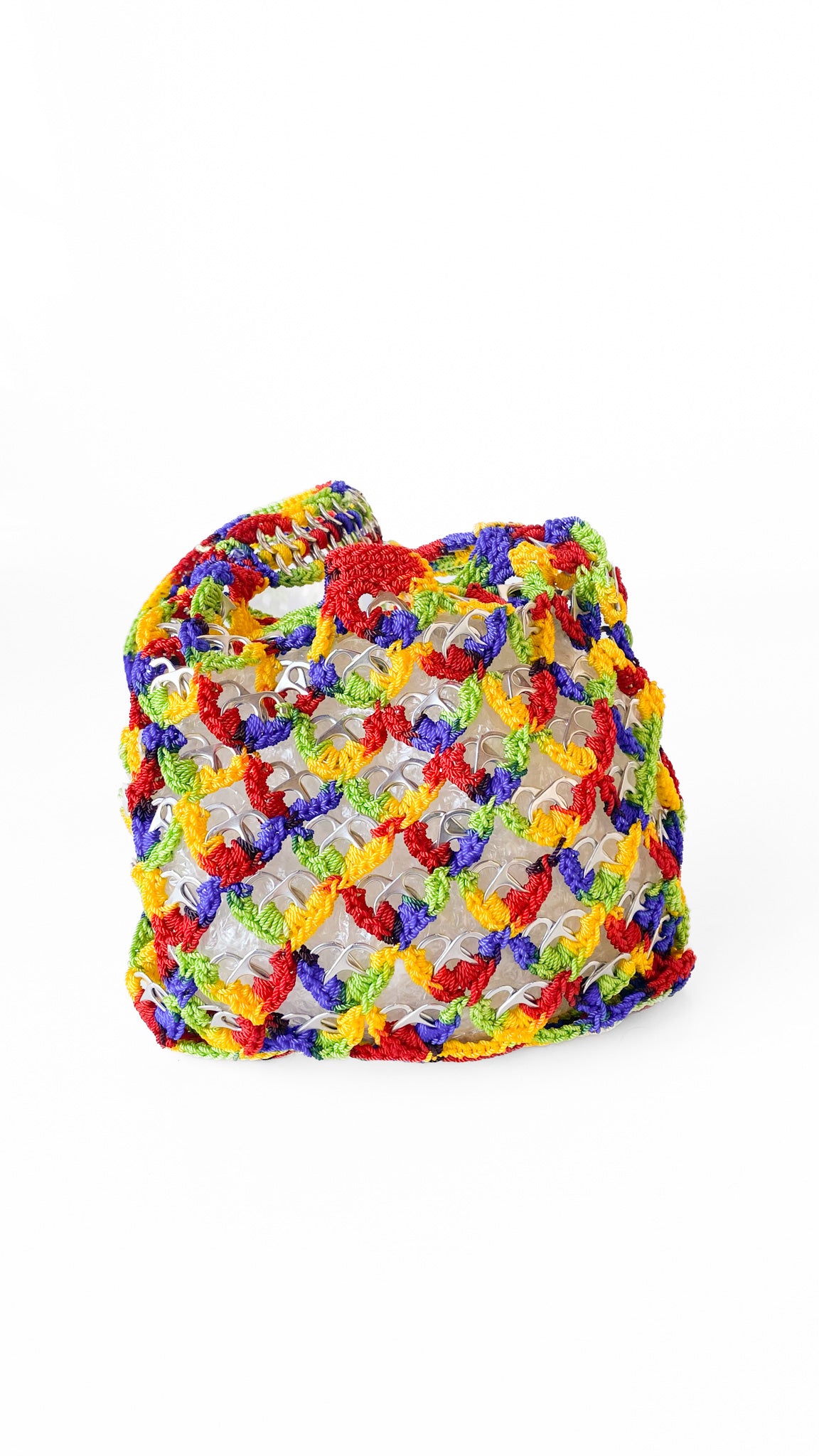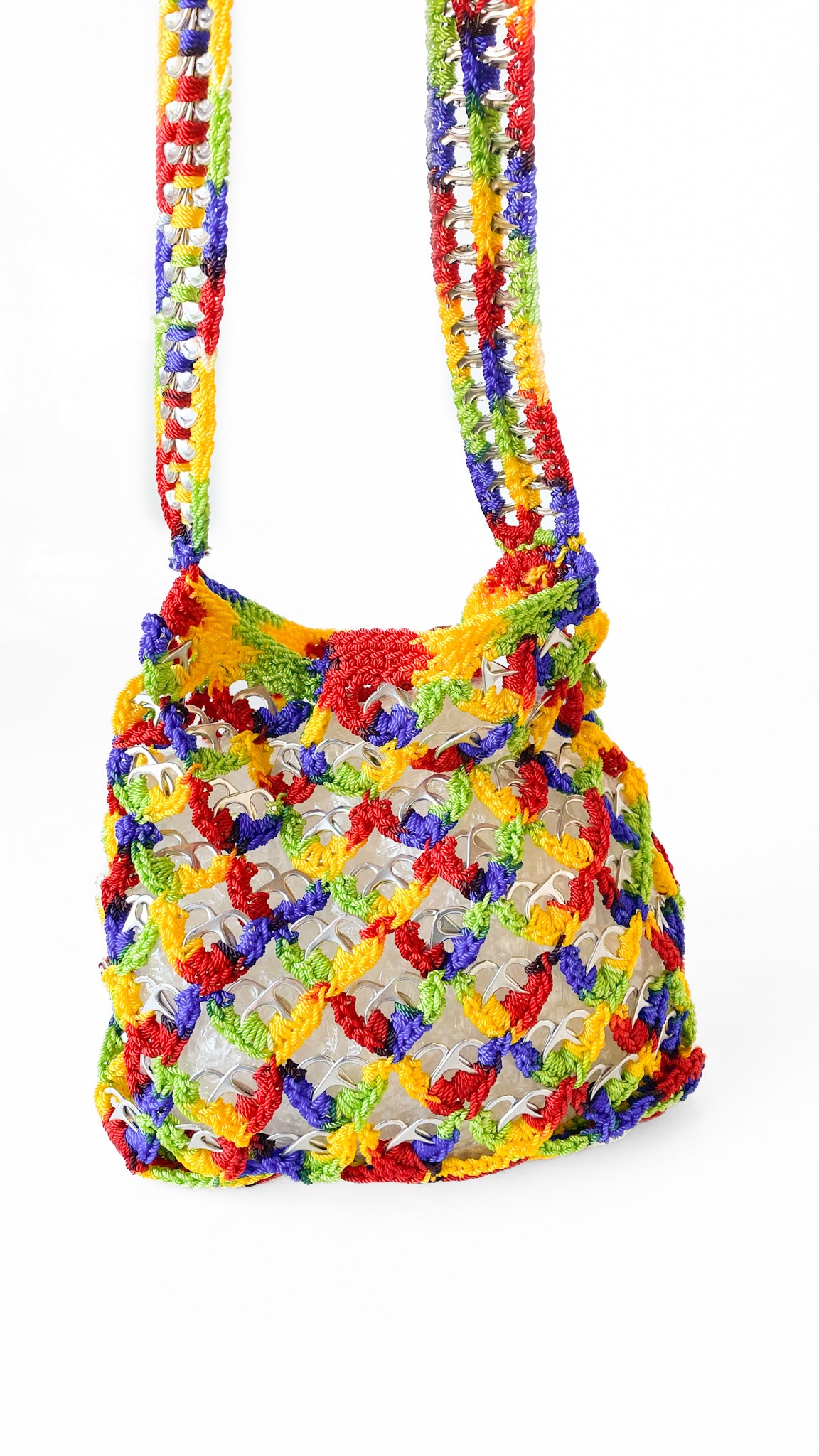 Description: Brightly colored crochet shoulder bag made up of soda can tabs. Unlined, with no closure.