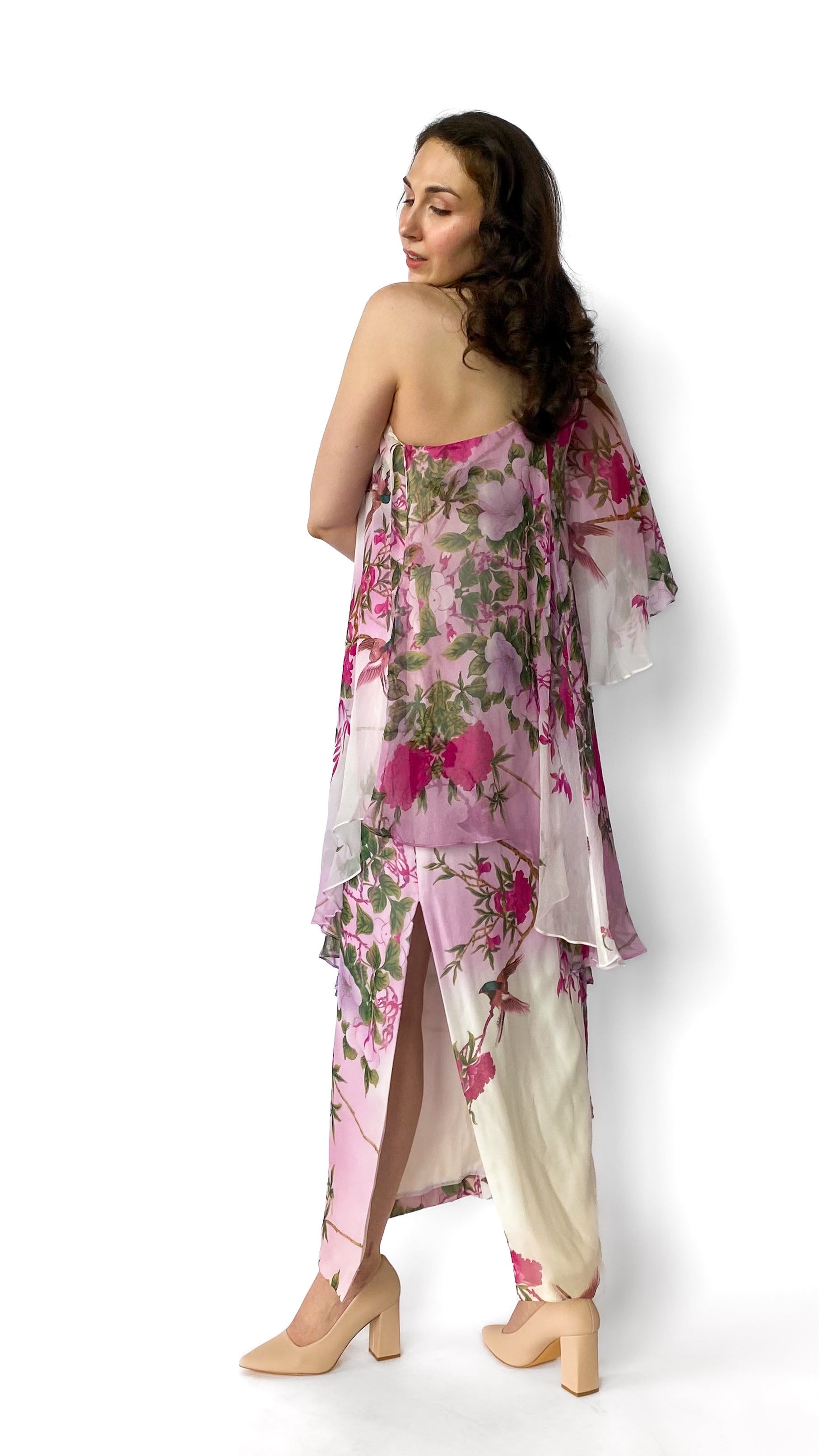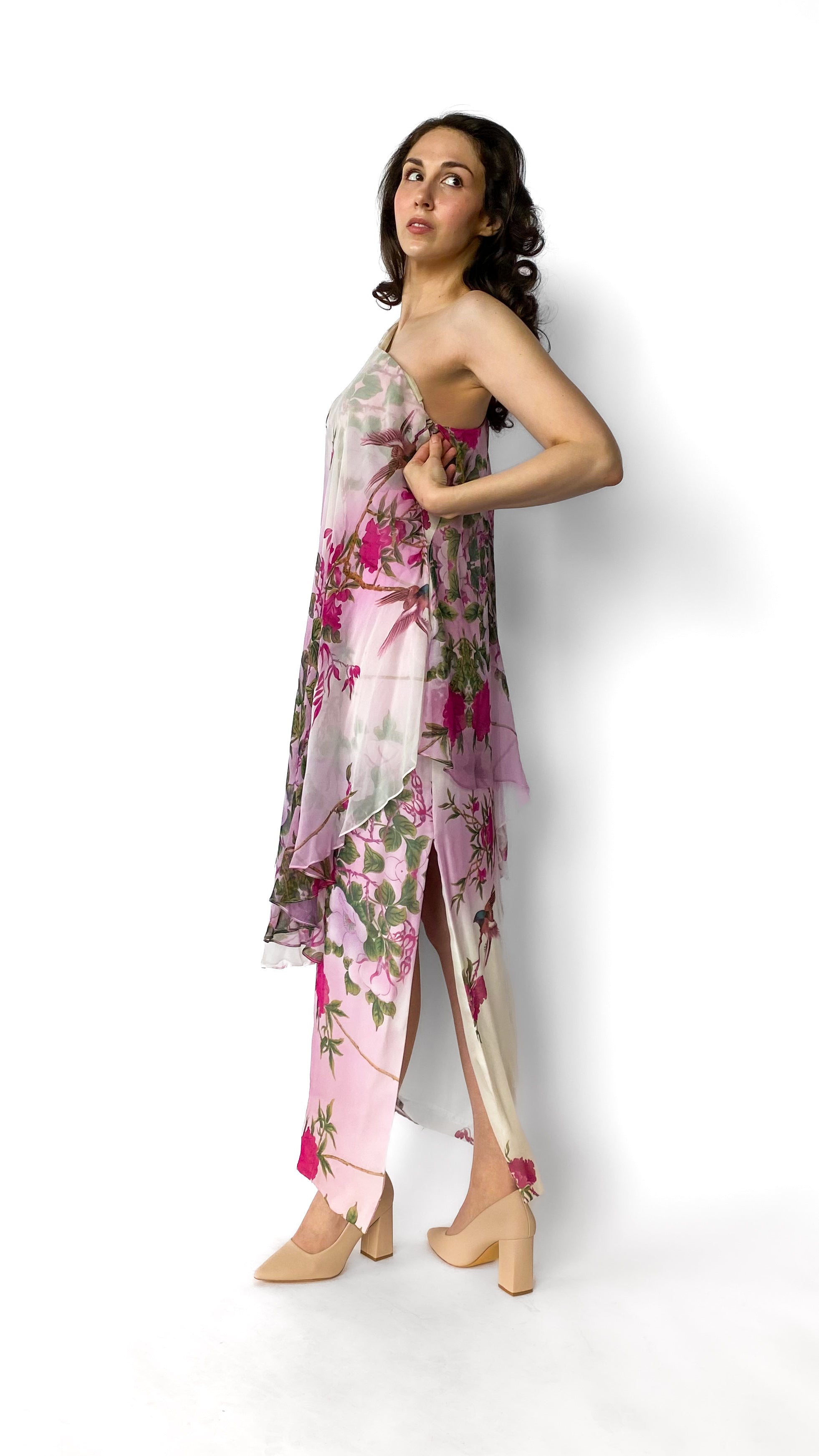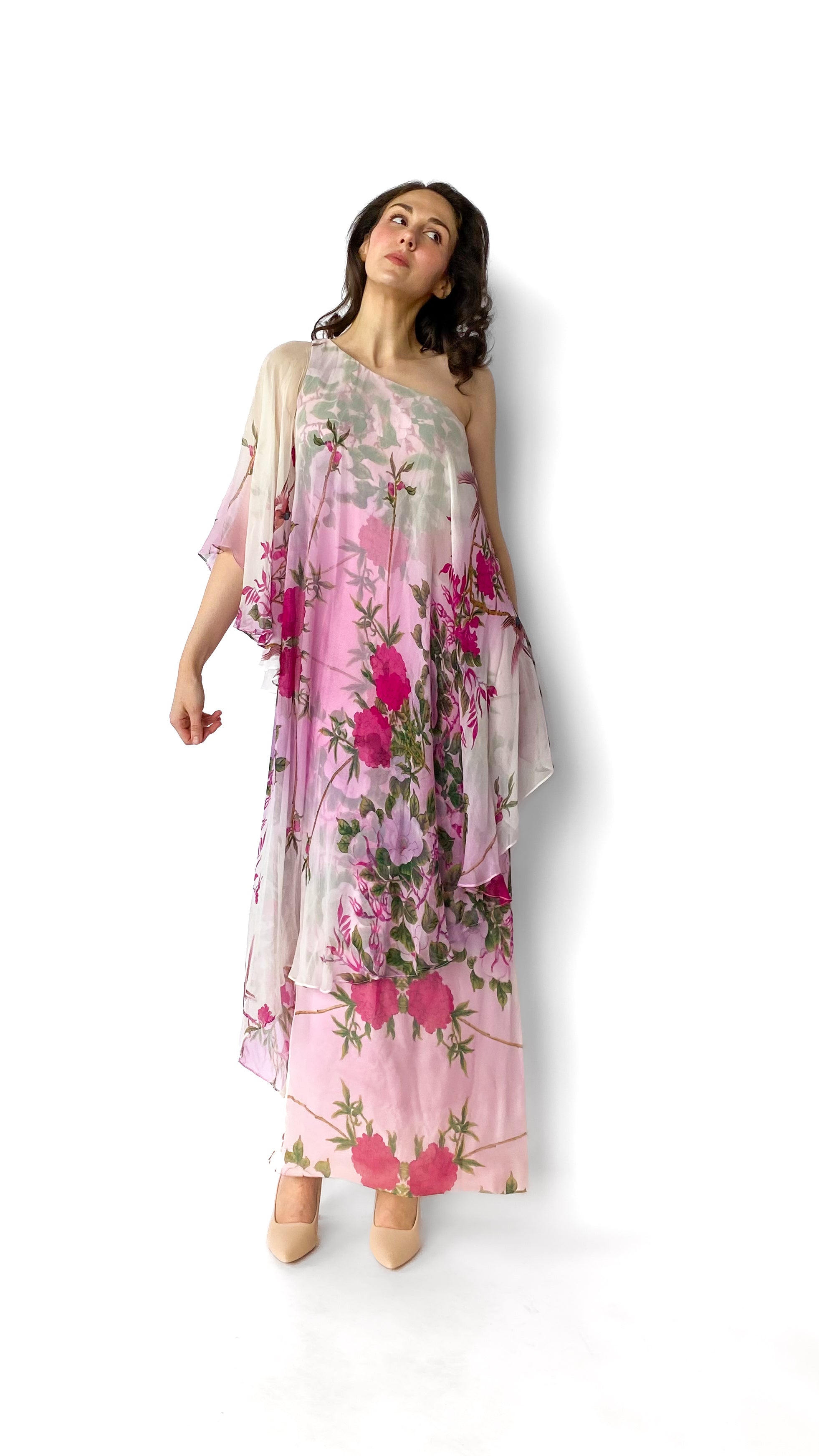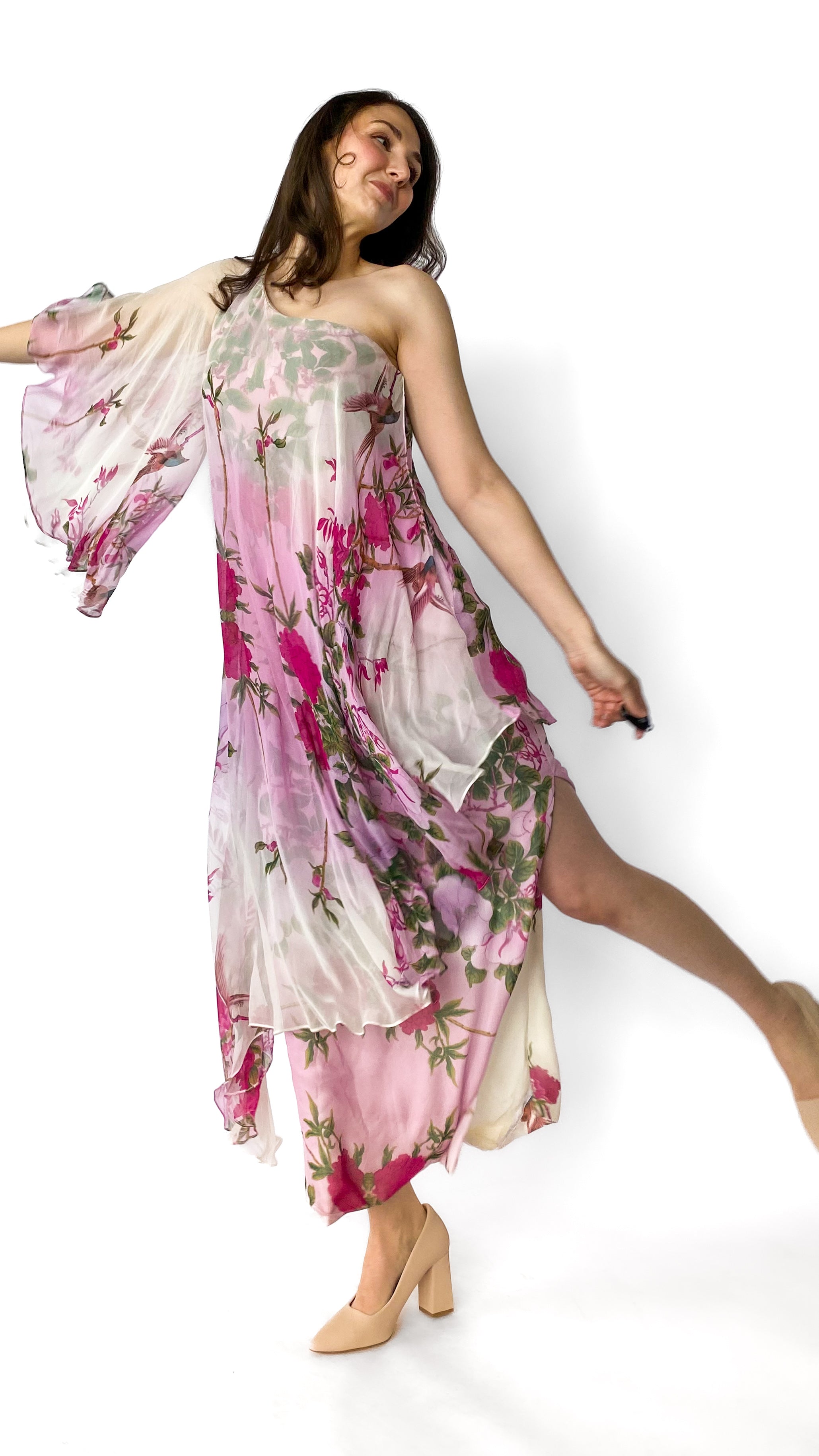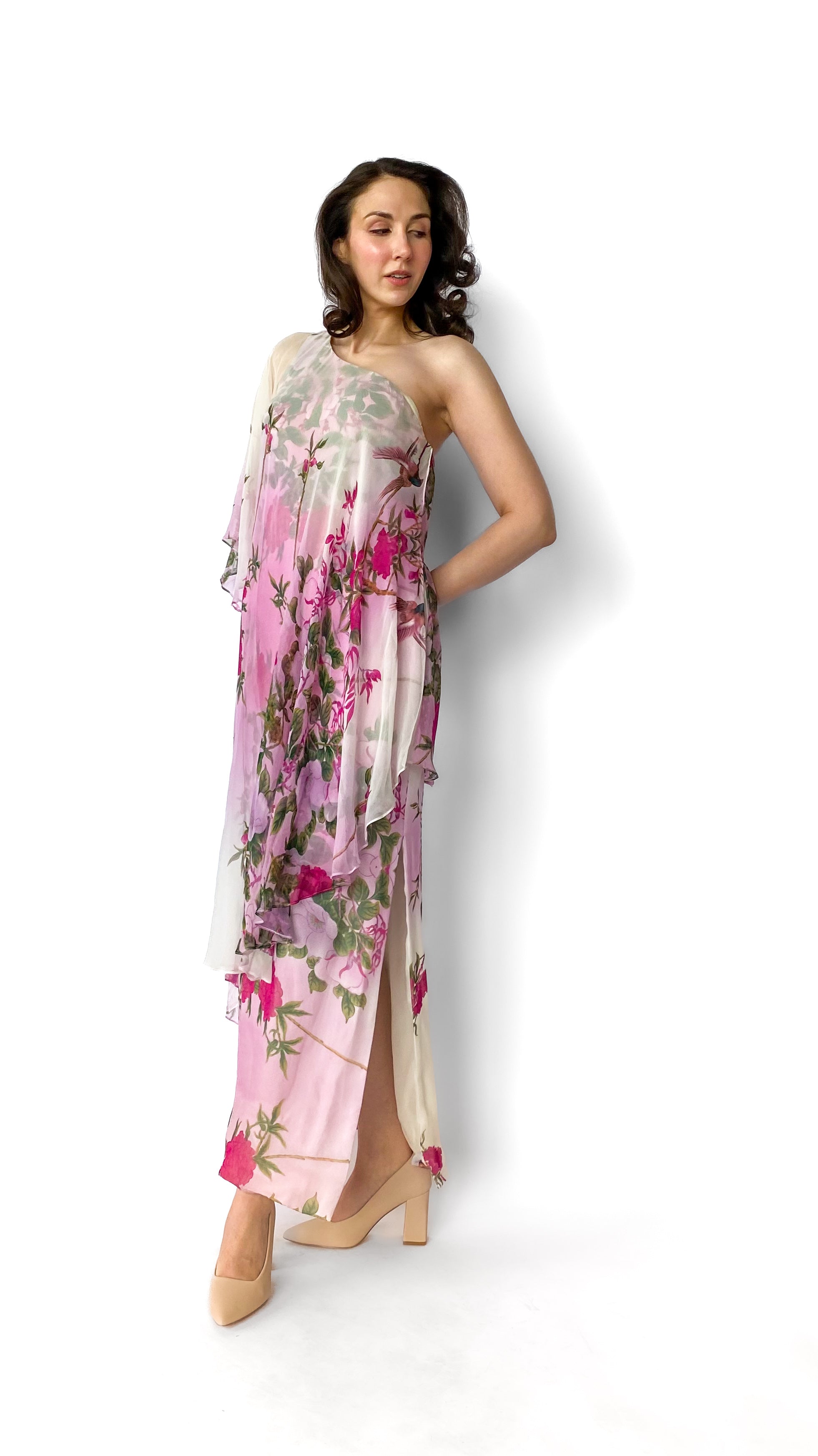 Description: Asymmetrical light pink and white dress with magenta and green floral decals. Dress has one flowy sleeve. There is a zipper on the side and grippy seam lining on top of dress to help keep in place.
