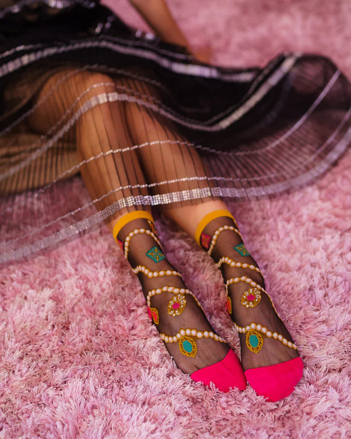 Adorn your feet with luxe pearls and vintage jewels for the holiday season. Set against a black sheer fabric, this is your go-to fancy ankle sock for pairing with dressy heels for an unforgettable holiday look.