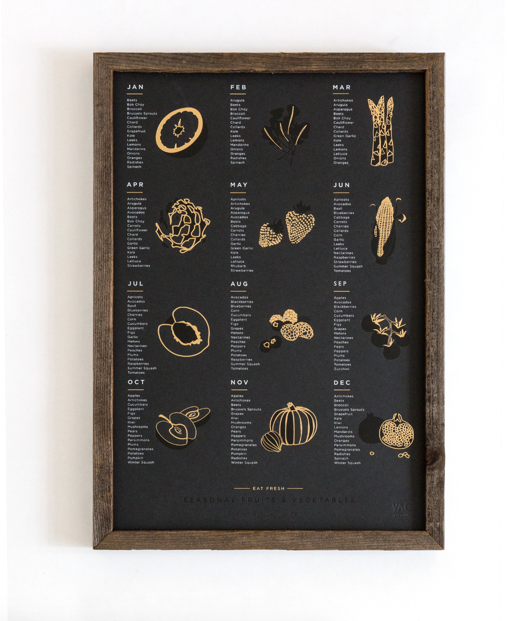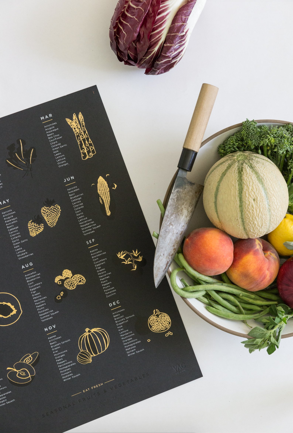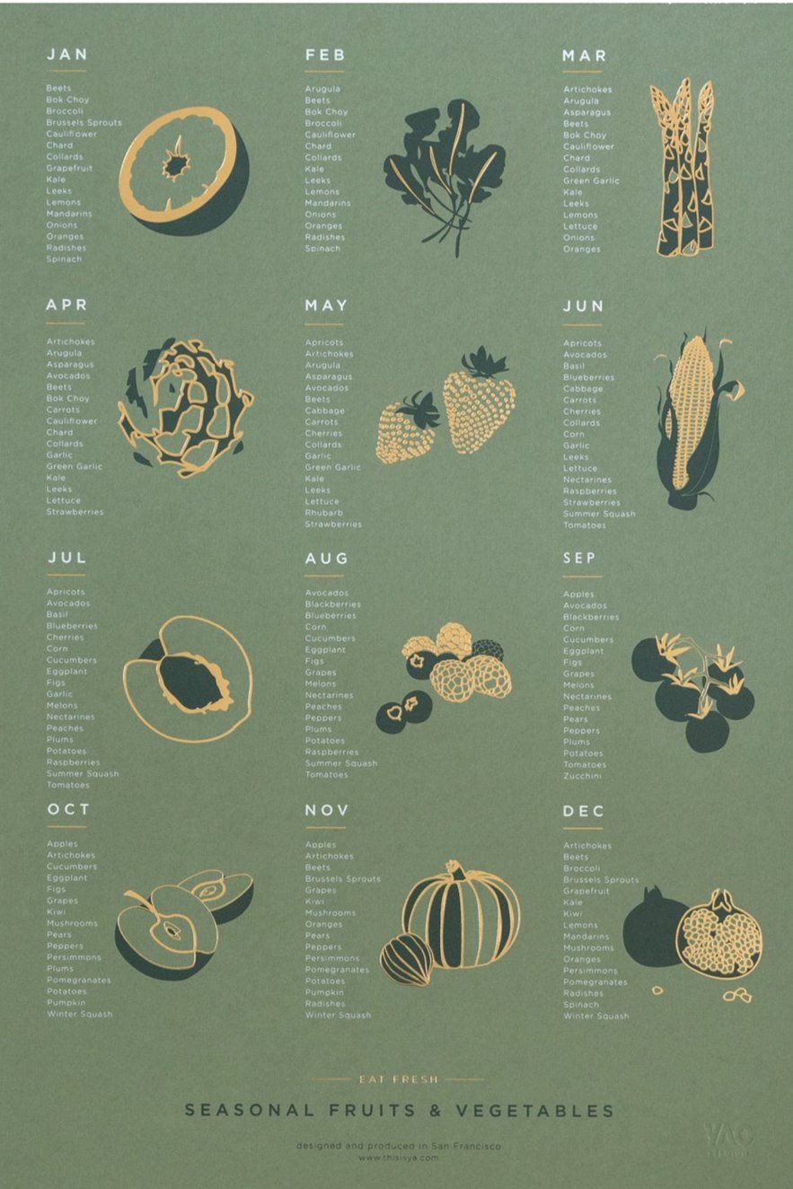 The Seasonal Fruit and Veggie poster provides a detailed list of the fruits and vegetables that are in season each month according to local farmers and seasonal harvest guides based in the Bay Area, and California's West Coast.