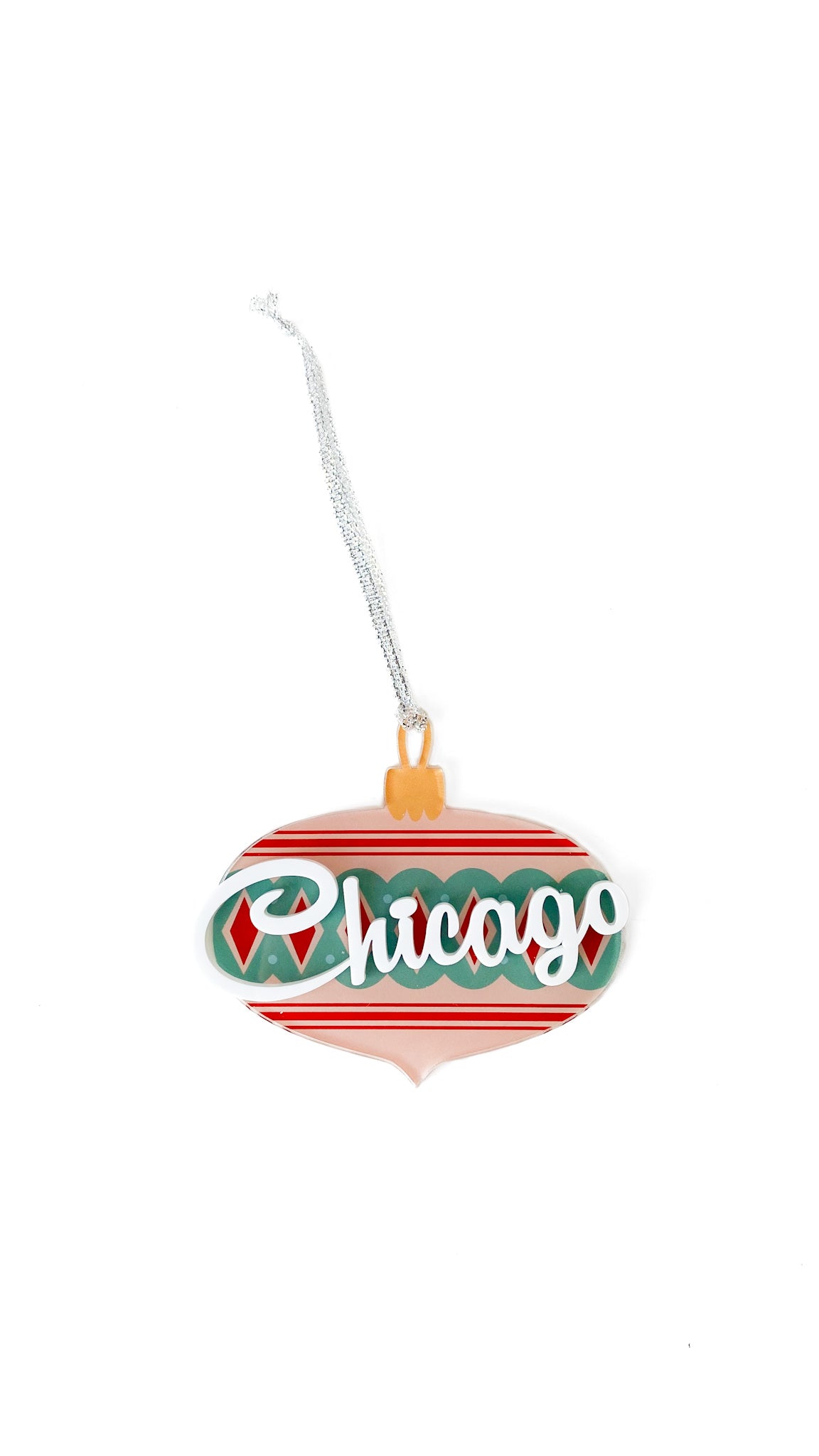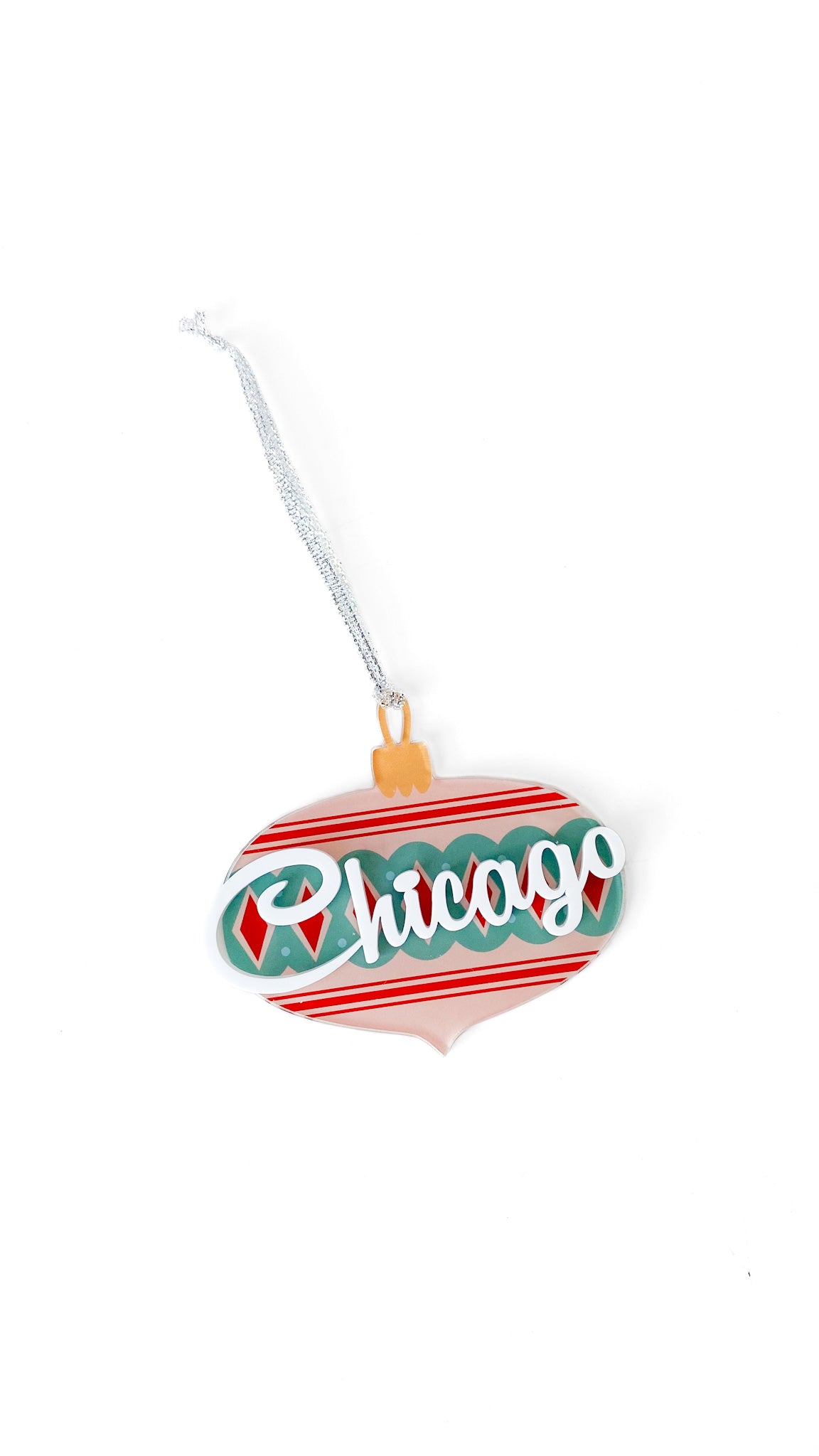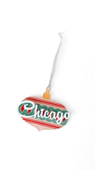 Vintage bauble ornament reading "Chicago" in white script font. Made out of acrylic.