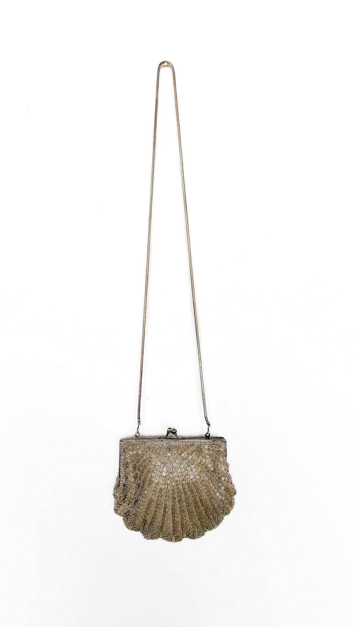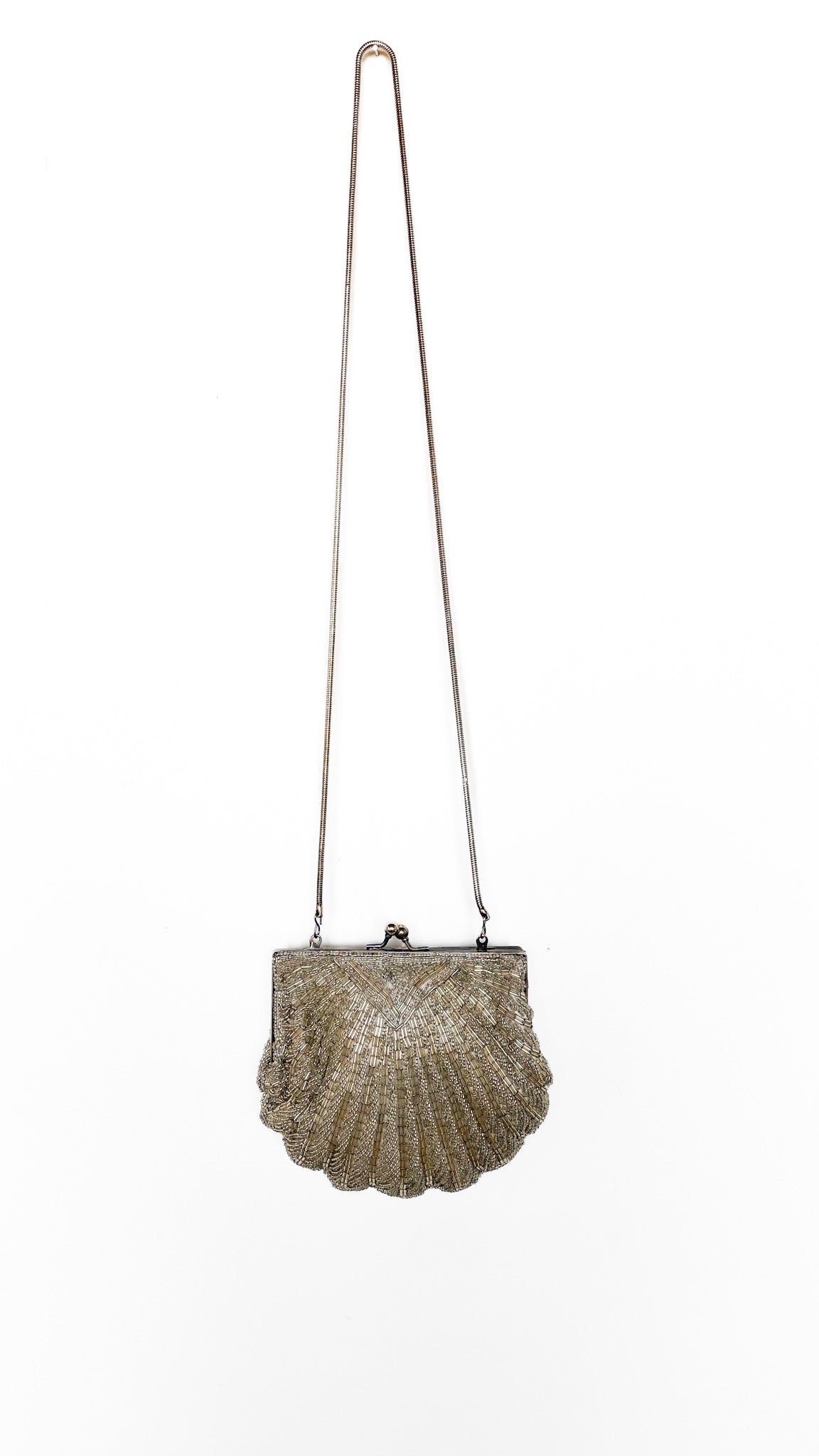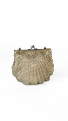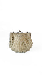 Description: Champagne beaded frame bag in the shape of a shell. Has silver tone hardware & kiss lock clasp closure. Interior is lined. Has silver chain shoulder strap.