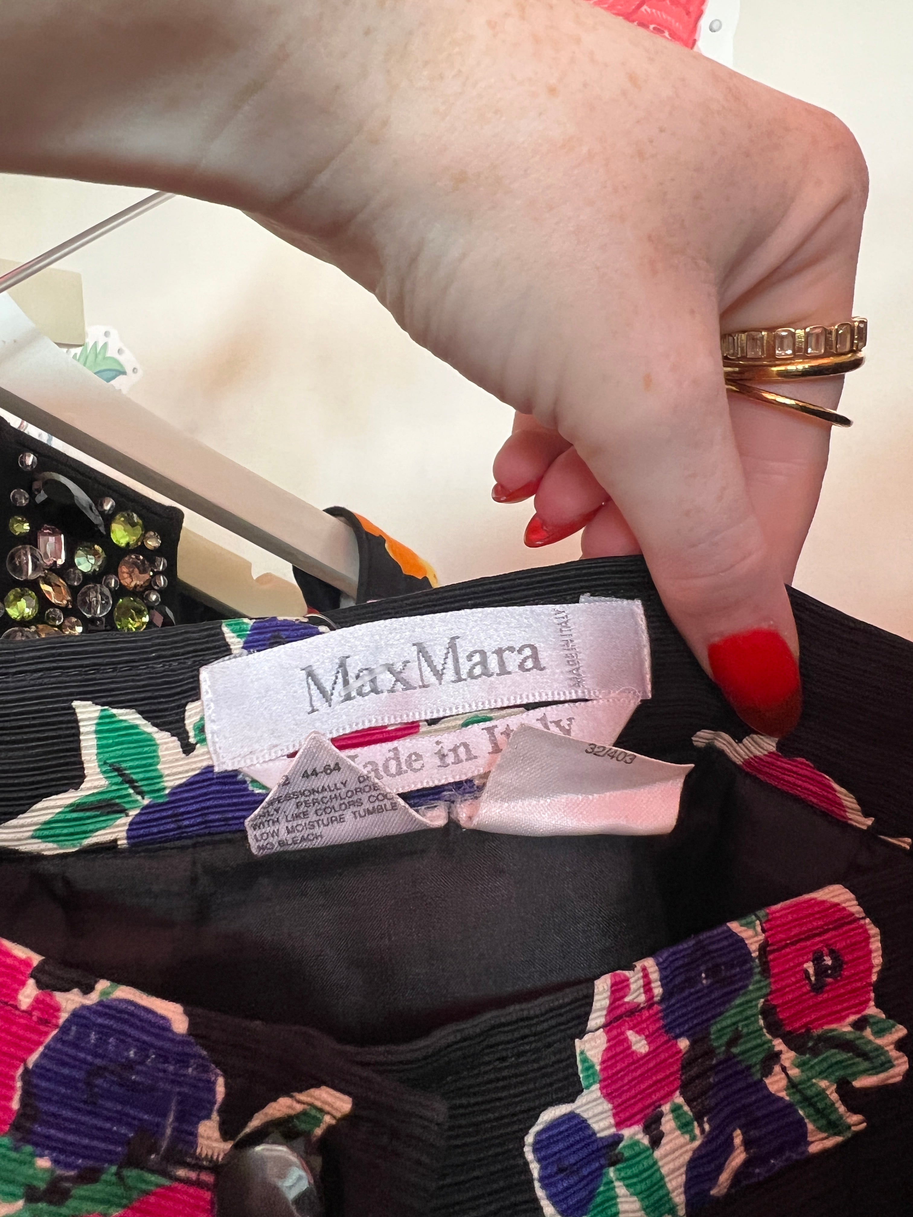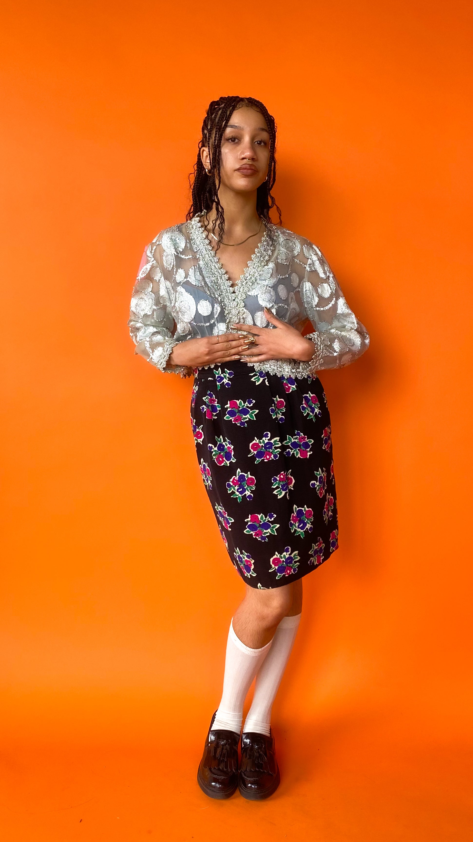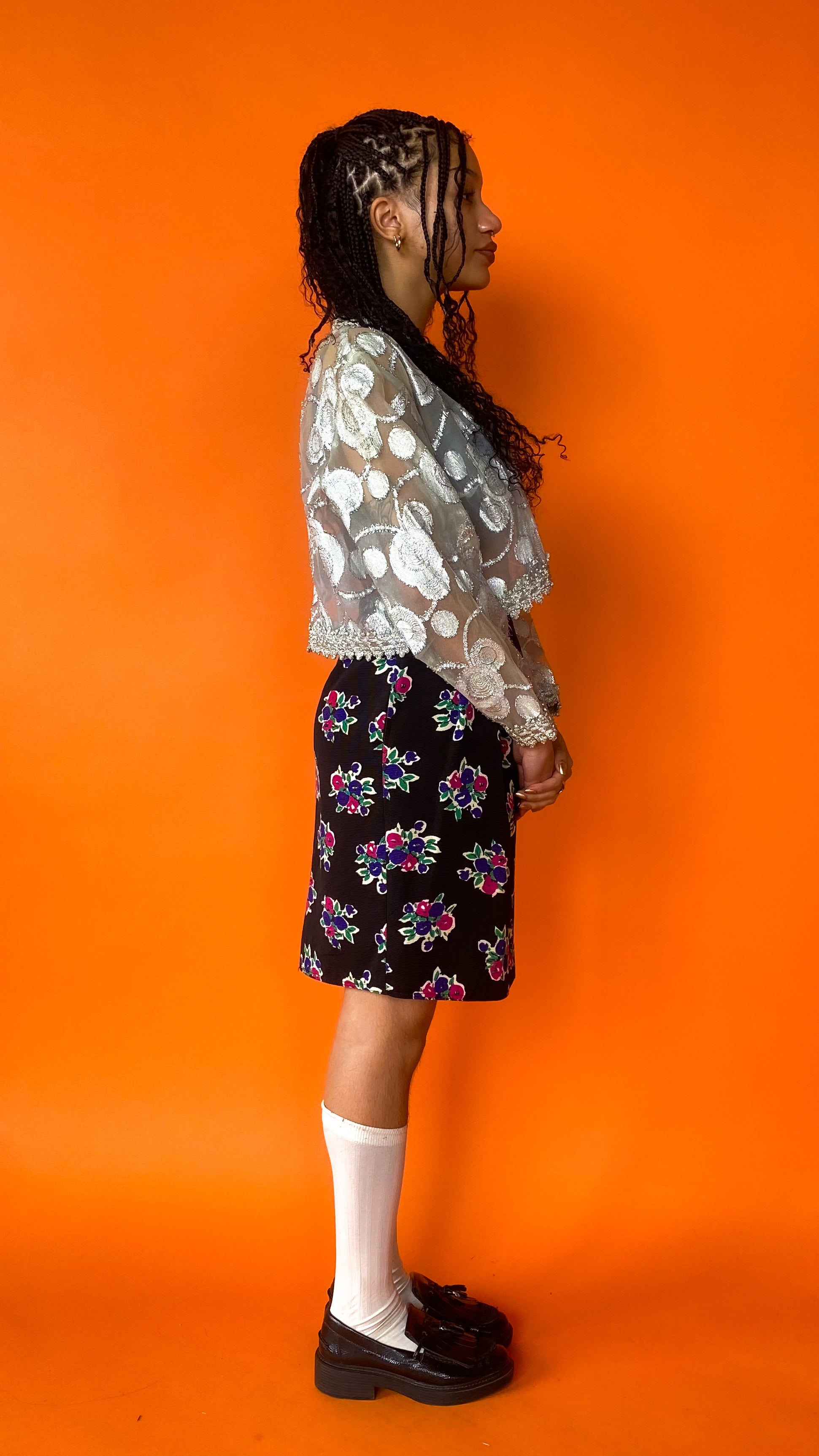 Description: Black floral pencil skirt in woven ridged fabric. Has side hip pockets & zipper fly closure at front. Skirt is fully lined. Has no stretch.