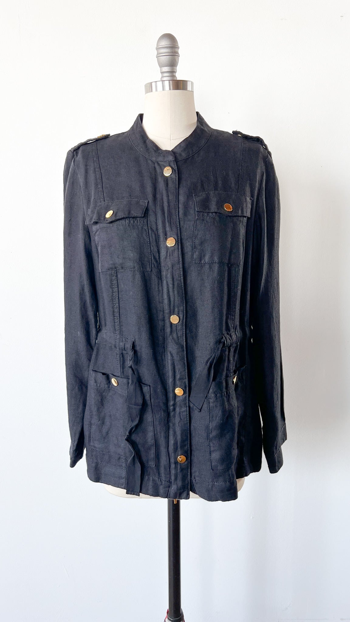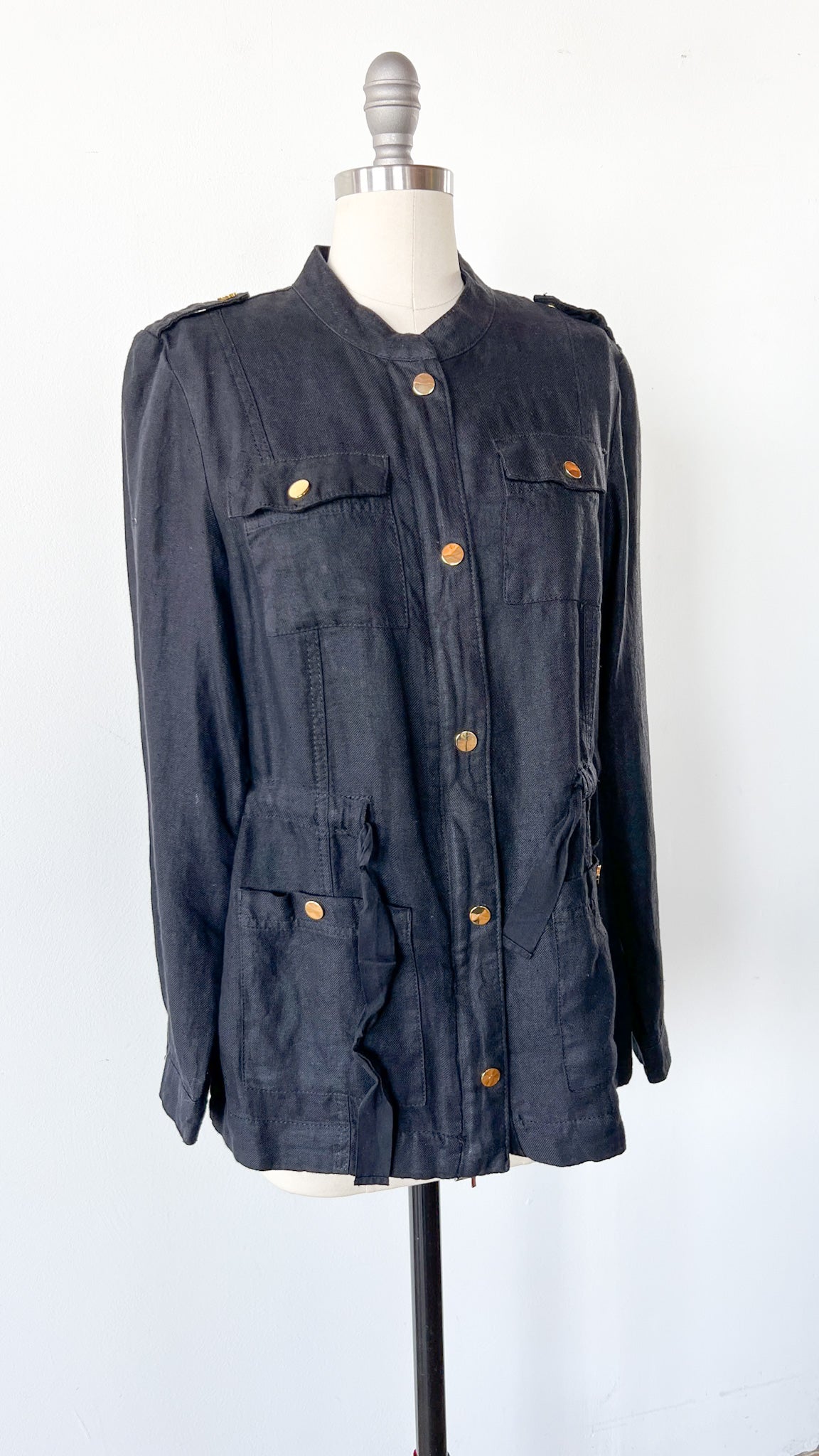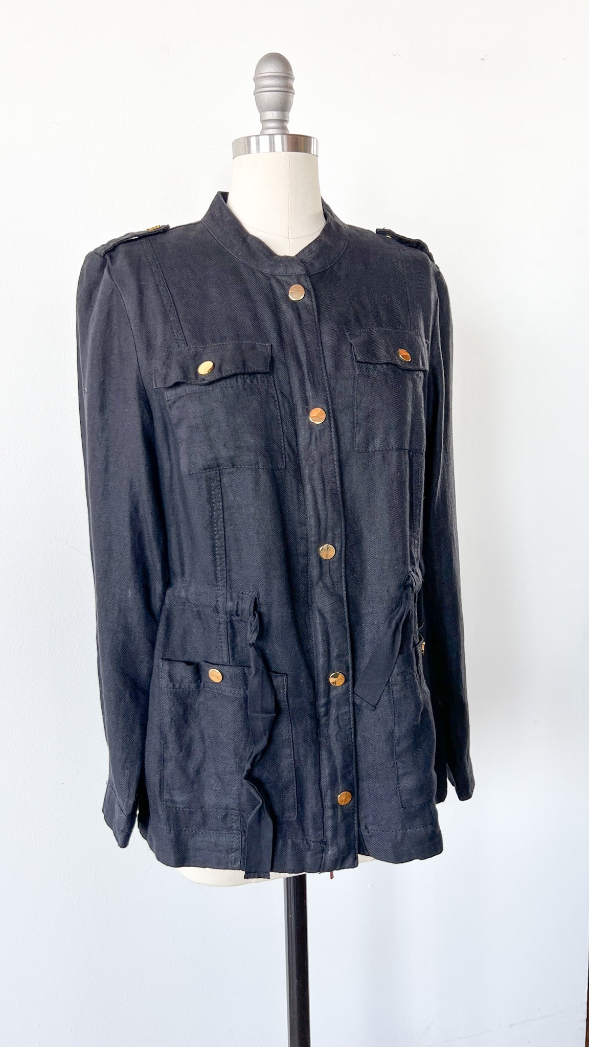 Description: Lightweight black utility jacket with gold hardware. Drawstring waist and four functional pockets.