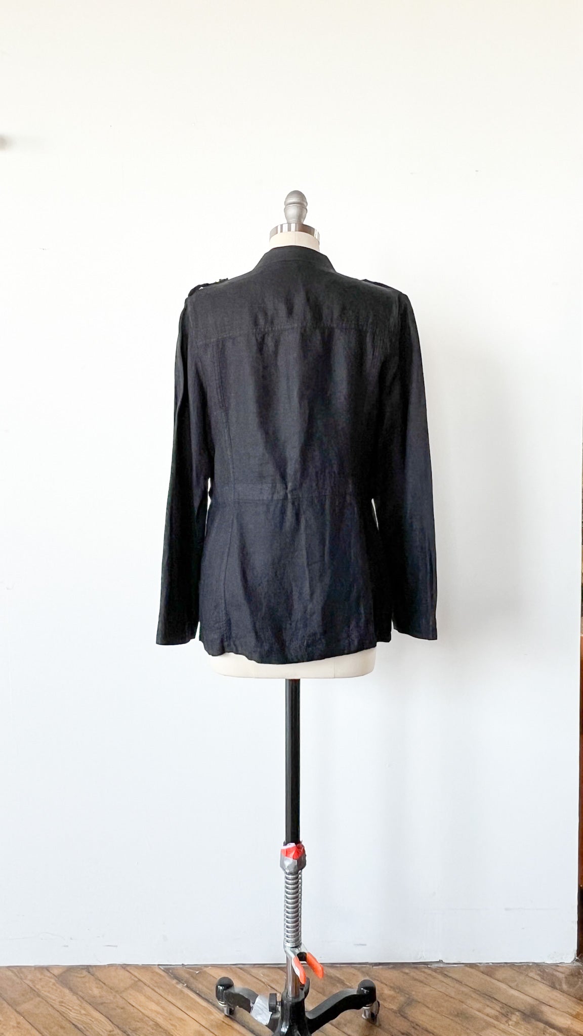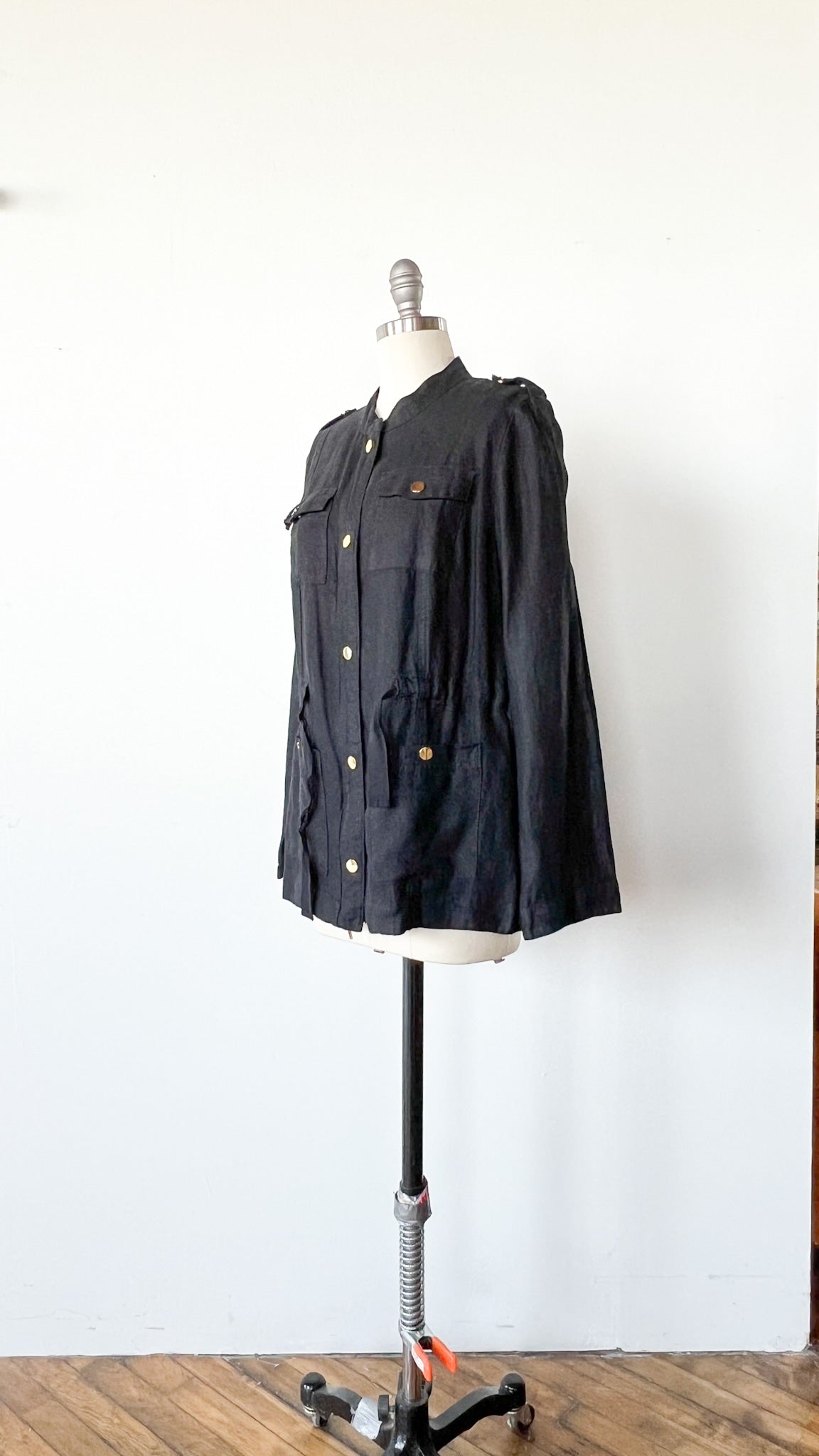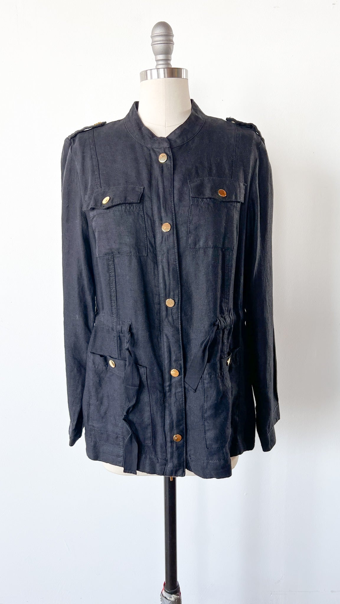 Description: Lightweight black utility jacket with gold hardware. Drawstring waist and four functional pockets.