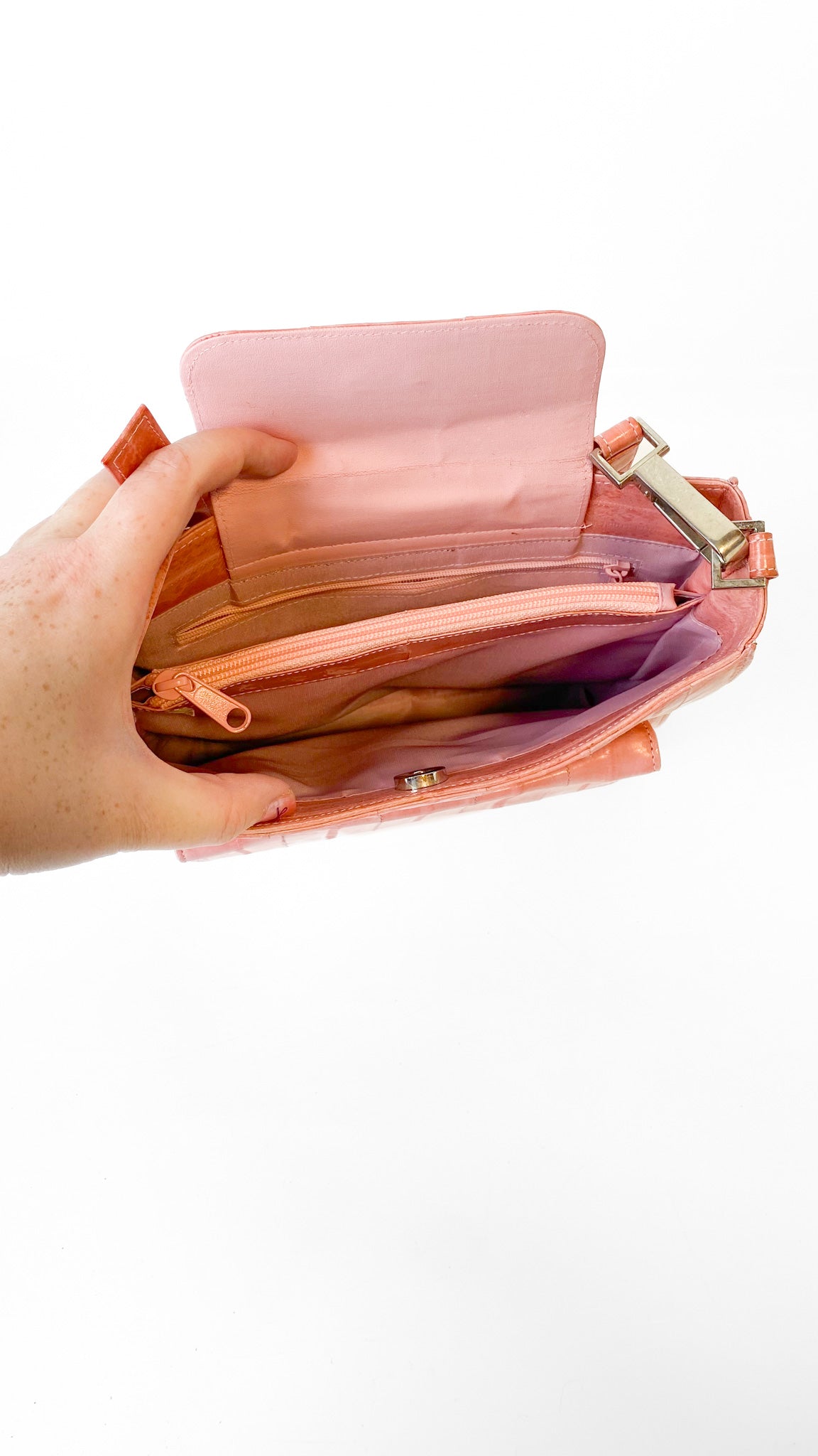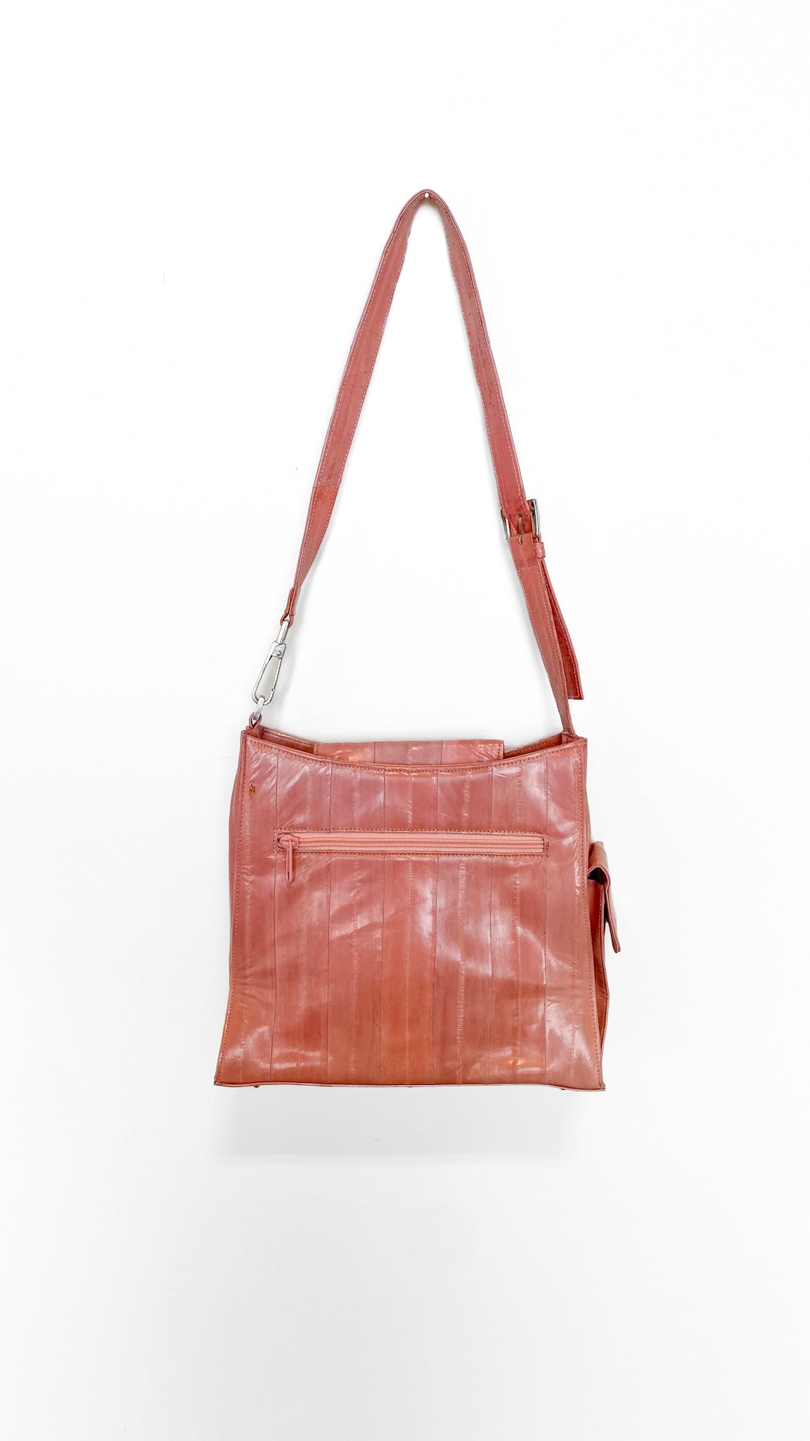 Description: Bubblegum pink shoulder bag with cargo-style pockets. One zipper pocket, one exterior magnetic snap pocket, one exterior skinny side pocket with a snap closure. Body of purse has a magnetic snap closure, two interior zipper pockets. Adjustable shoulder strap.