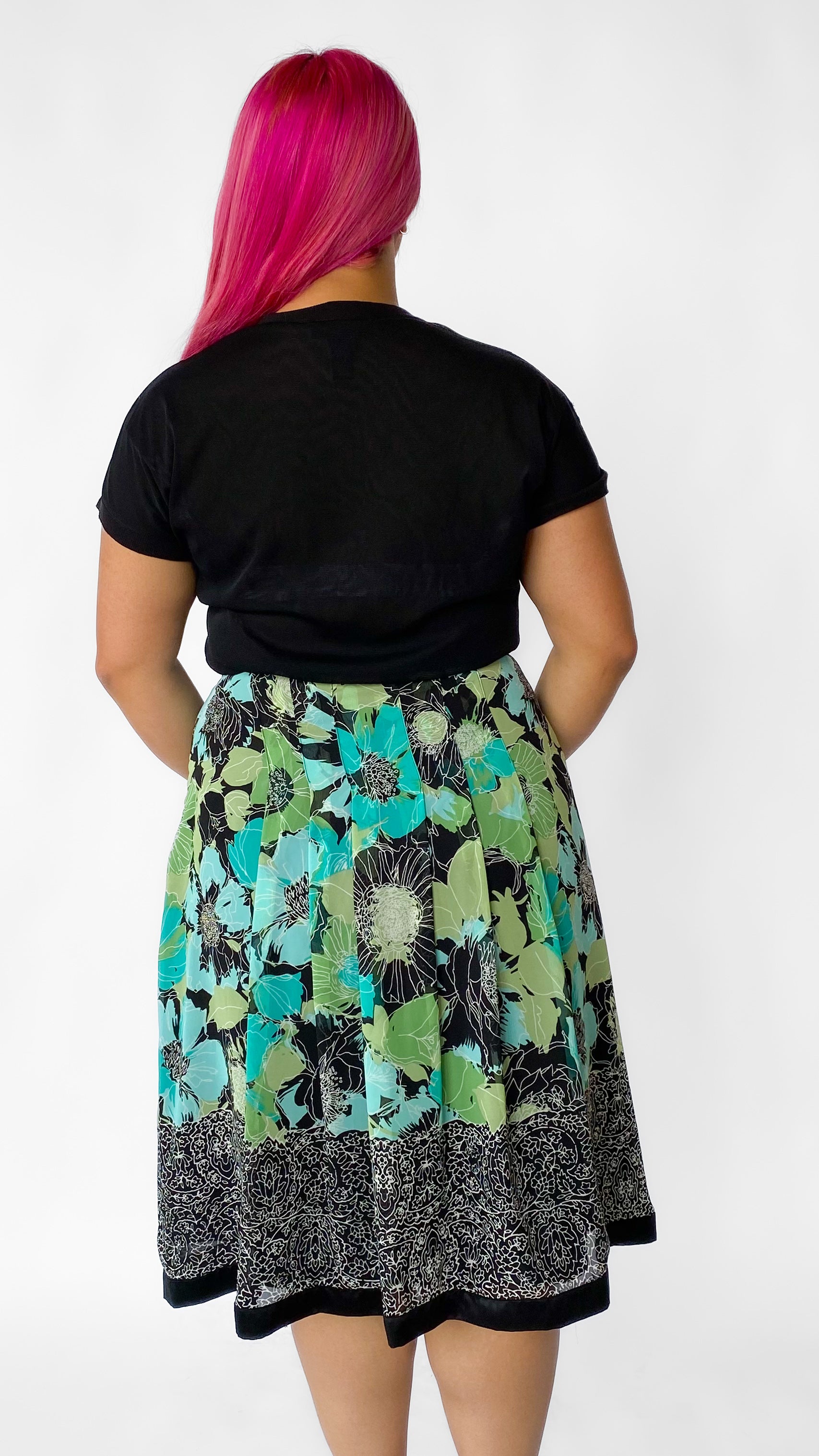 Pleated skirt featuring an elegant abstract floral pattern in shades of blue, green, black, and white. Its delicate pleats offer graceful movement and a flattering silhouette. Satin bias tape at the hem with a side invisible zipper and hook and eye closure.