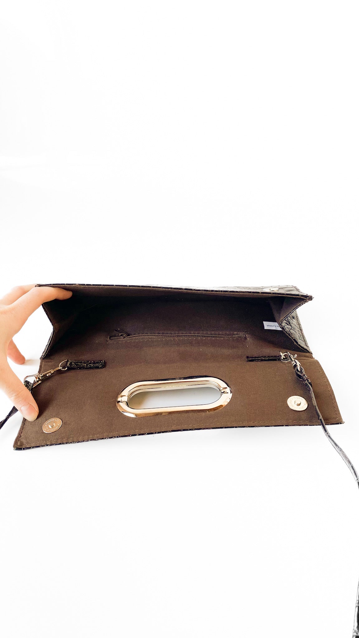 Description: Deep brown faux crocodile printed clutch; can be converted into a shoulder bag. Has flap closure & magnetic snap clasps, with silver tone hardware. Interior is lined, with zippered pocket.