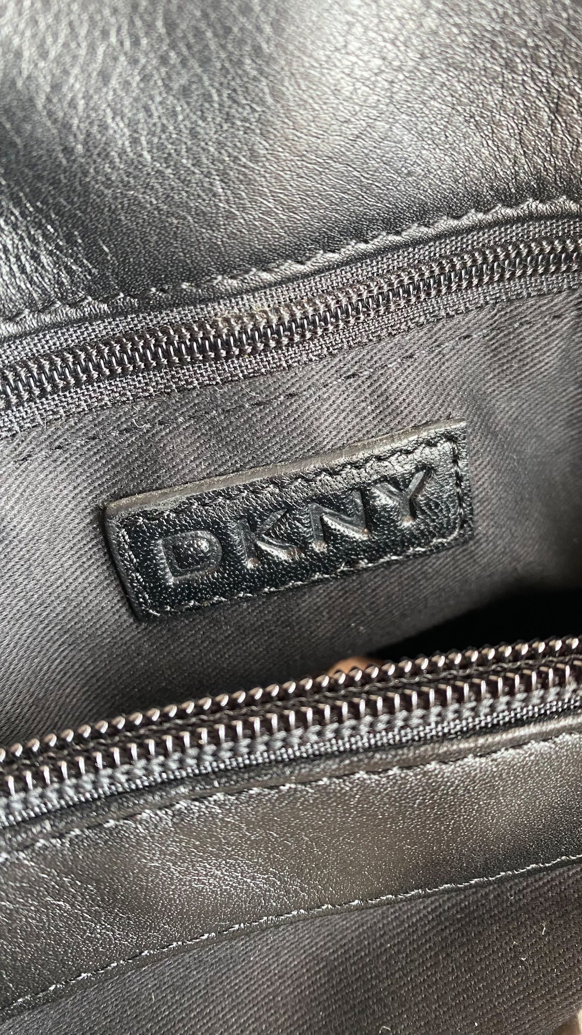 Description: Black leather DNKY shoulder bag. Two shoulder straps. Silver hardware at the base of the straps. Two pouch pockets on outside. Two zipper pockets inside.