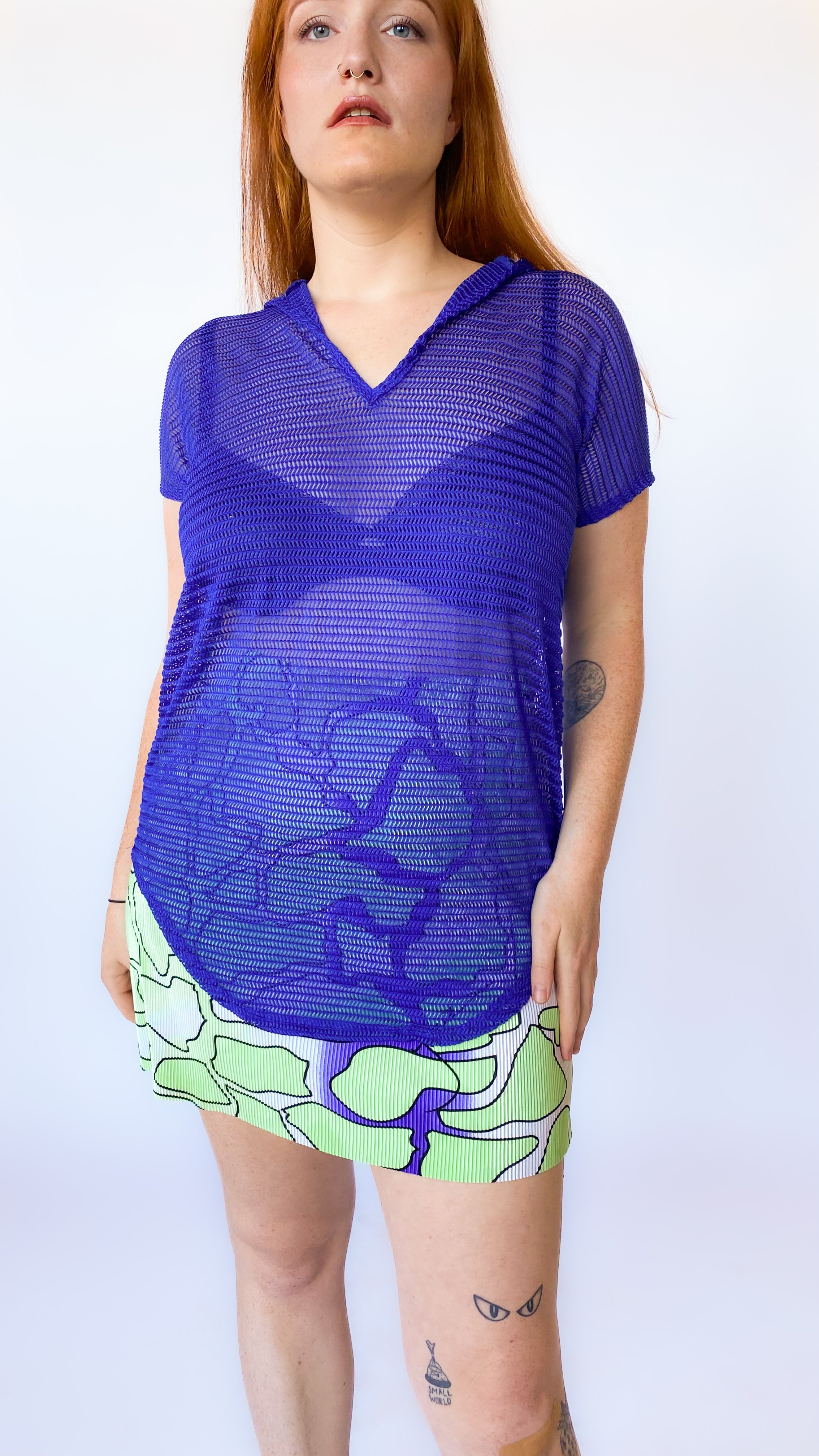 Description: Royal blue mesh shirt with hood. Has no closure. Fits sizes extra large to 4XL, depending on desired fit.