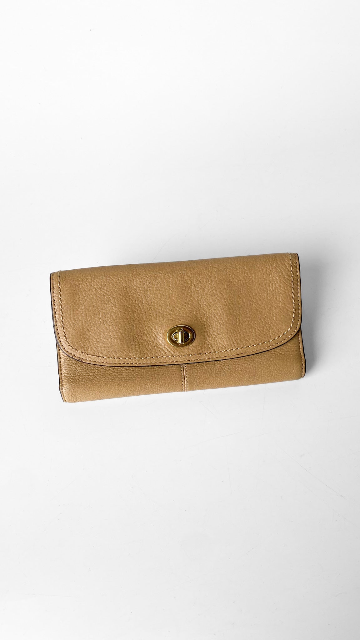 Description: Tan Coach tri-fold wallet with classic Coach turn lock closure. One exterior zipper pocket, three interior cash pockets, 13 card slots.