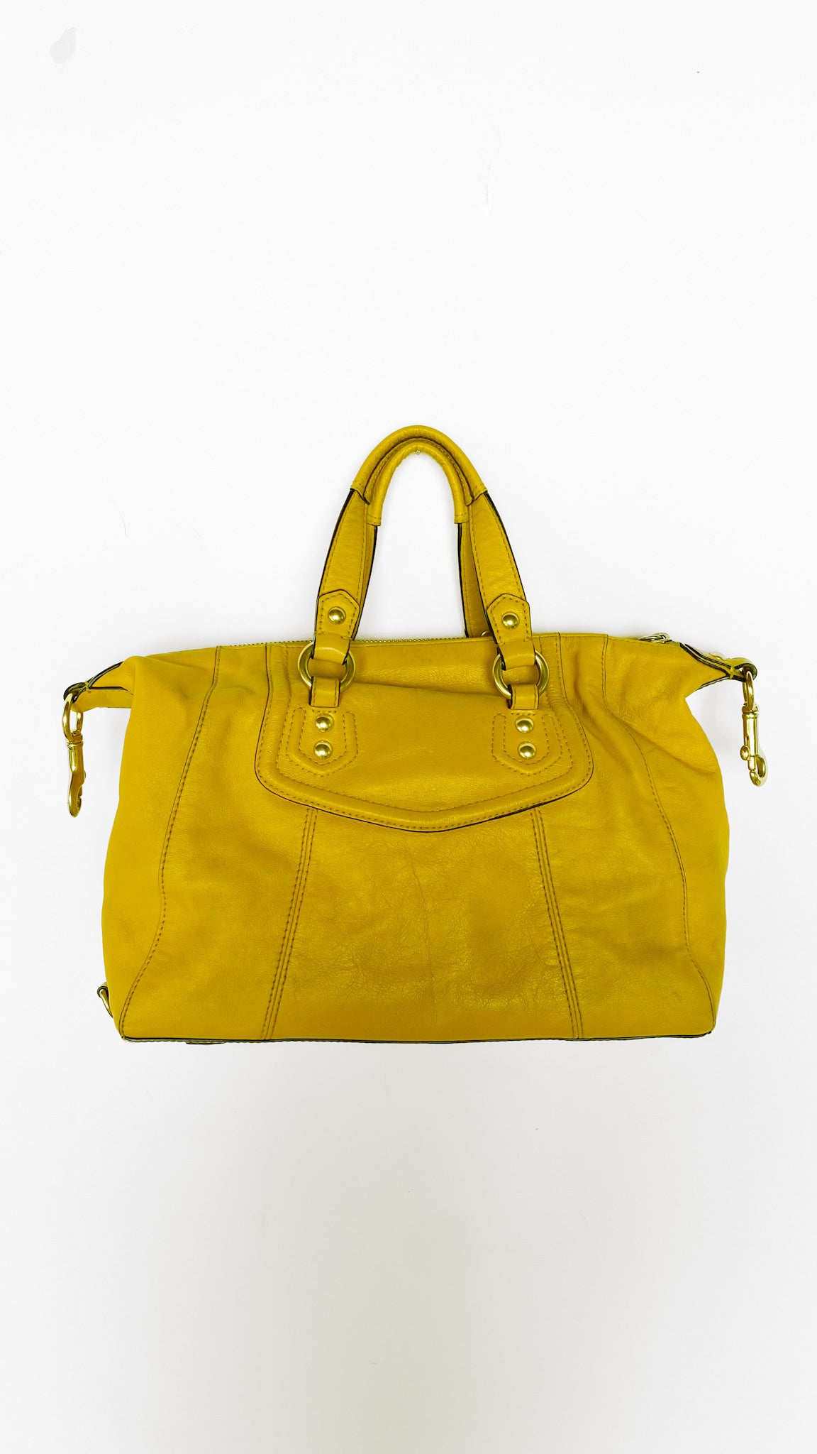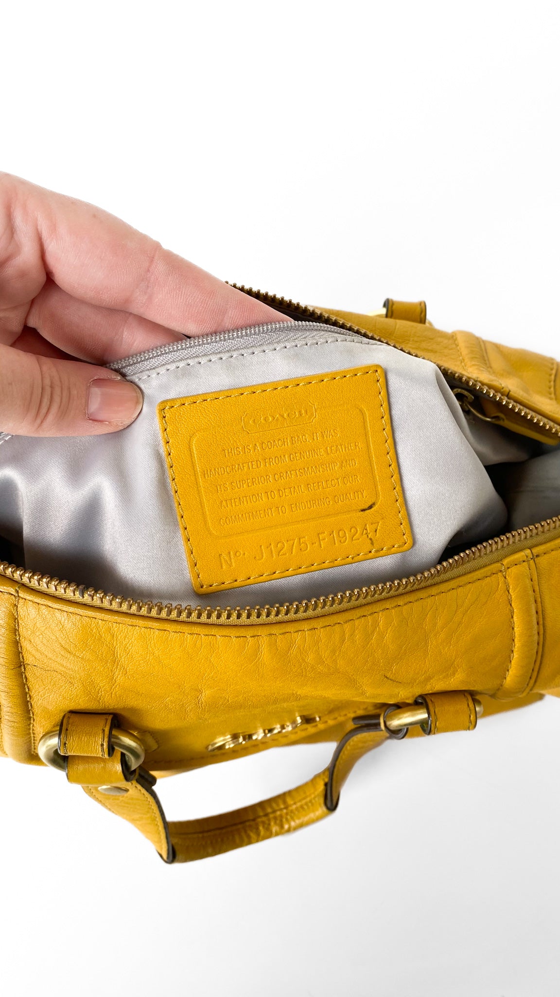 Description: 2012 Mustard yellow Coach Ashley Satchel hand bag with zipper closure, fabric lining, three interior pockets, lobster claws for shoulder strap (strap not included). Coach leather keychain tag.
